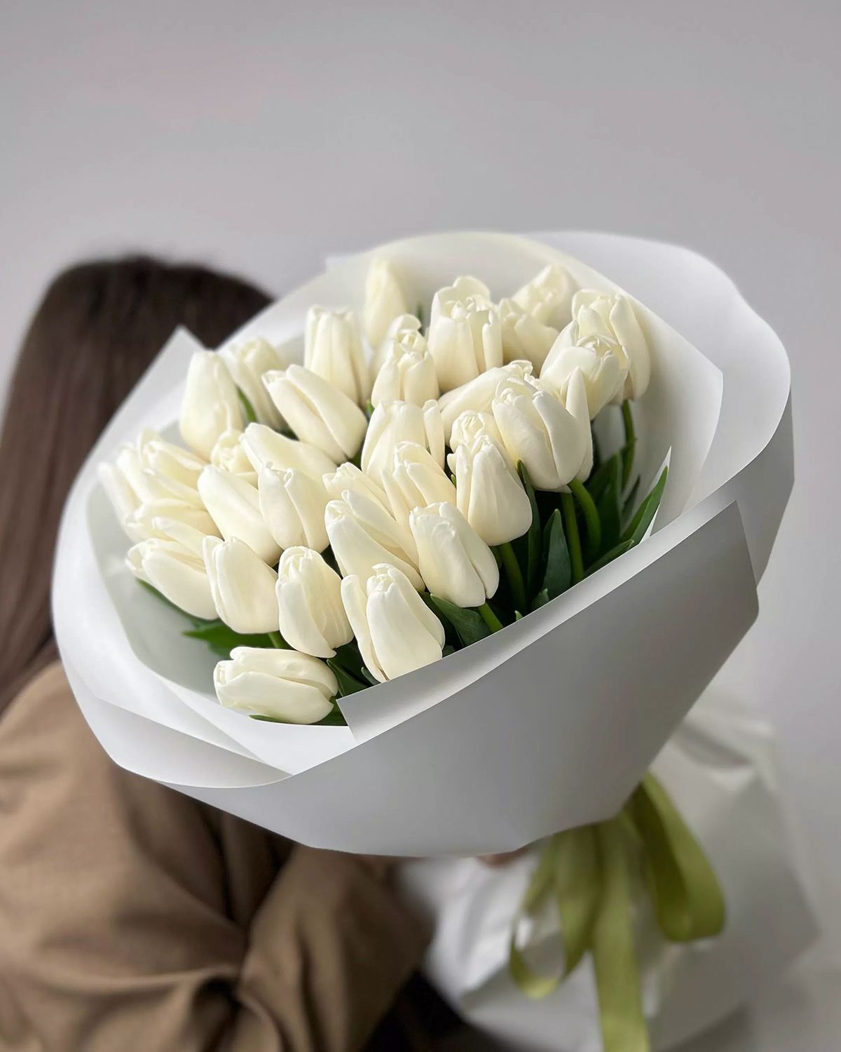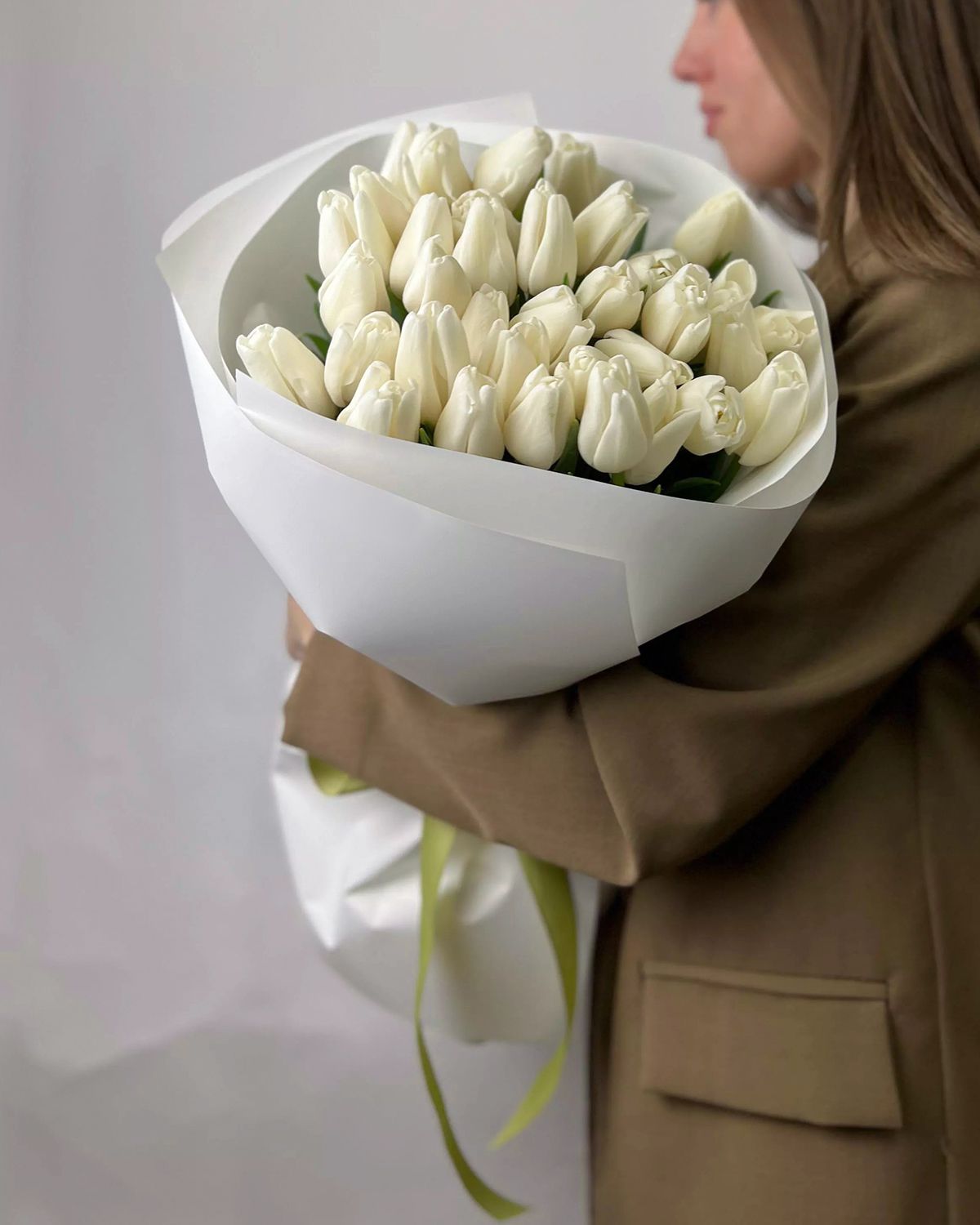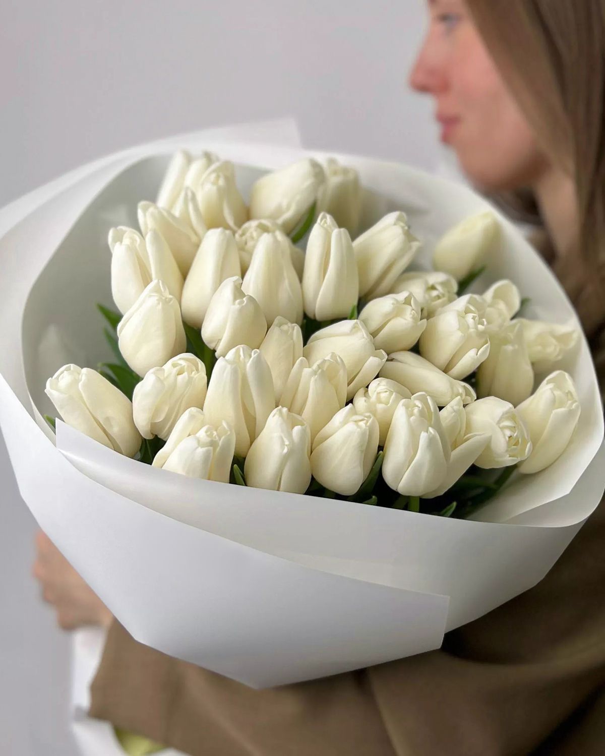 Состав: Тюльпан обычный White - 35 шт, Тишью белая, Матовая пленка белая кругом