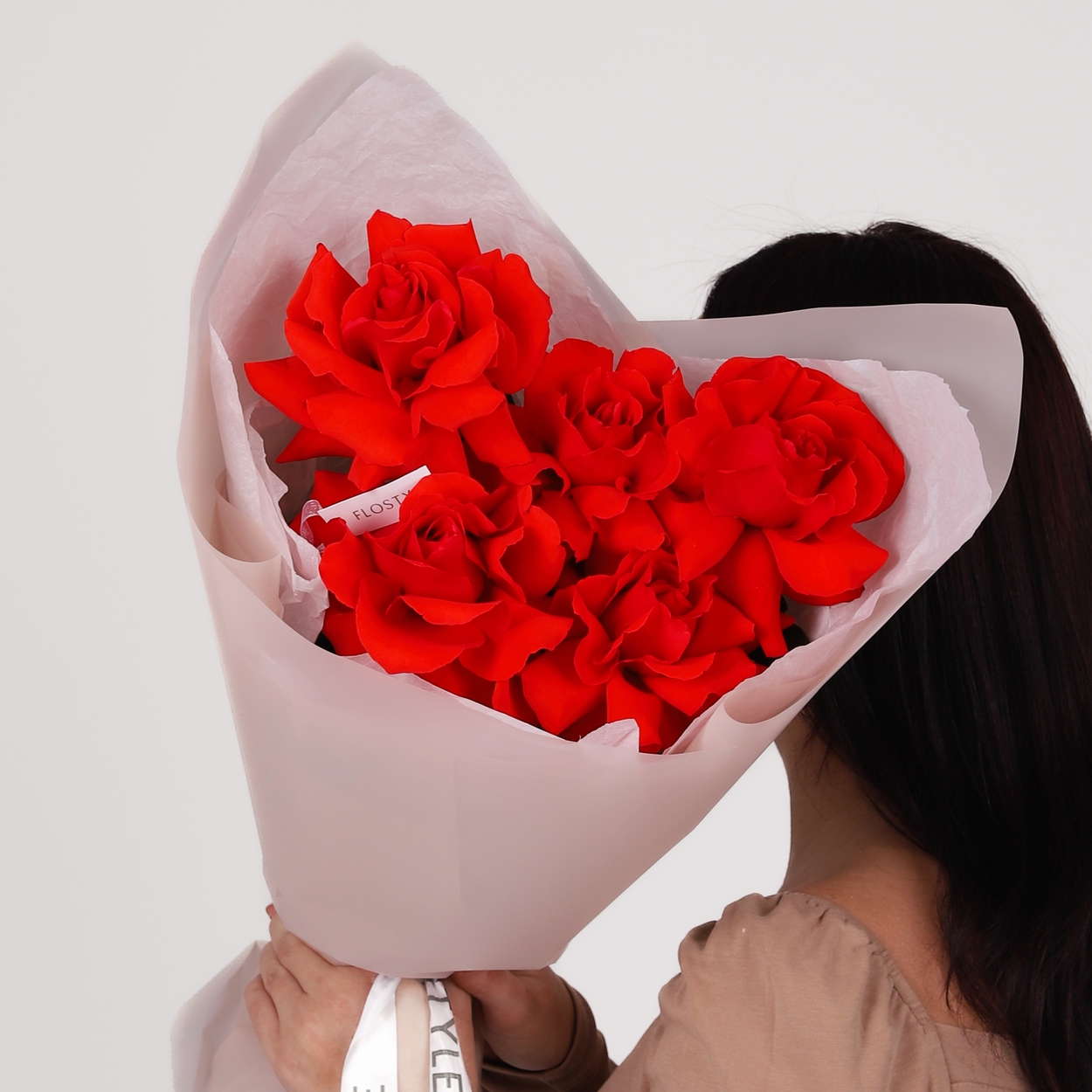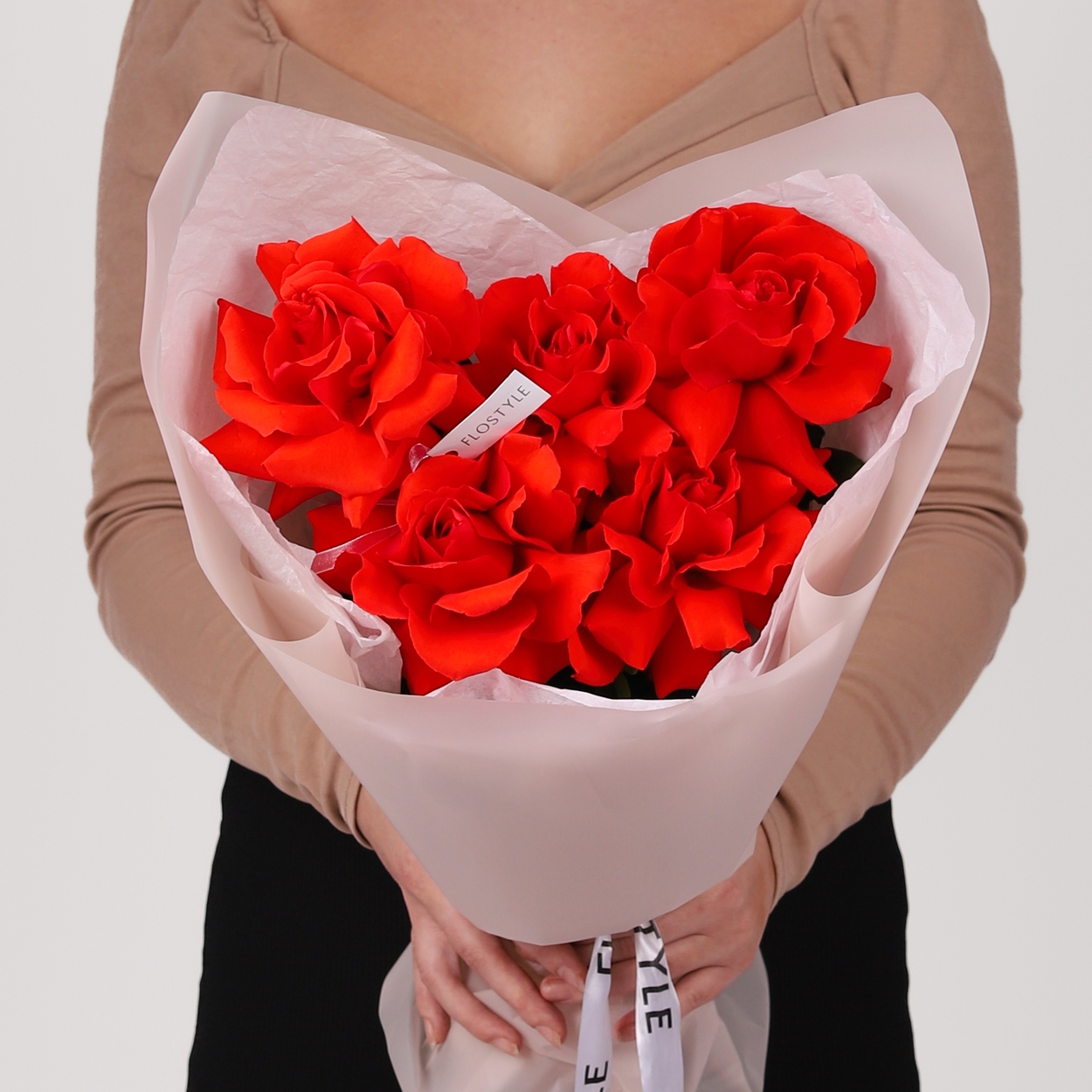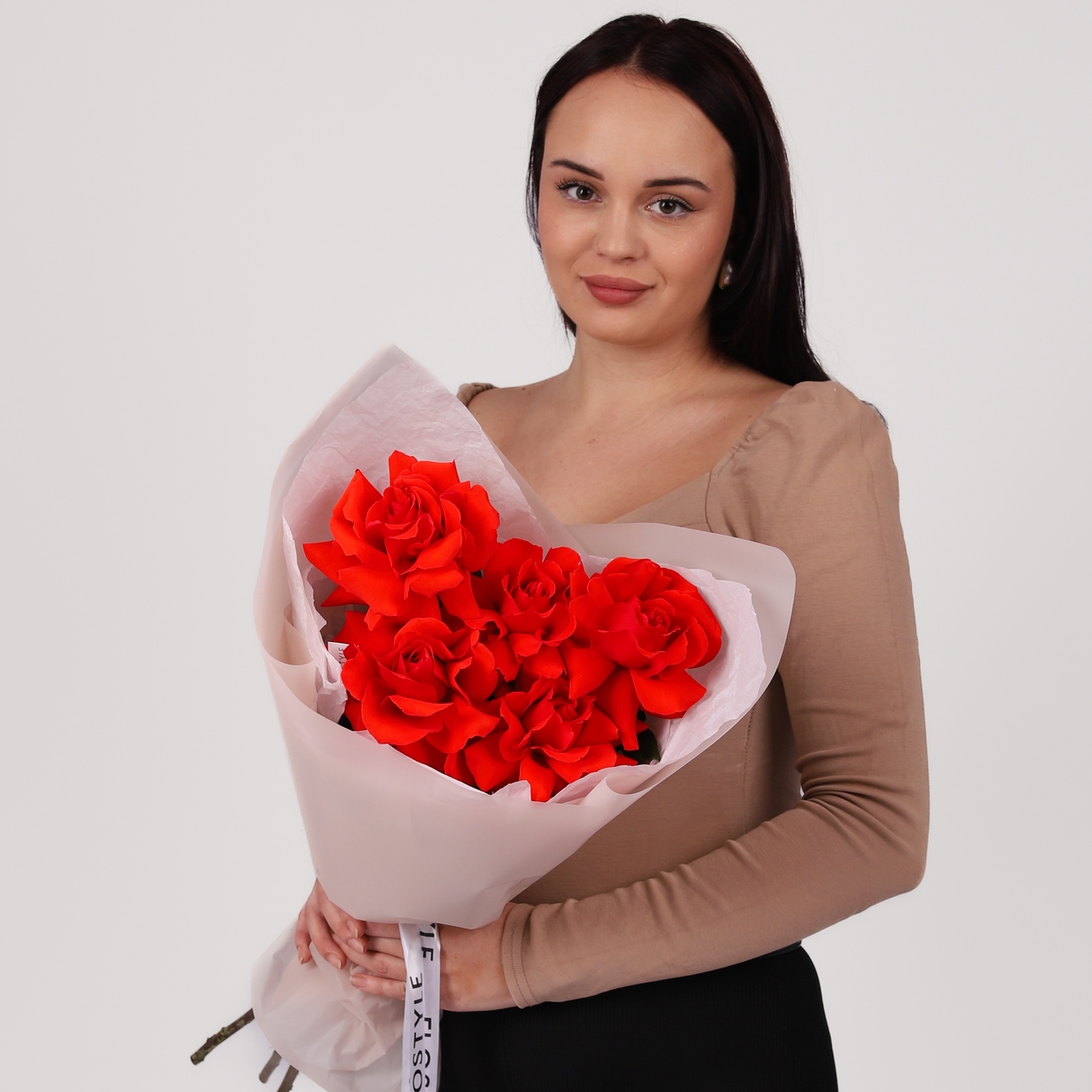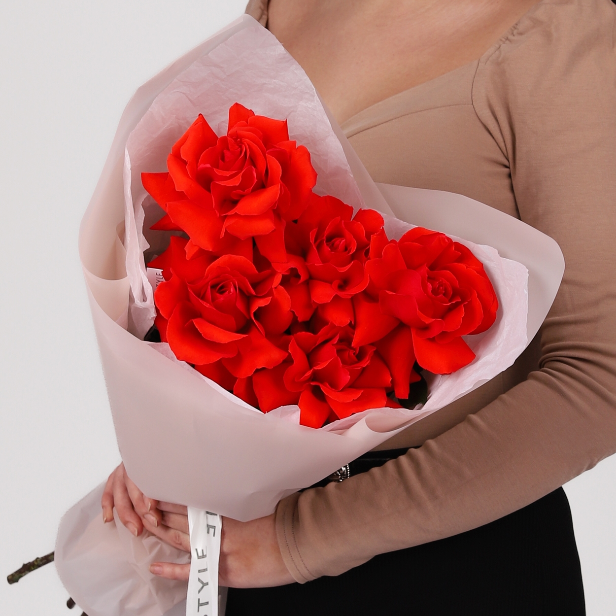Состав: Роза Nina французская - 5 шт, Тишью белая, Матовая пленка кофейная ушками