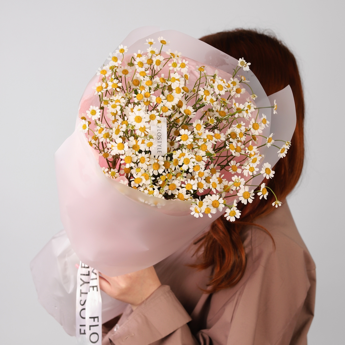 Состав: Ромашка танацетум - 7 шт, Фисташка - 1 шт, Тишью розовое, Матовая пленка полупрозрачная кругом