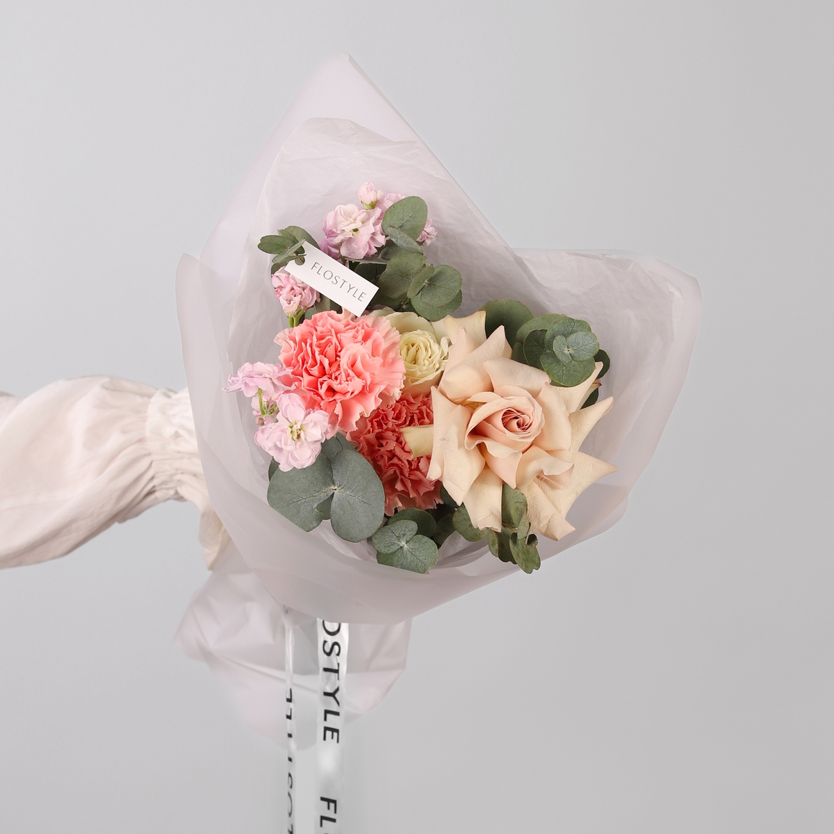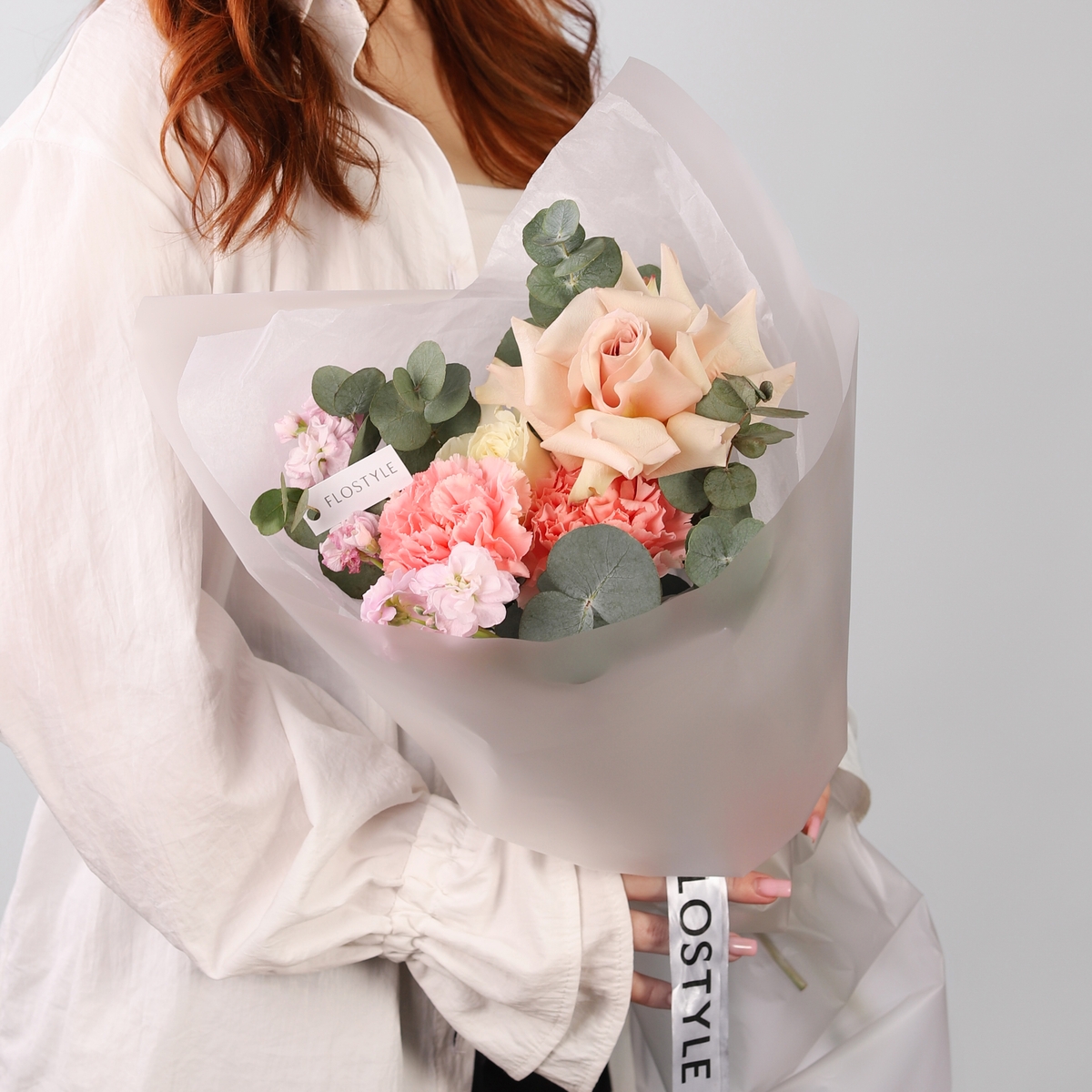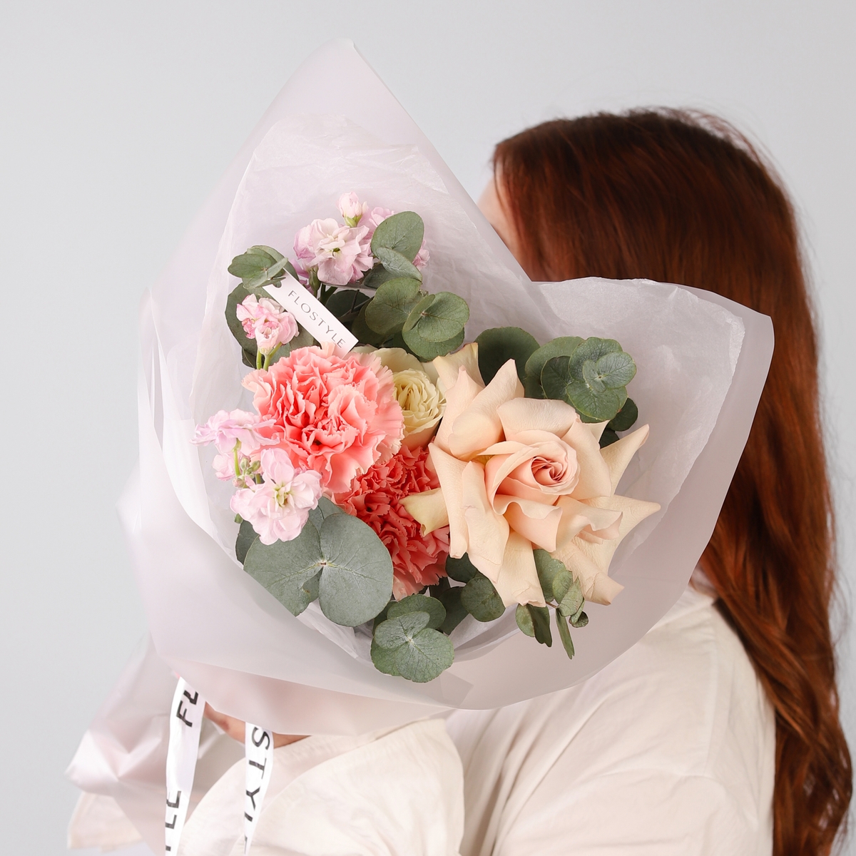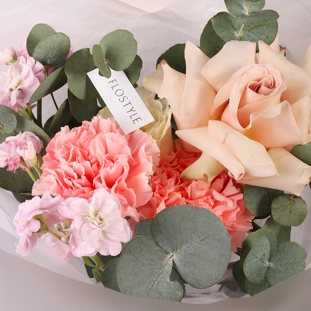 Состав: Роза Quicksand французская - 1 шт, Роза Playa Blanca - 1 шт, Диантус Pink - 2 шт, Маттиола кустовая Pink - 1 шт, Эвкалипт - 0,5 шт, Фисташка - 1 шт, Тишью белое, Матовая пленка полупрозрачная ушками