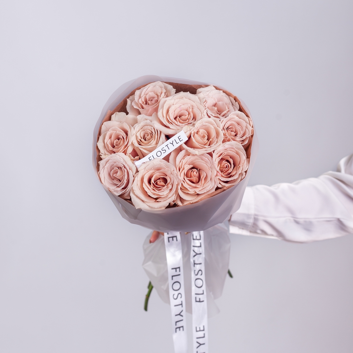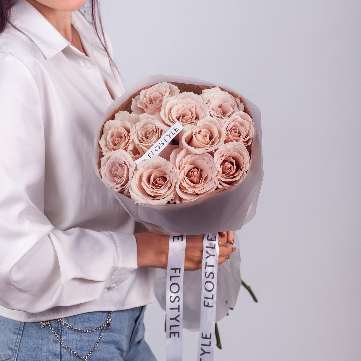 Состав: Роза Quicksand - 11 шт, Тишью коричневая, Матовая пленка белая кругом