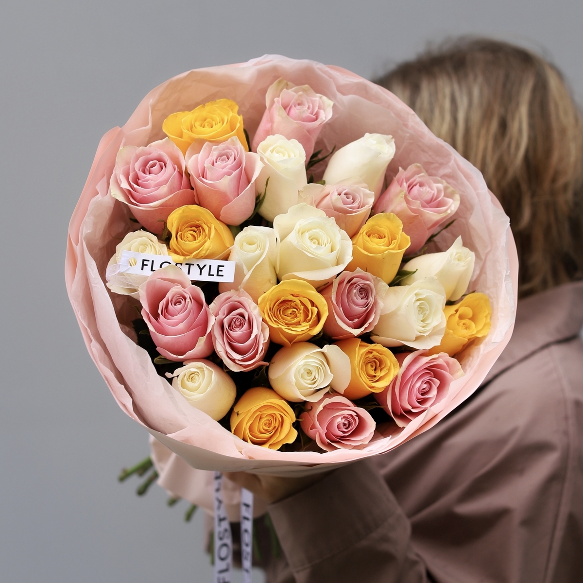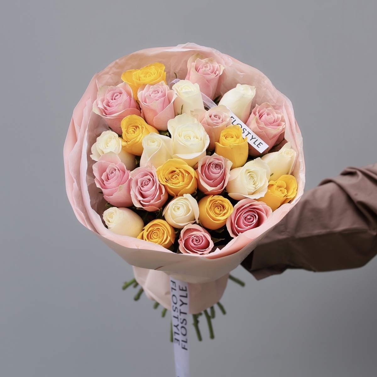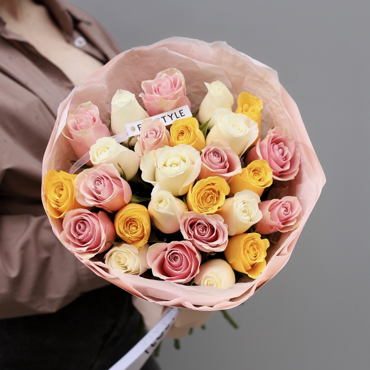 Состав: Роза Кения Mix (White, Yellow, Pink) - 25 шт, Тишью белая, Матовая пленка розовая кругом