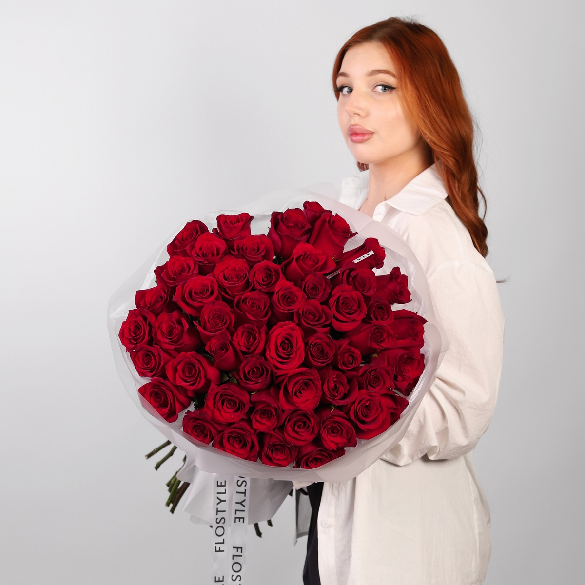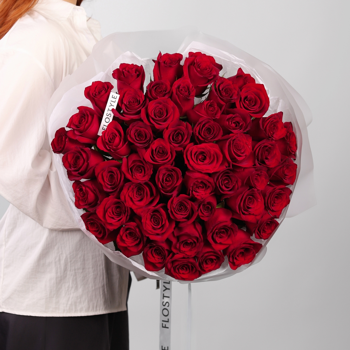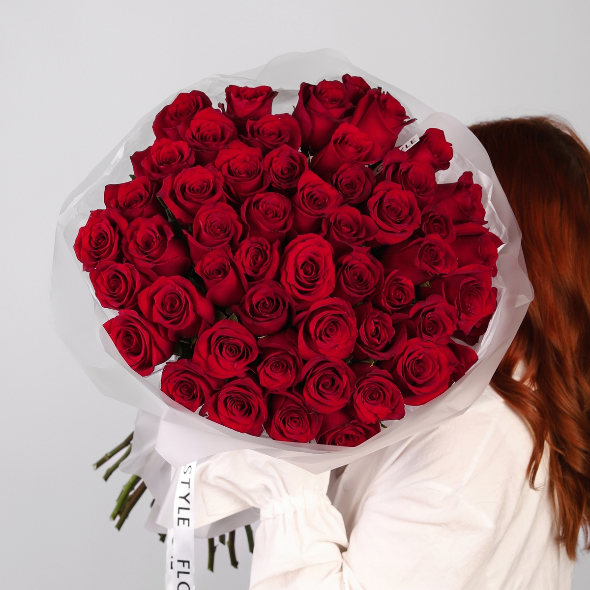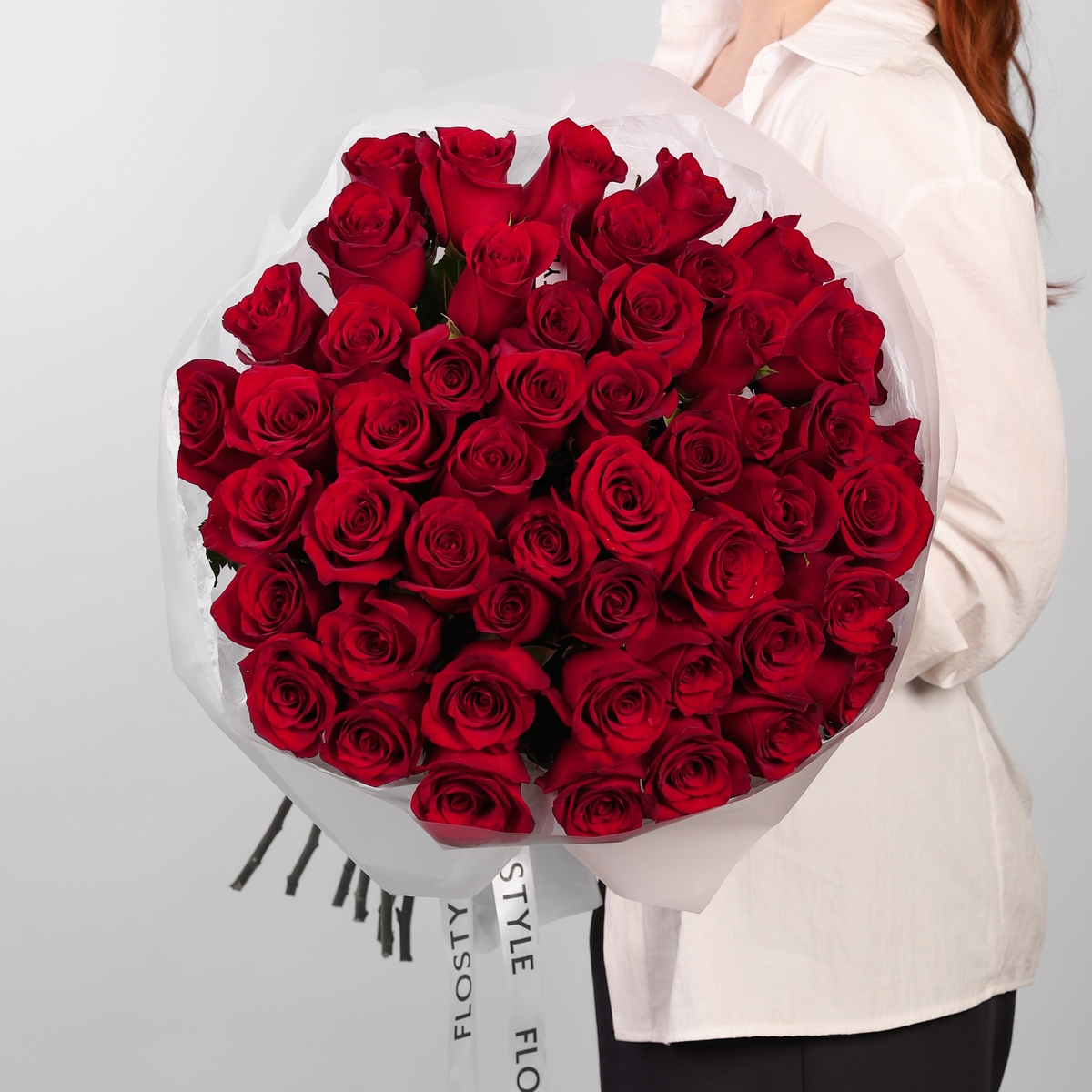 Состав: Роза Explorer - 51 шт, Тишью белое, Матовая пленка полупрозрачная кругом