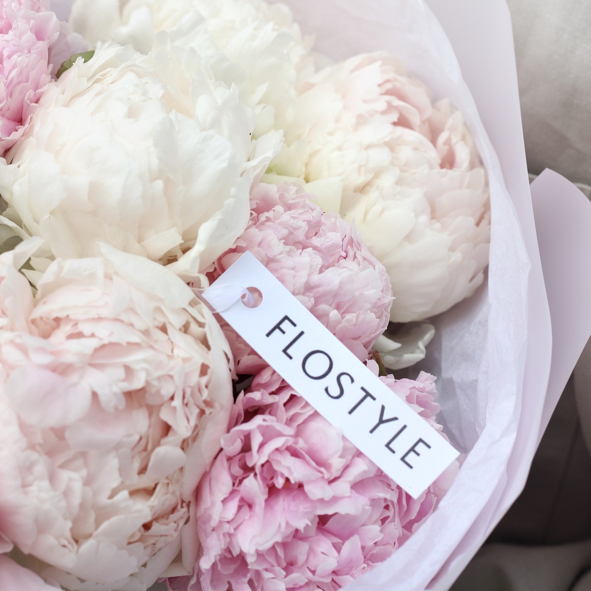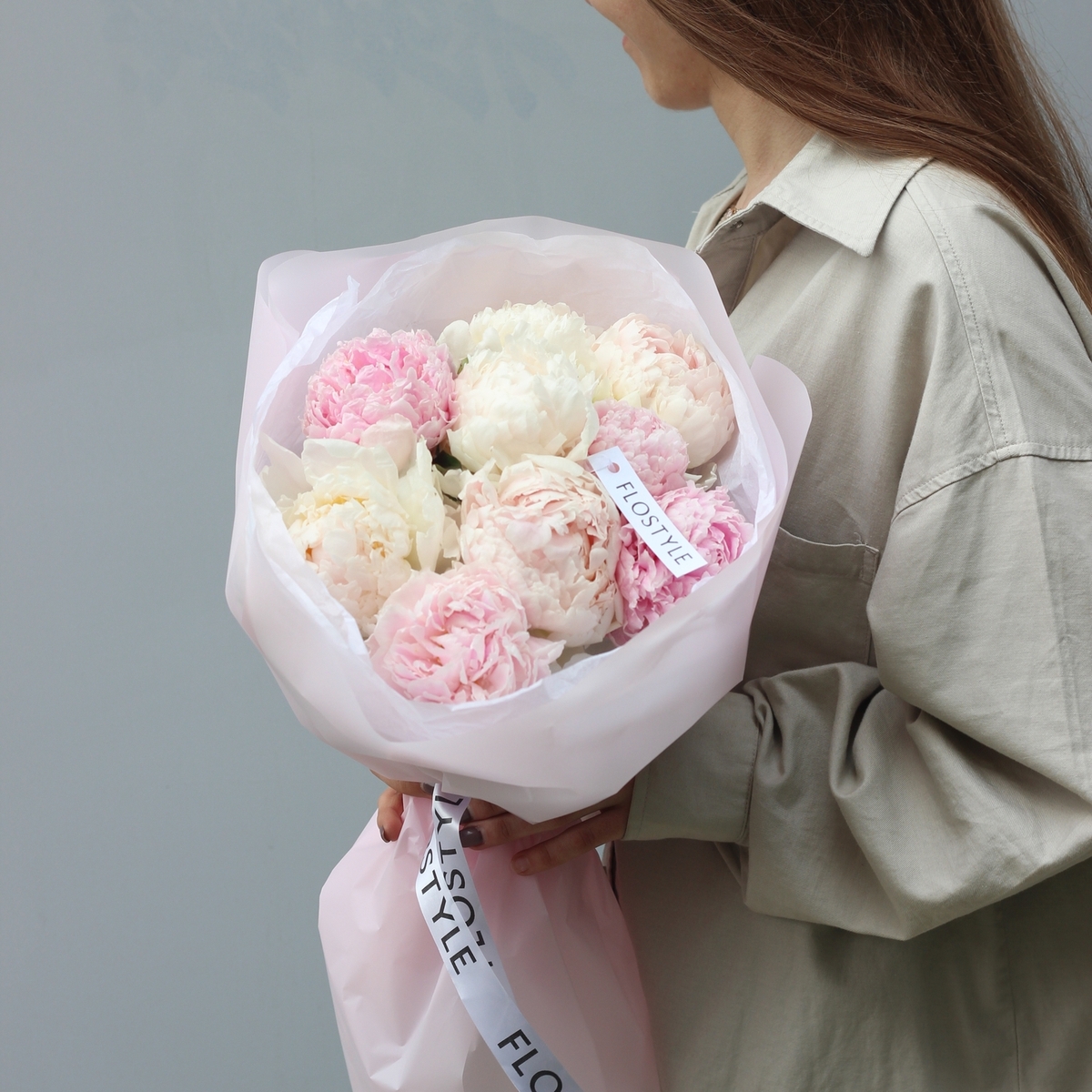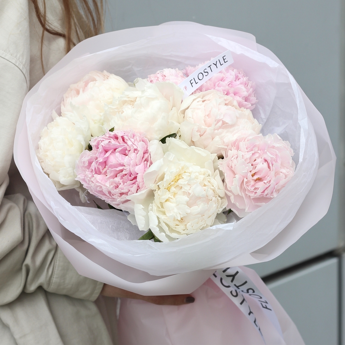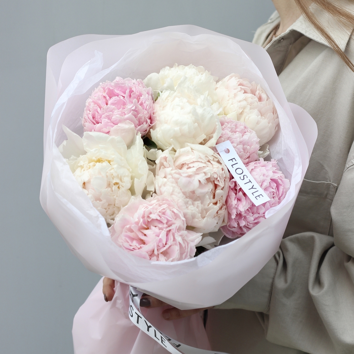 Состав: Пионы Pink/White - 9 шт, Тишью белая: Матовая пленка розовая кругом
