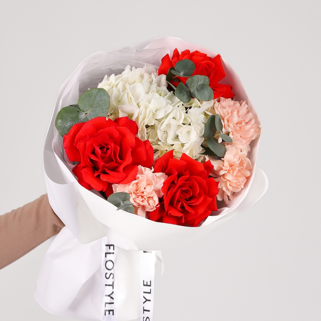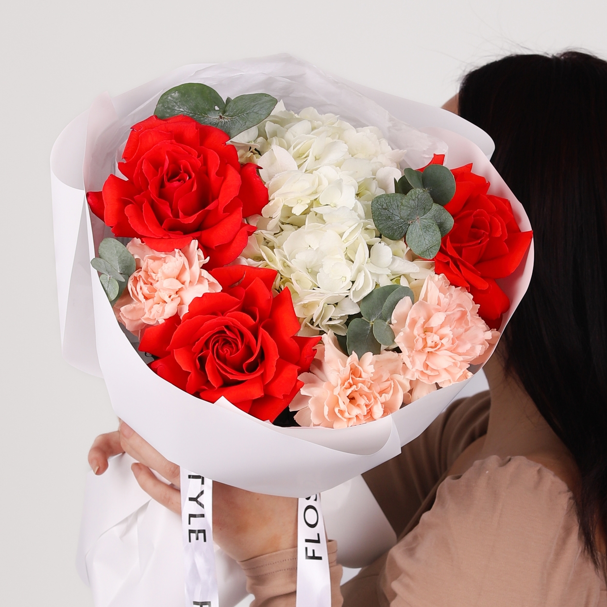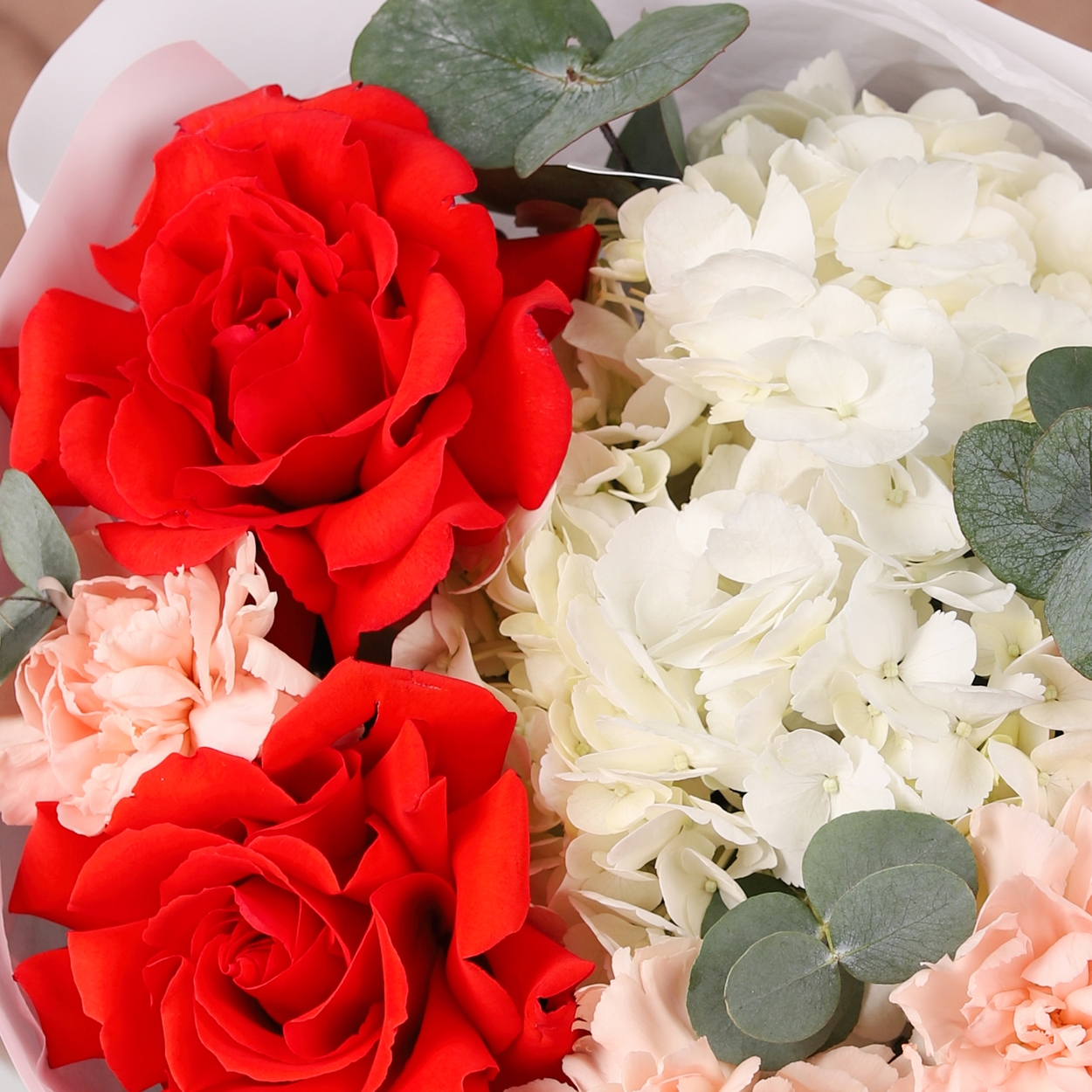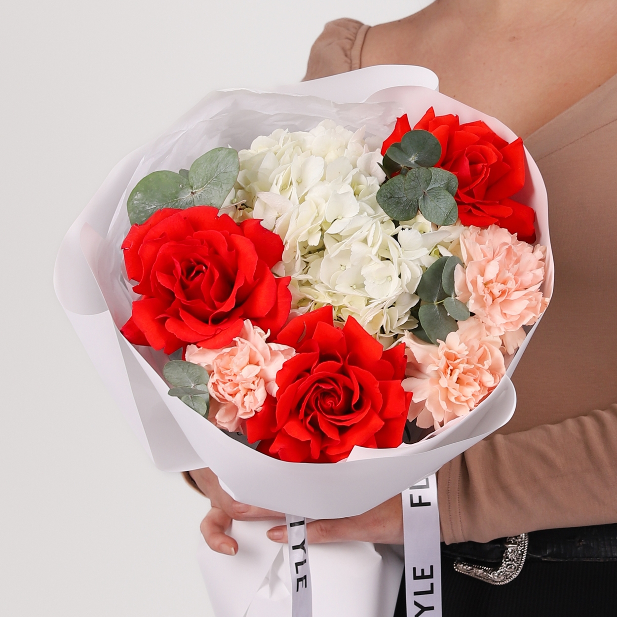 Состав: Роза Nina французская - 3 шт, Гортензия White - 1 шт, Диантус Pink - 3 шт, Эвкалипт - 0,5 шт, Тишью белая, Матовая пленка белая кругом