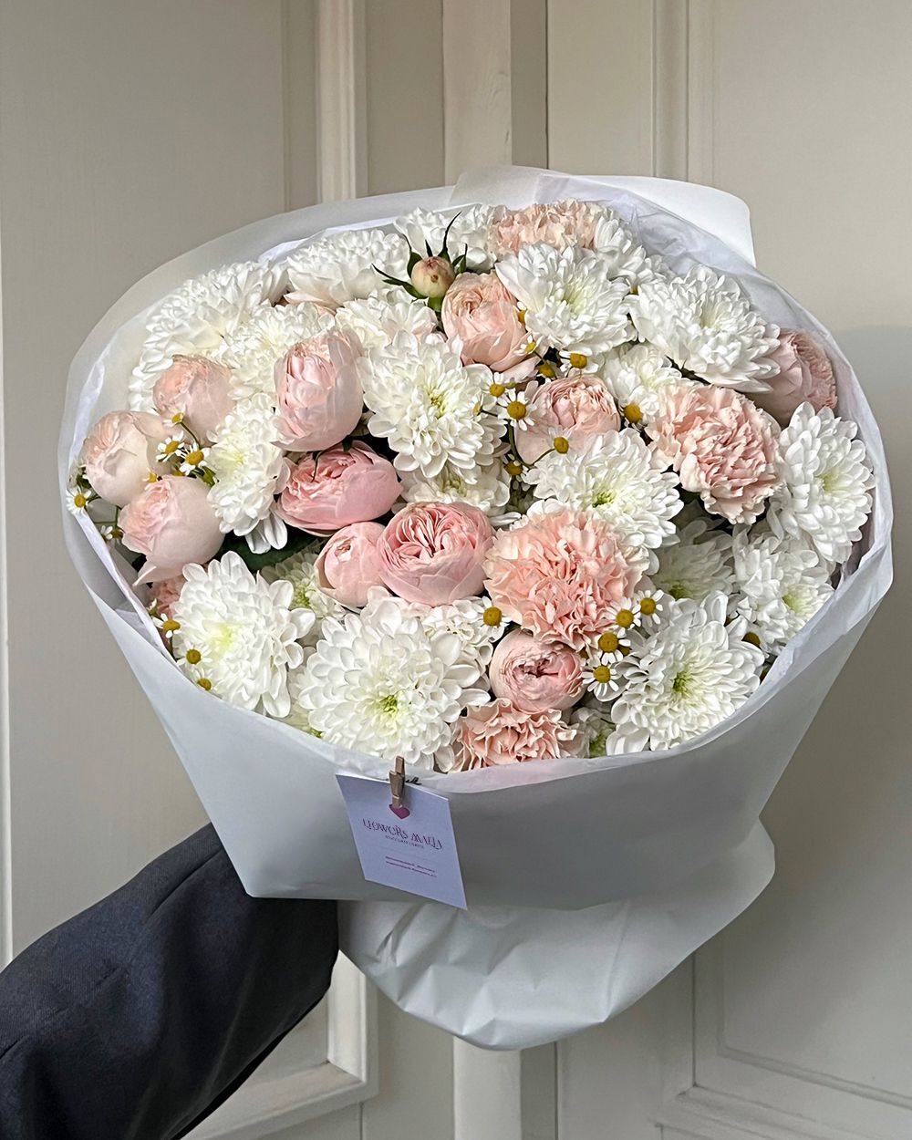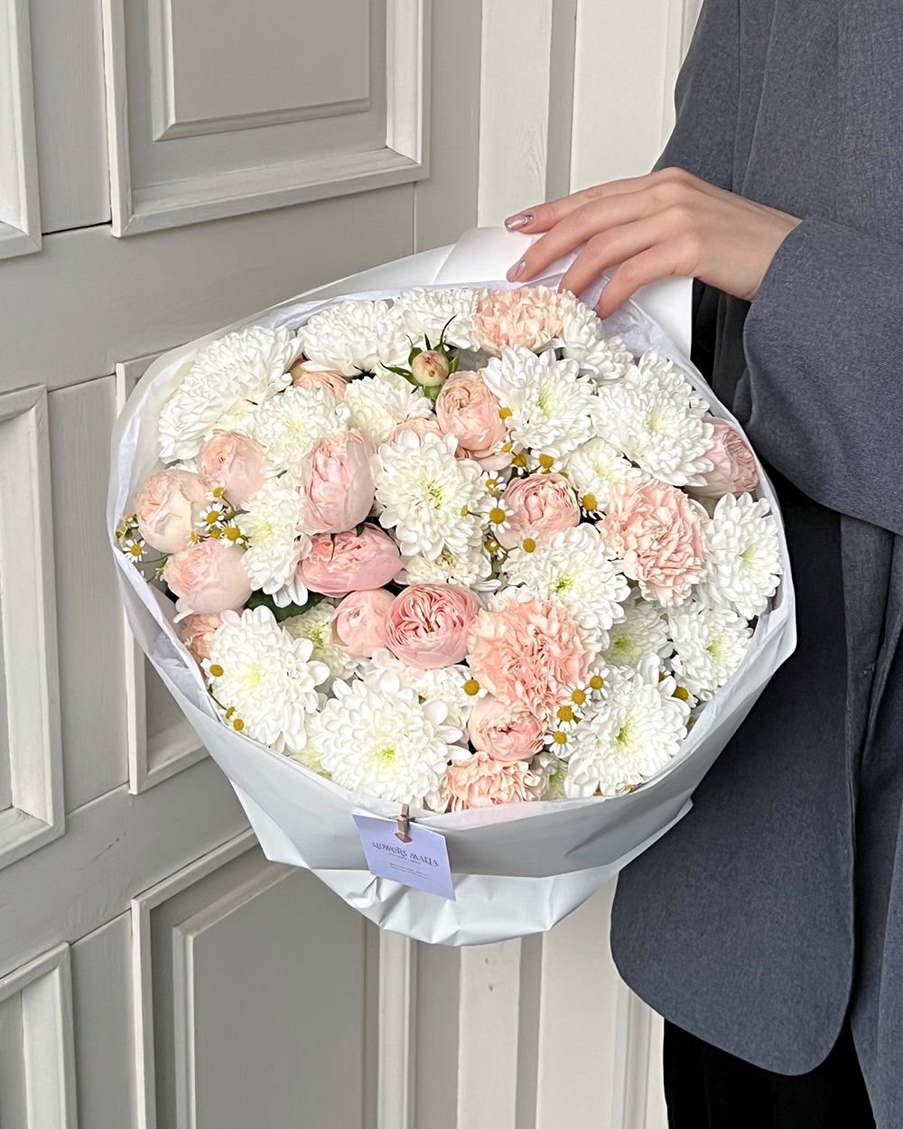 Состав: Хризантема Алтай - 7 шт., кустовые пионовидные розы - 5 шт., диантусы - 5 шт., танацетум (ромашки).