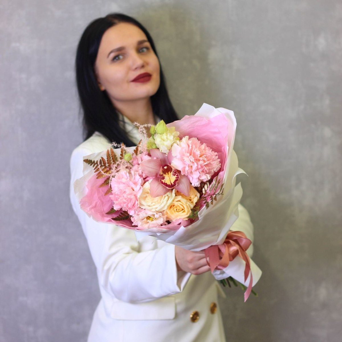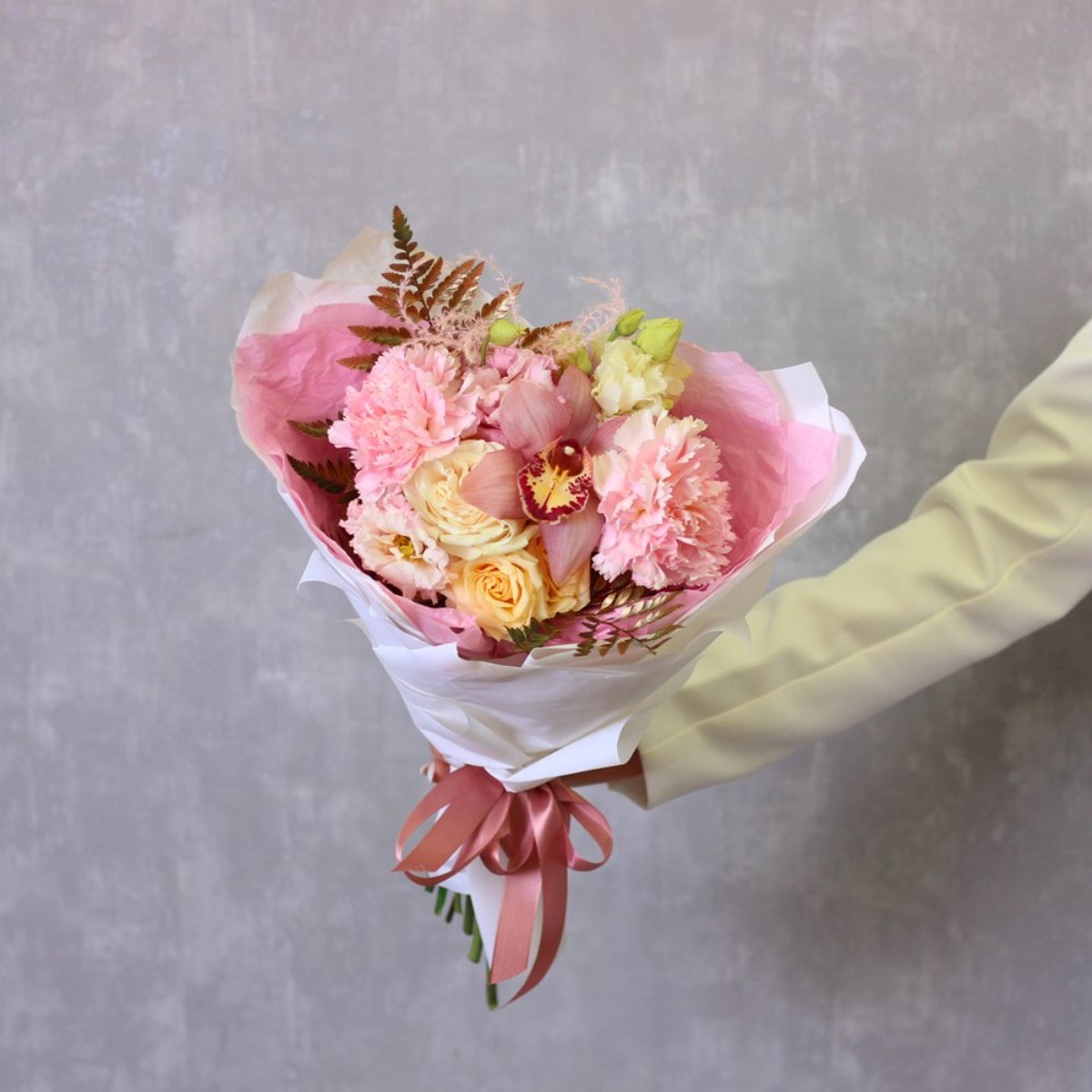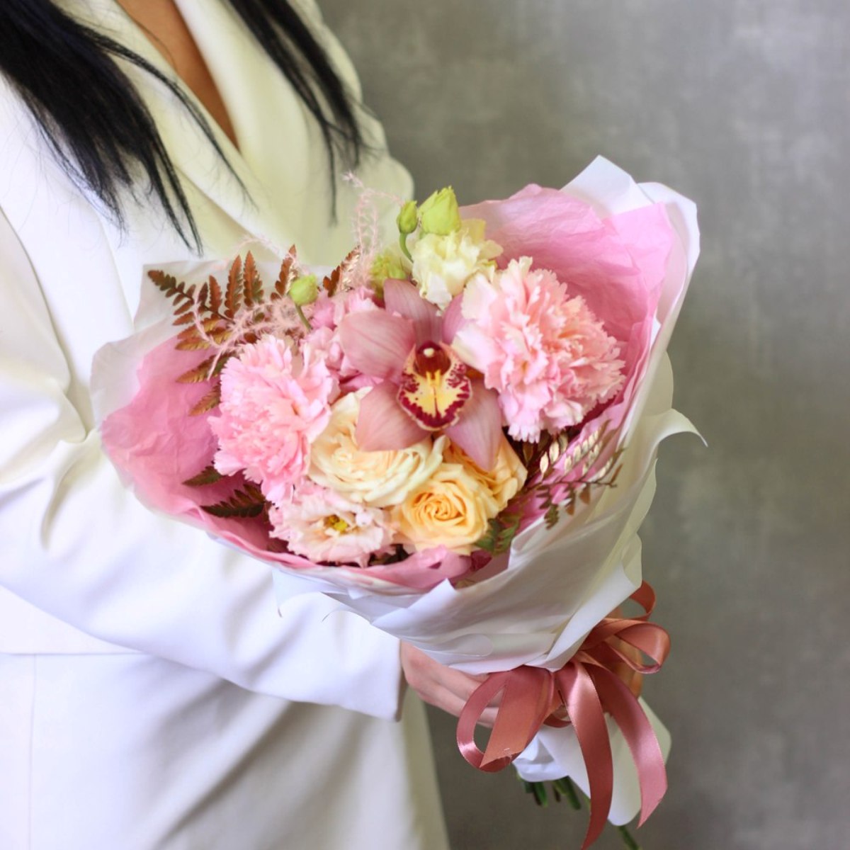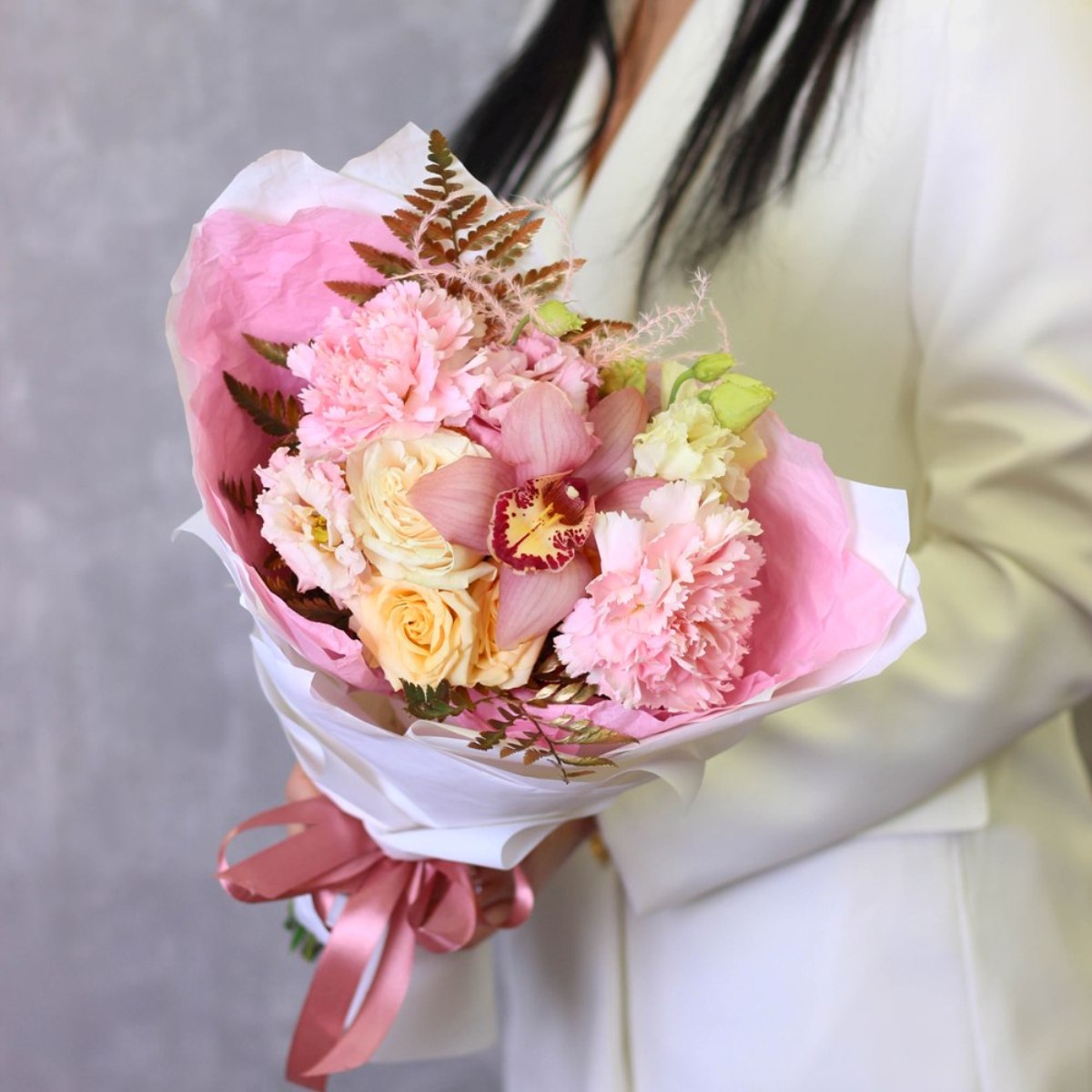 Состав: Орхидея Pink — 1 шт, Эустома — 1 шт, Роза Playa Blanca — 1 шт, Роза кустовая Salinero — 1 шт, Диантус Pink — 2 шт, Фисташка — 1 шт, Папоротник — 2 шт, Сухоцветы — 2 шт, Тишью розовое, Матовая пленка белая углами