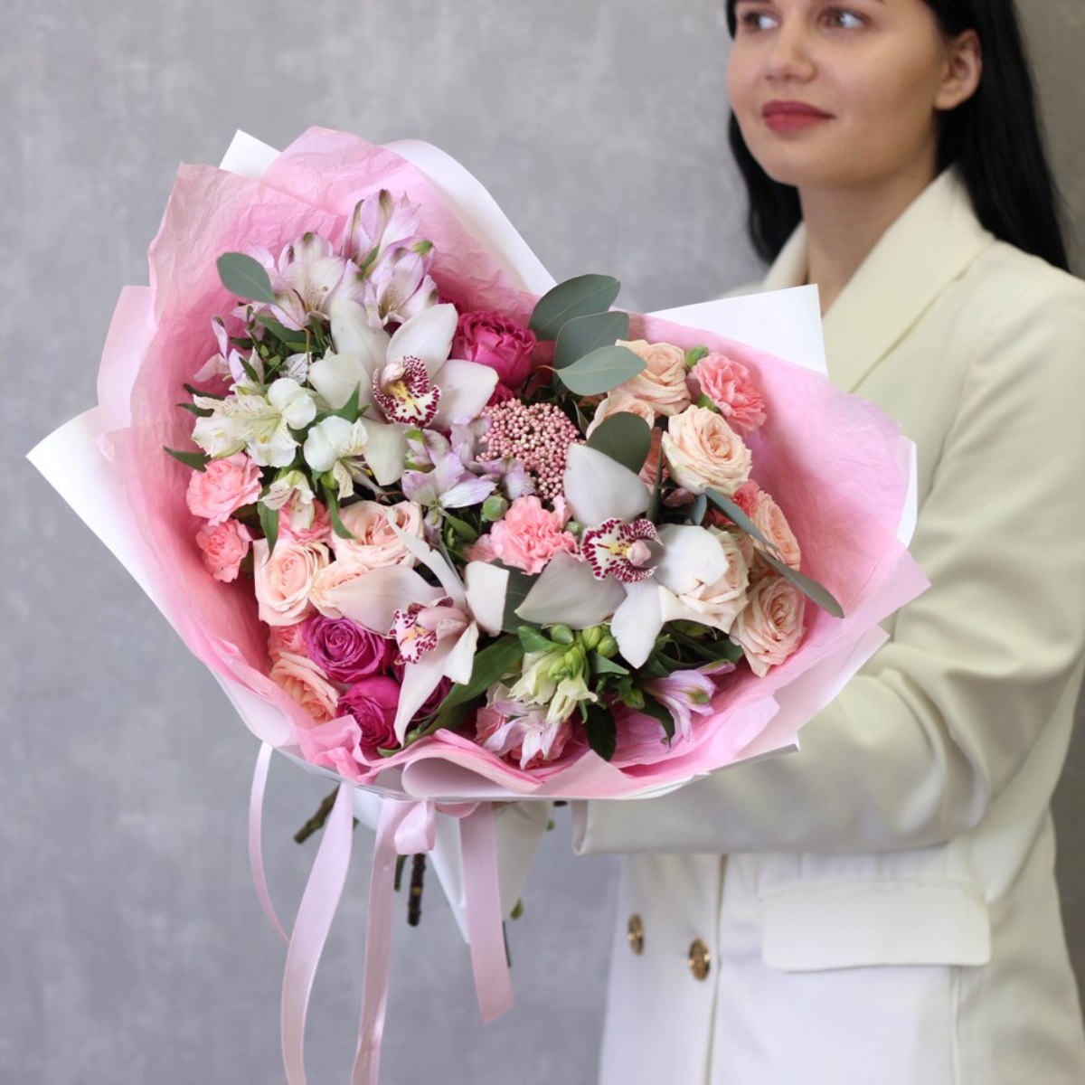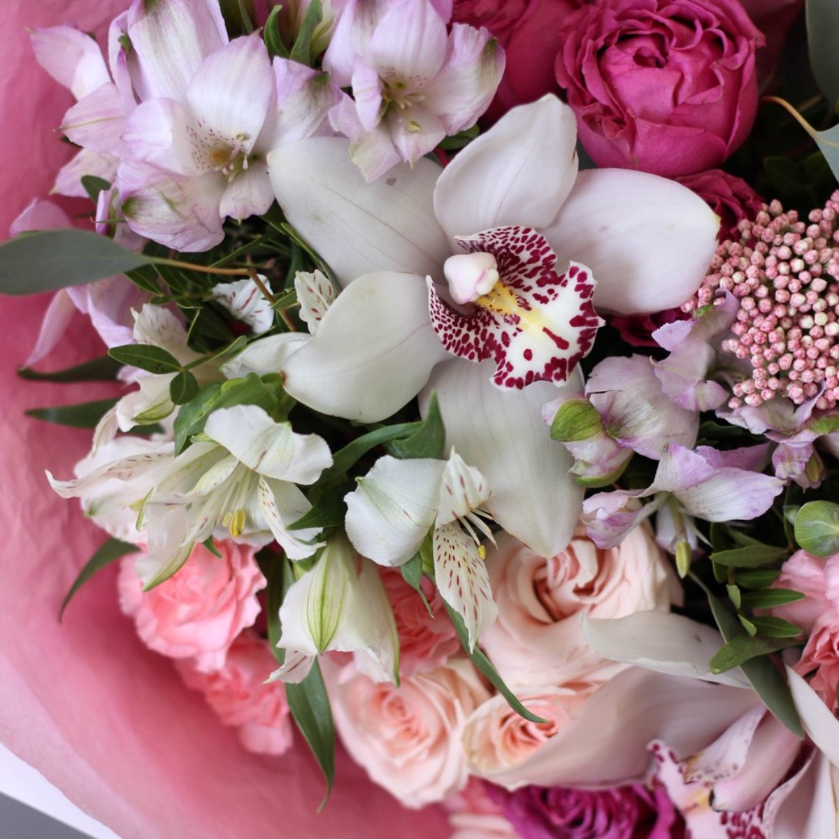 Состав: Альстромерия - 5 шт, Озотамнус - 1 шт, Орхидея White - 3 шт, Гвоздика кустовая - 5 шт, Кустовая пионовидная роза - 2 шт, Кустовая роза Pink - 4 шт, Эвкалипт - 1 шт, Фисташка - 3 шт, Тишью розовая, Матовая пленка белая ушками