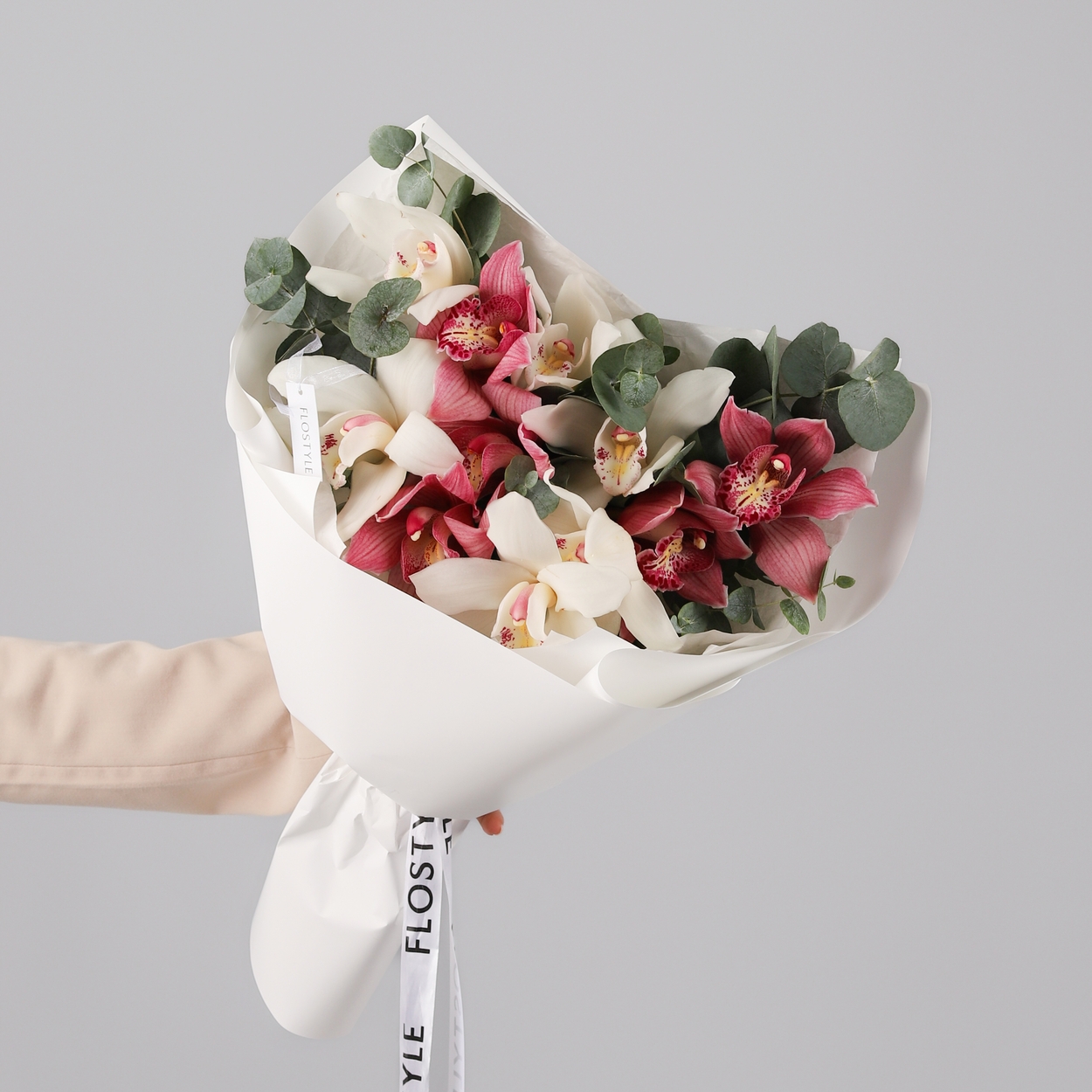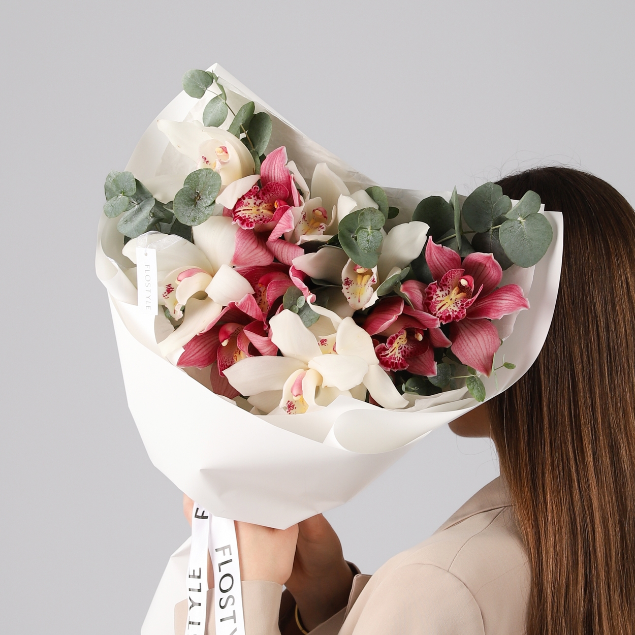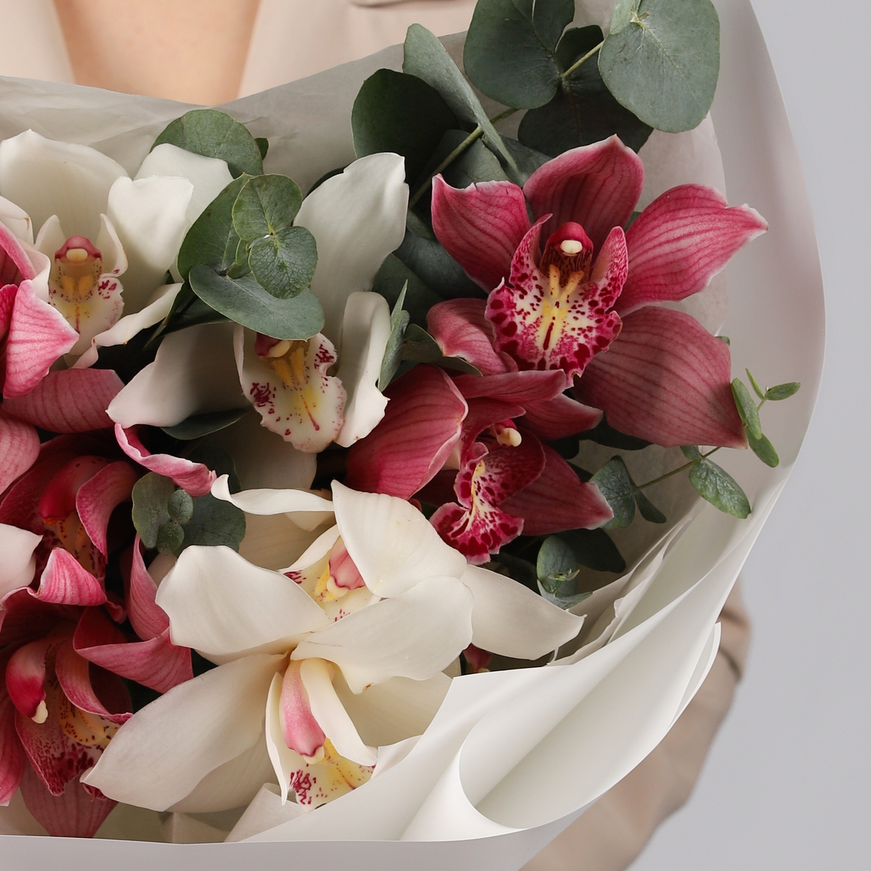 Состав: Орхидея White/Pink - 11 шт, Эвкалипт - 1 шт, Тишью белая, Матовая пленка белая ушками