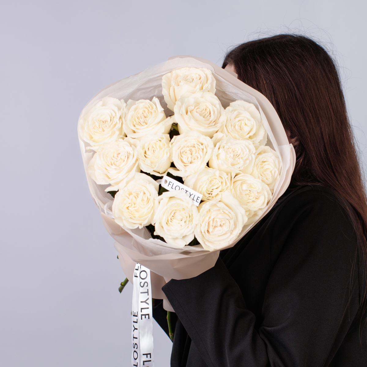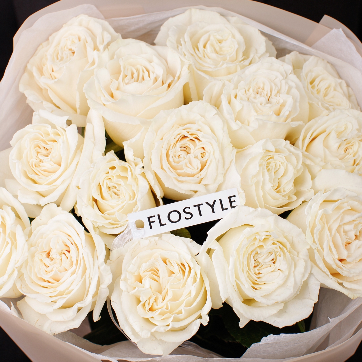 Состав: Роза Playa Blanca - 15 шт, Белая тишью, Матовая пленка бежевая кругом