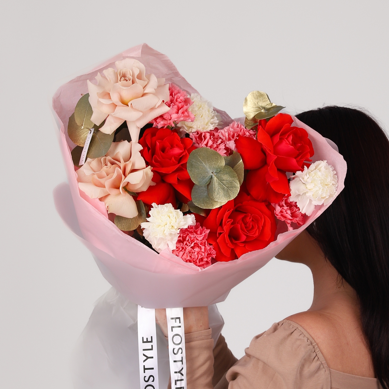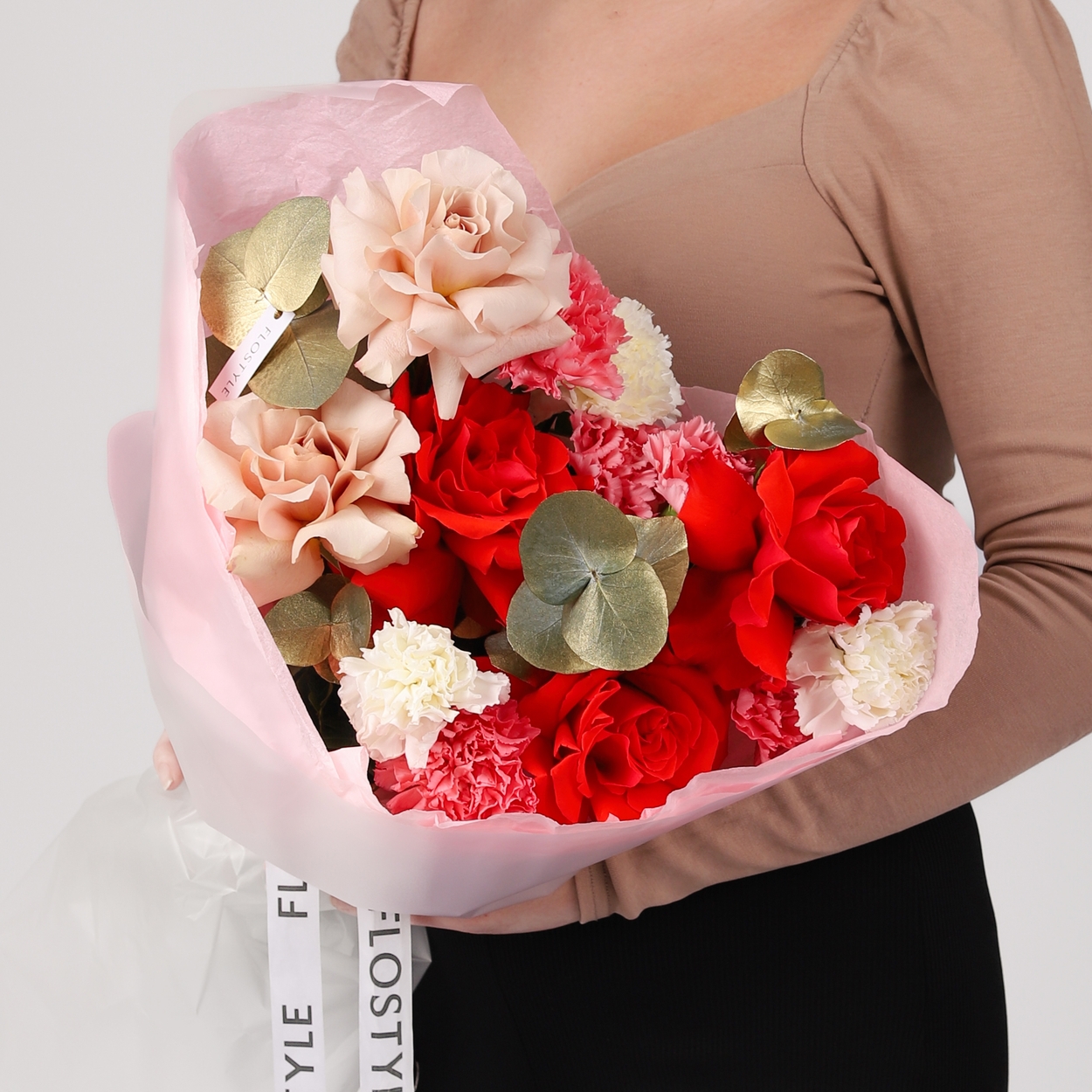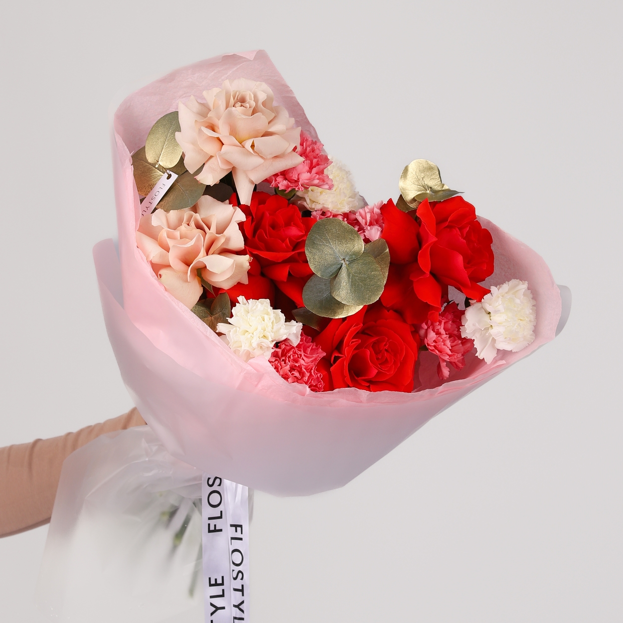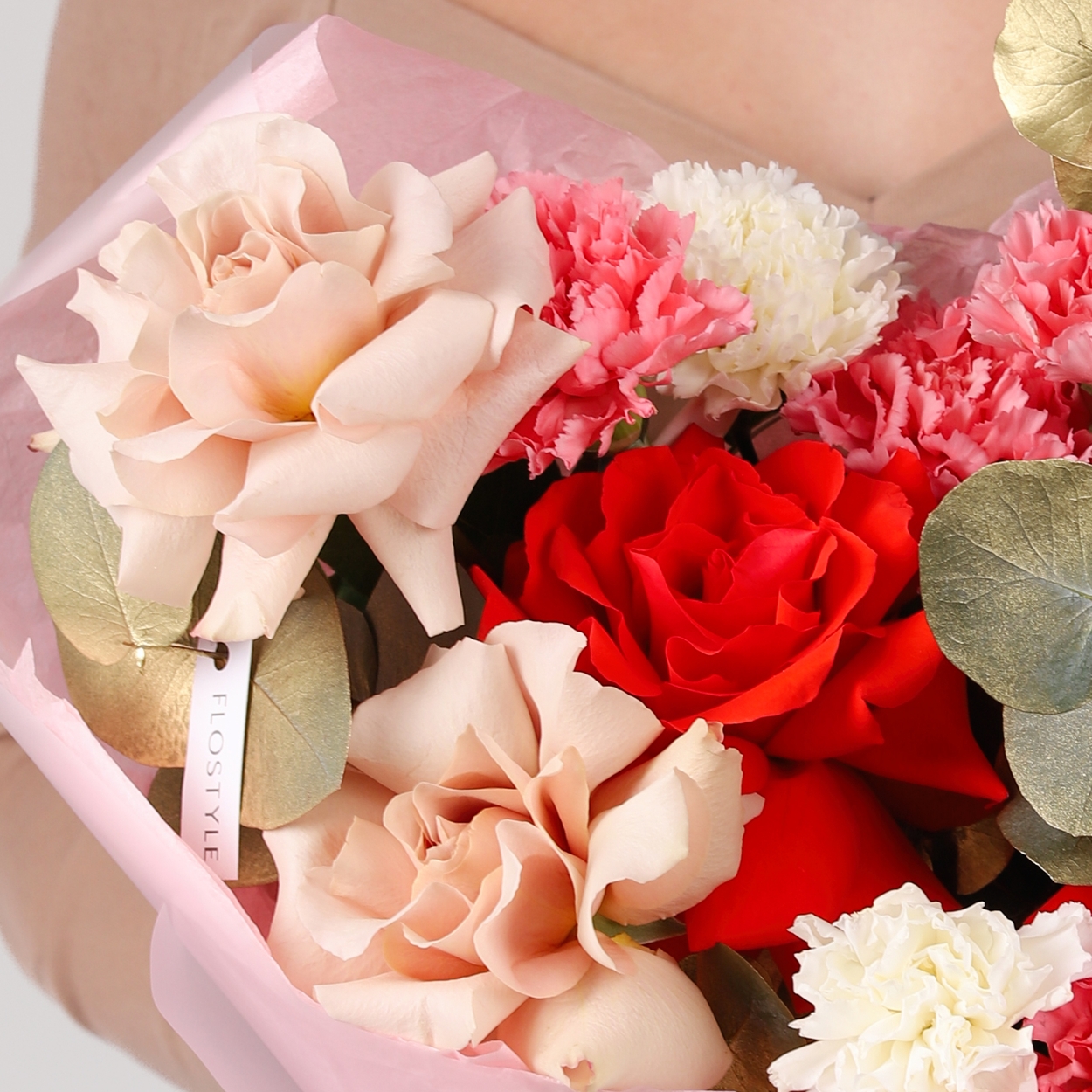 Состав: Роза Nina французская - 3 шт, Роза Quicksand французская - 2 шт, Диантус Pink/White - 7 шт, Эвкалипт - 1 шт, Фисташка - 2 шт, Тишью розовая, Матовая пленка белая ушками