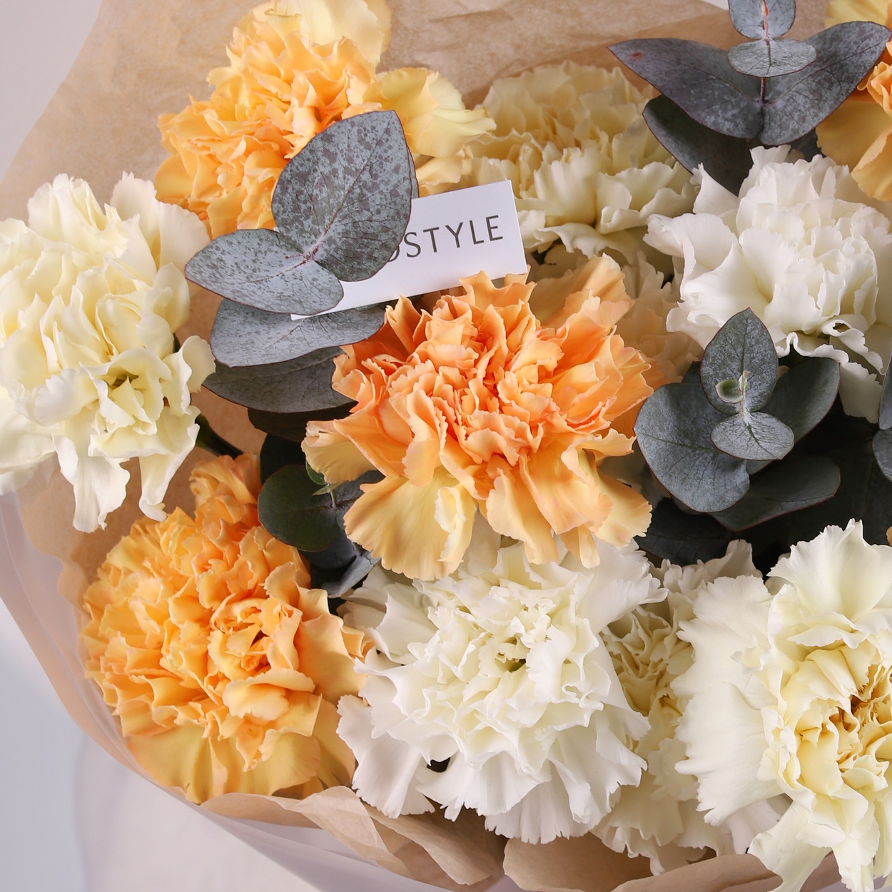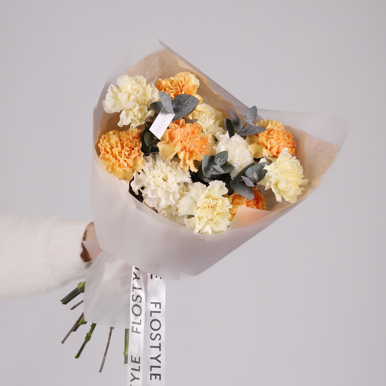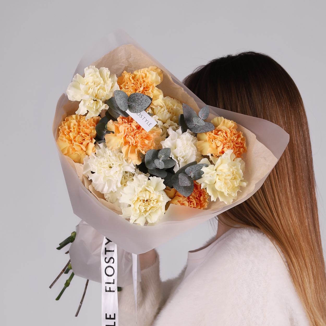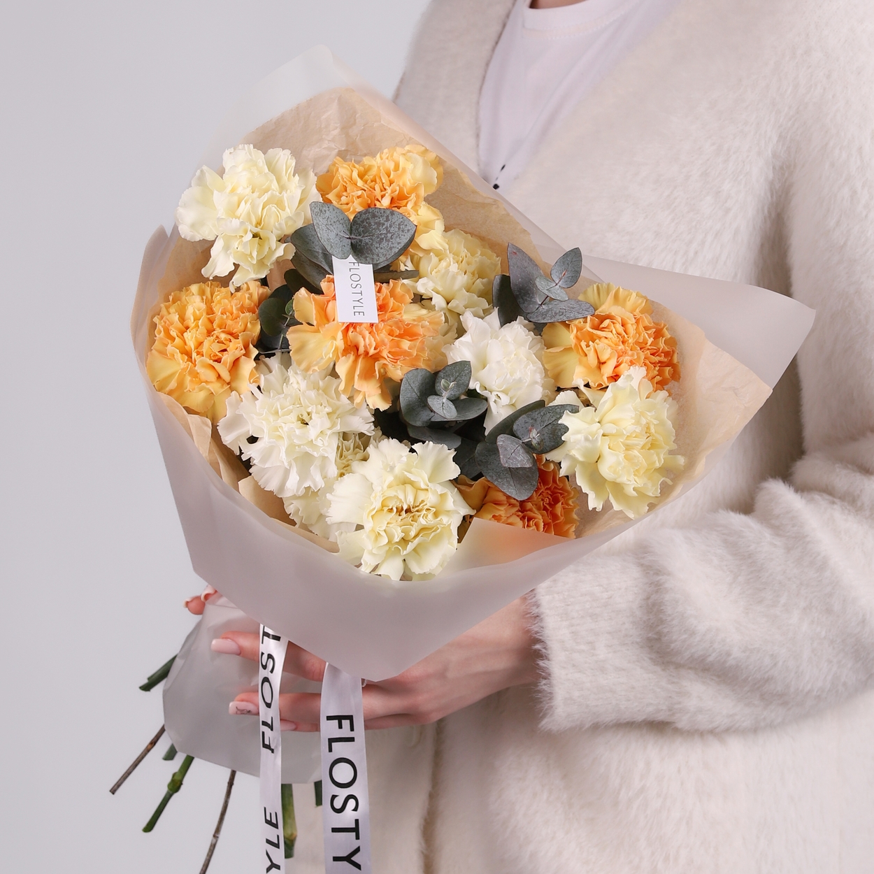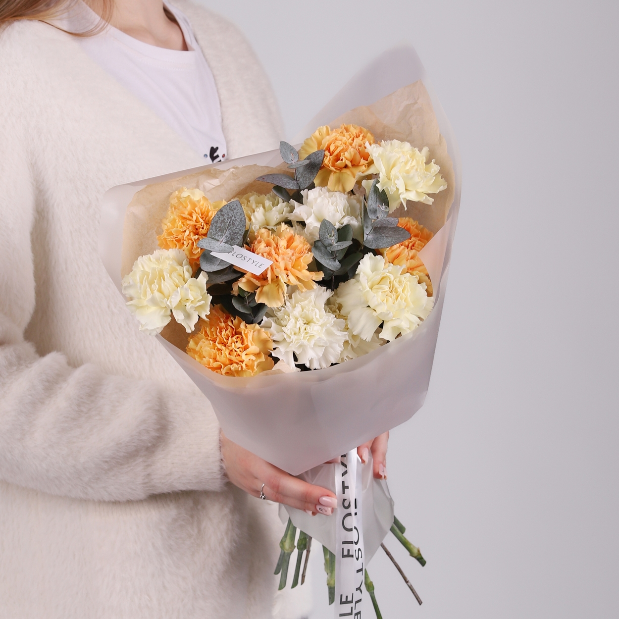 Состав: Диантус White/Yellow/Orange - 13 шт, Эвкалипт - 0,5 шт, Фисташка - 2 шт, Тишью бежевая, Матовая пленка белая ушками