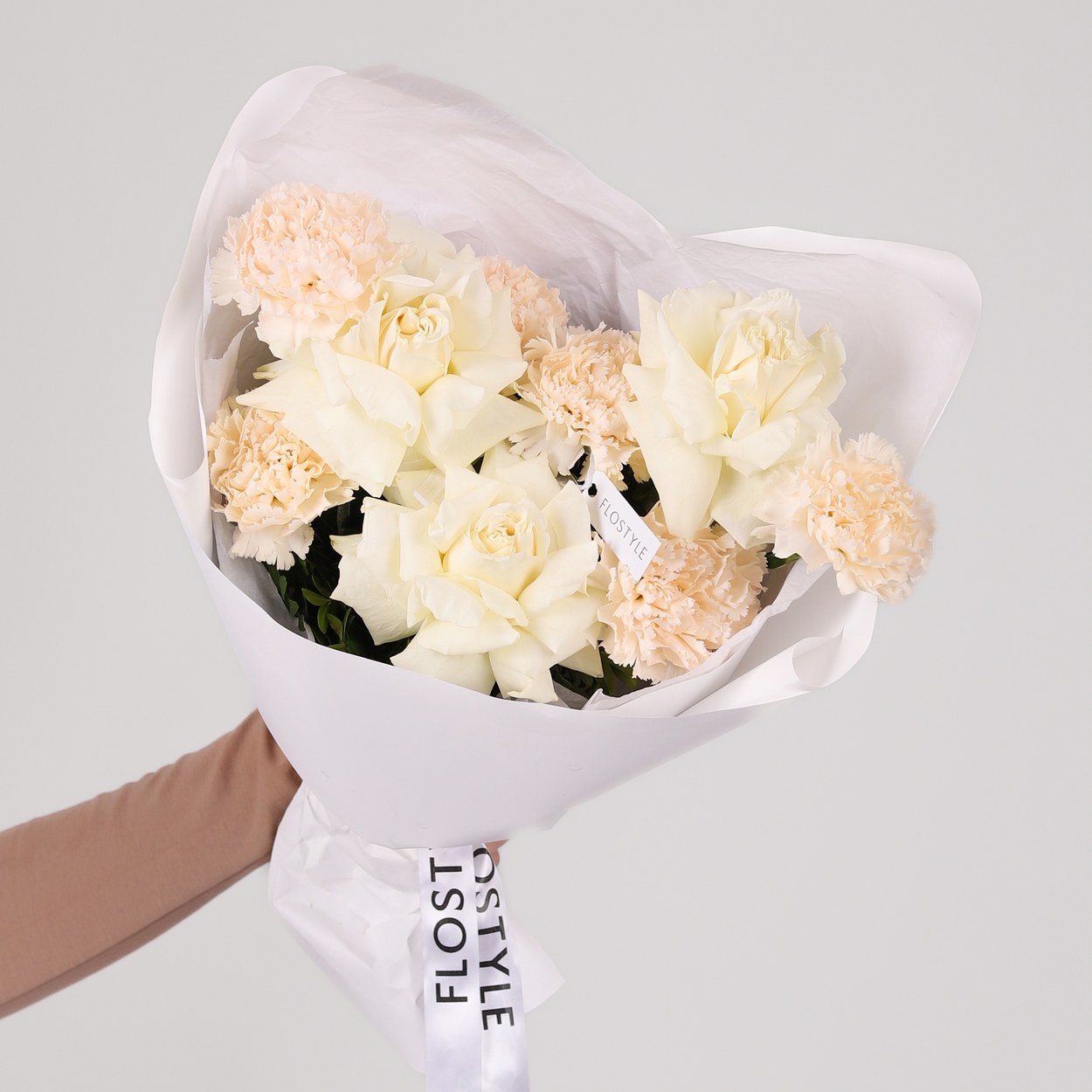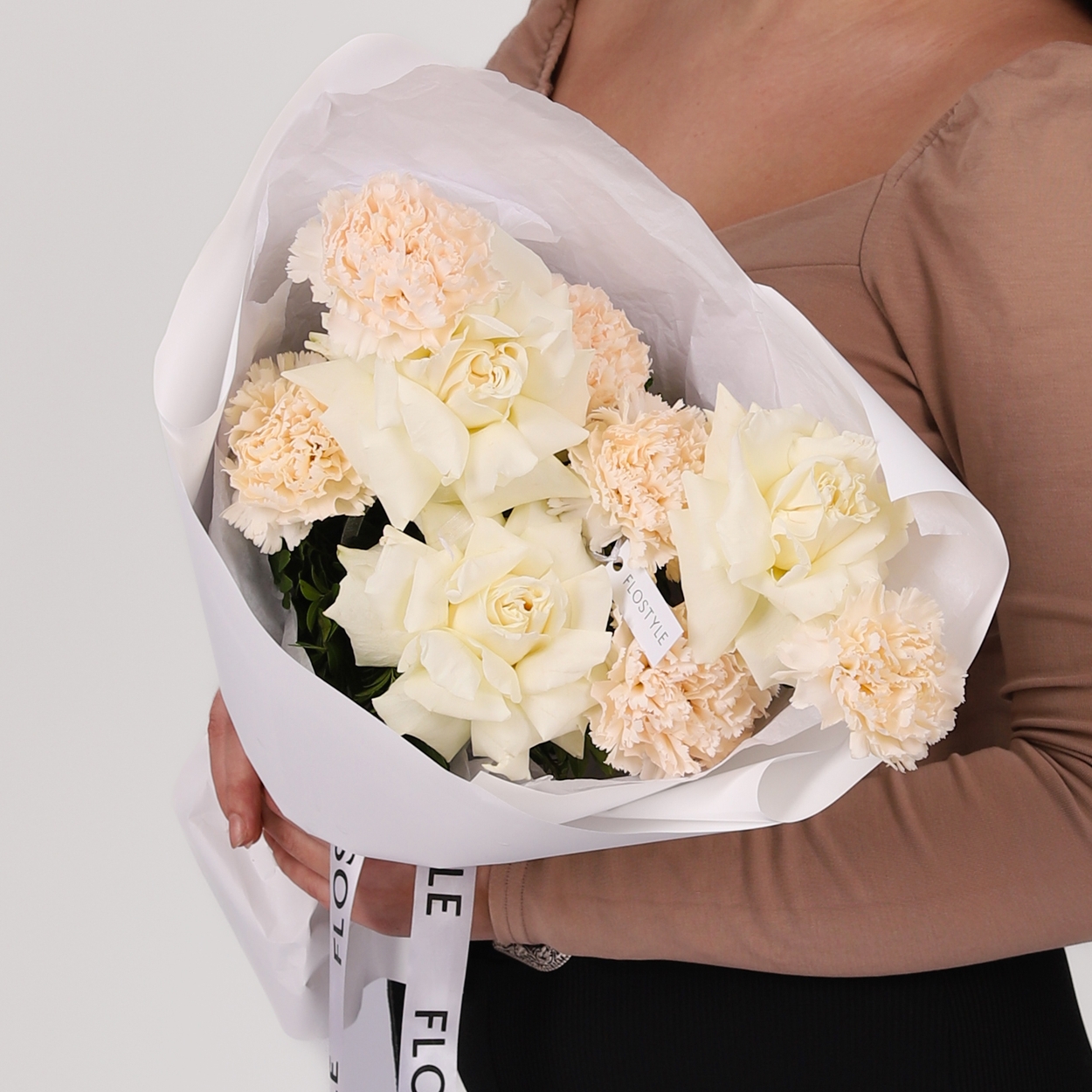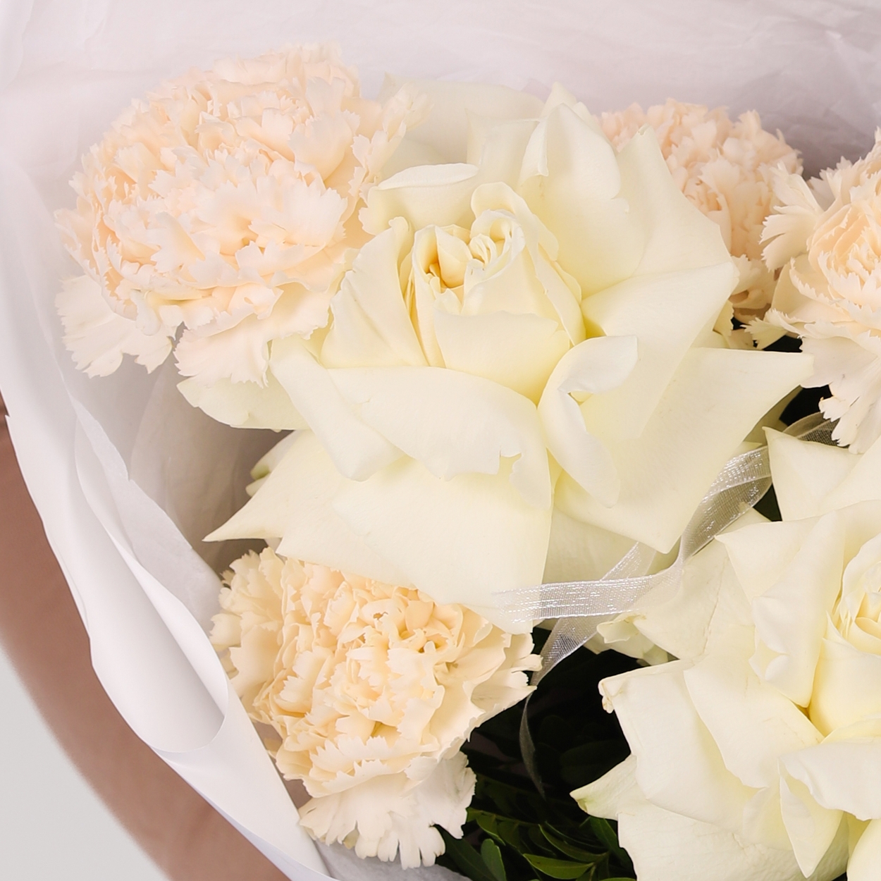 Состав: Роза Playa Blanca французская - 3 шт, Диантус Brut - 6 шт, Эвкалипт - 0,5 шт, Тишью белая, Матовая пленка белая ушками
