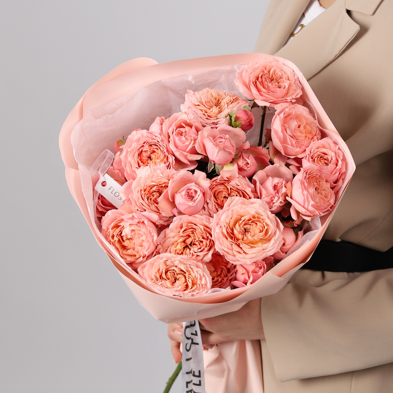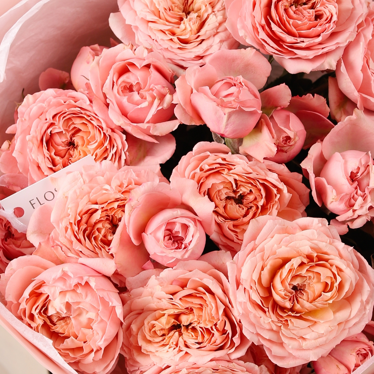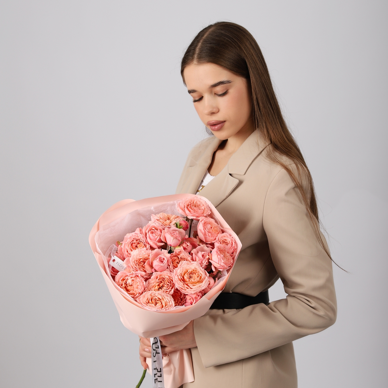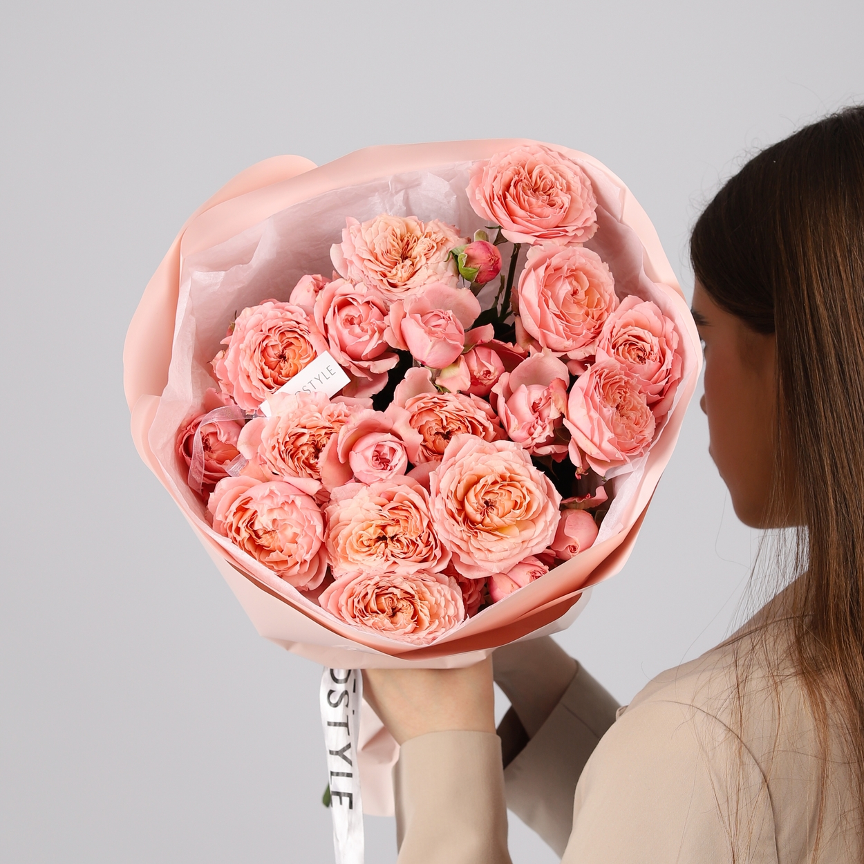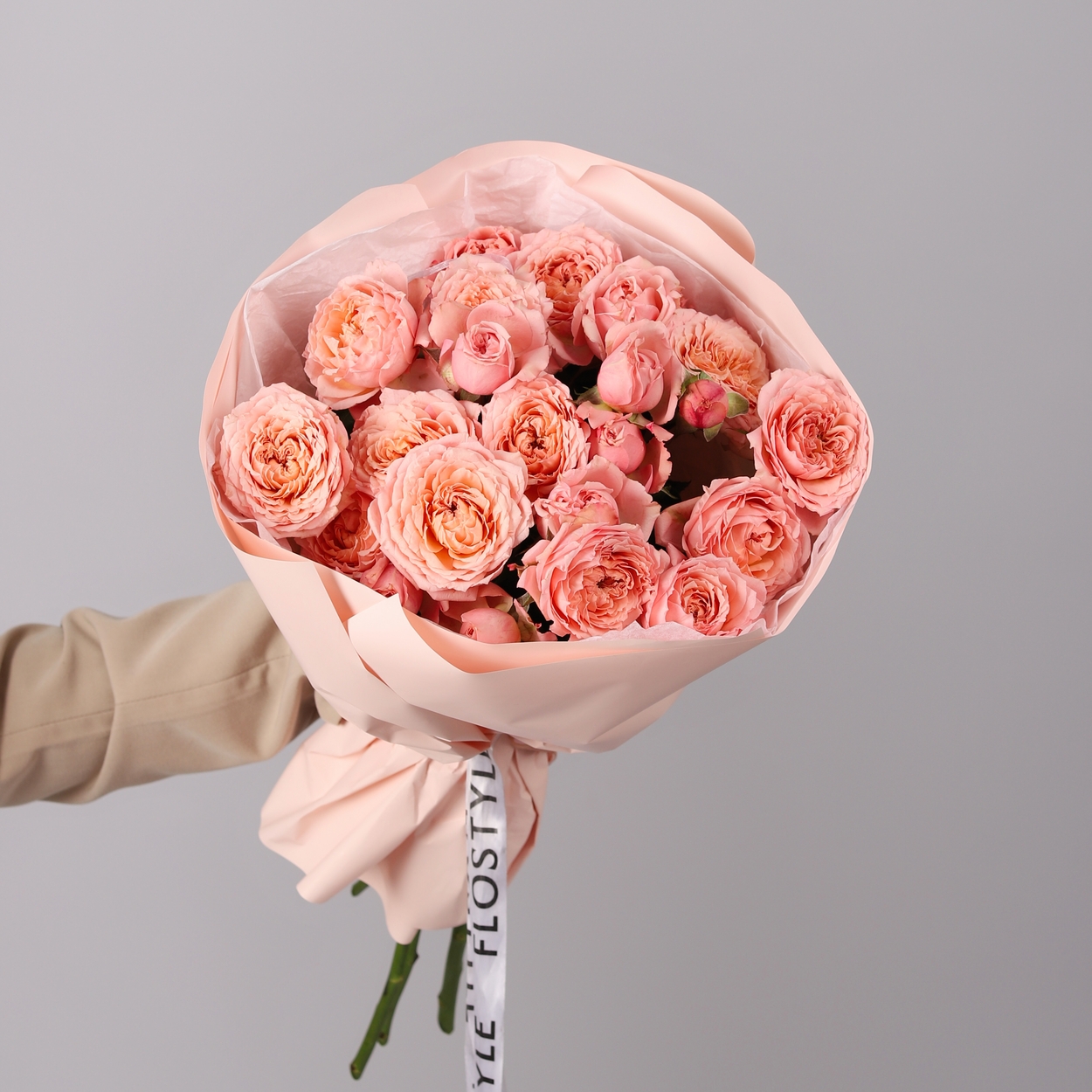 Состав: Роза кустовая Juliet - 5 шт, Тишью белая, Матовая пленка розовая кругом