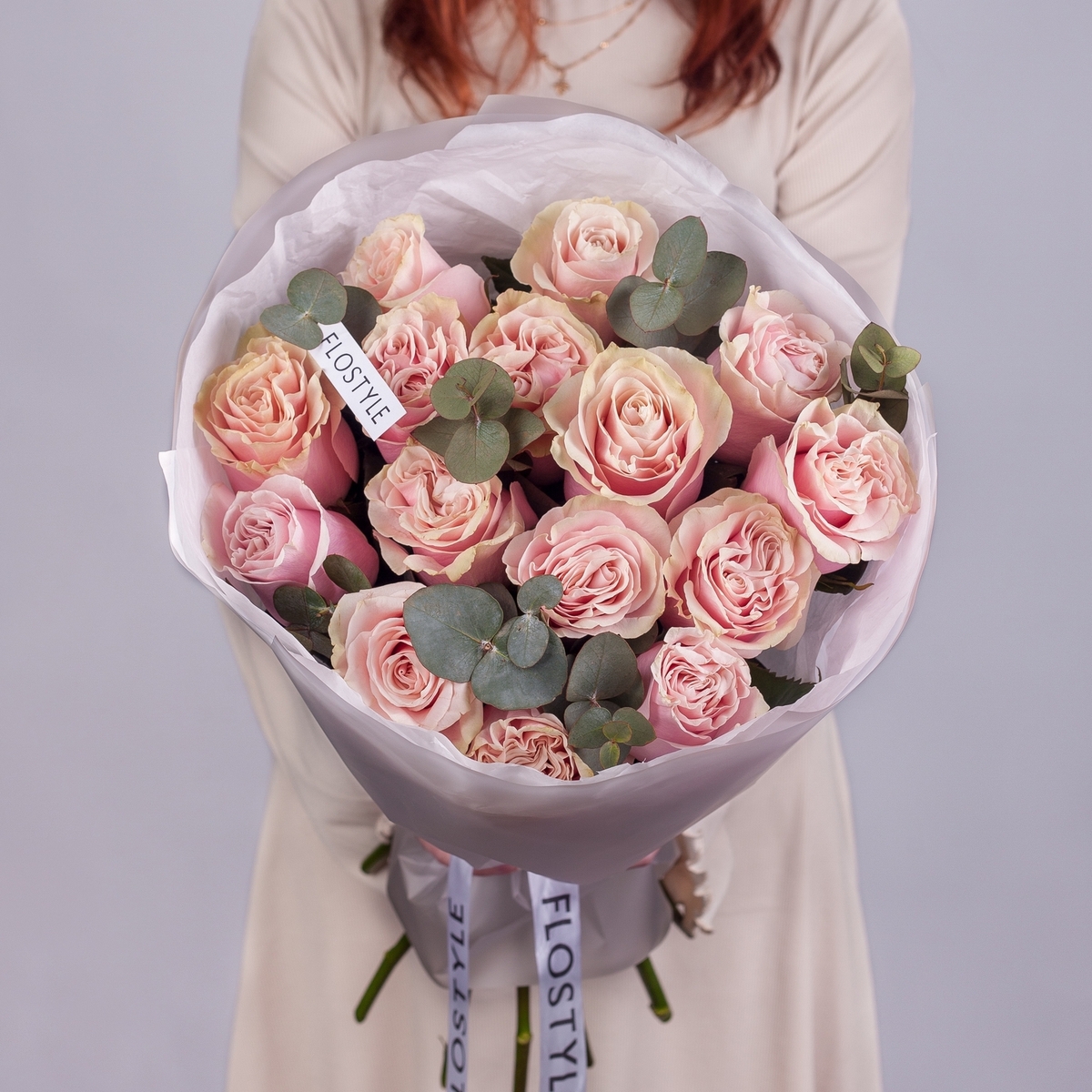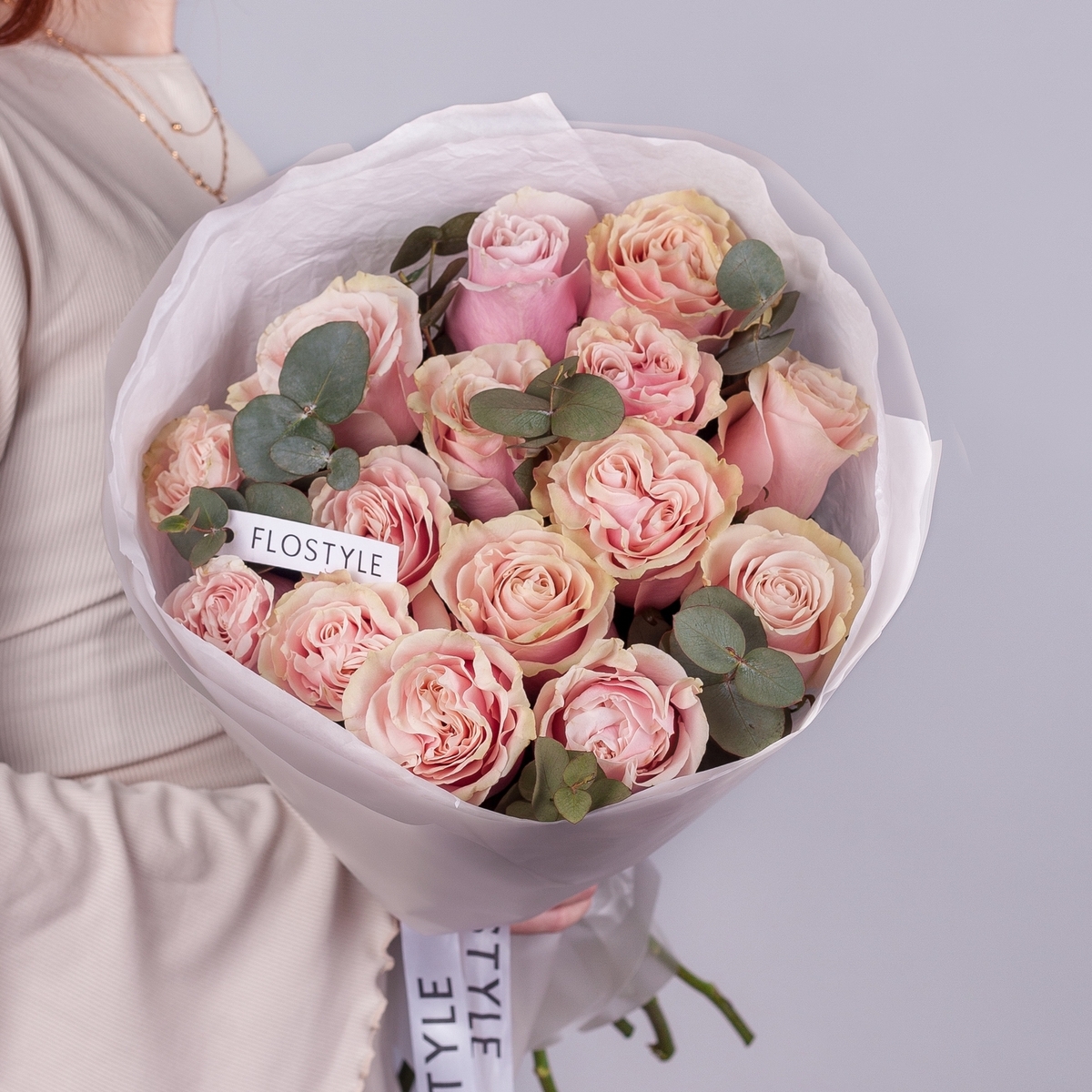 Состав: Роза Pink Mondial - 15 шт, Эвкалипт - 0,5 шт, Тишью белое, Упаковка матовая белая пленка кругом