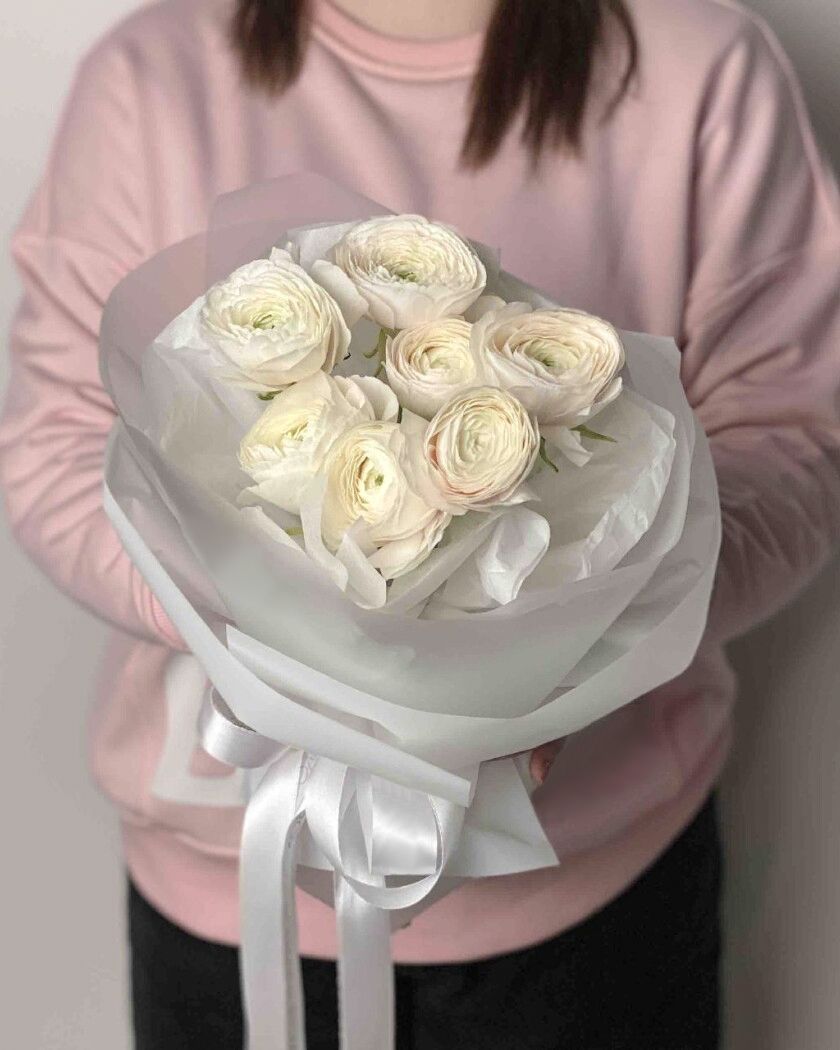 Состав: Ранункулюс - 7 шт, Тишью белое, Матовая пленка прозрачная кругом