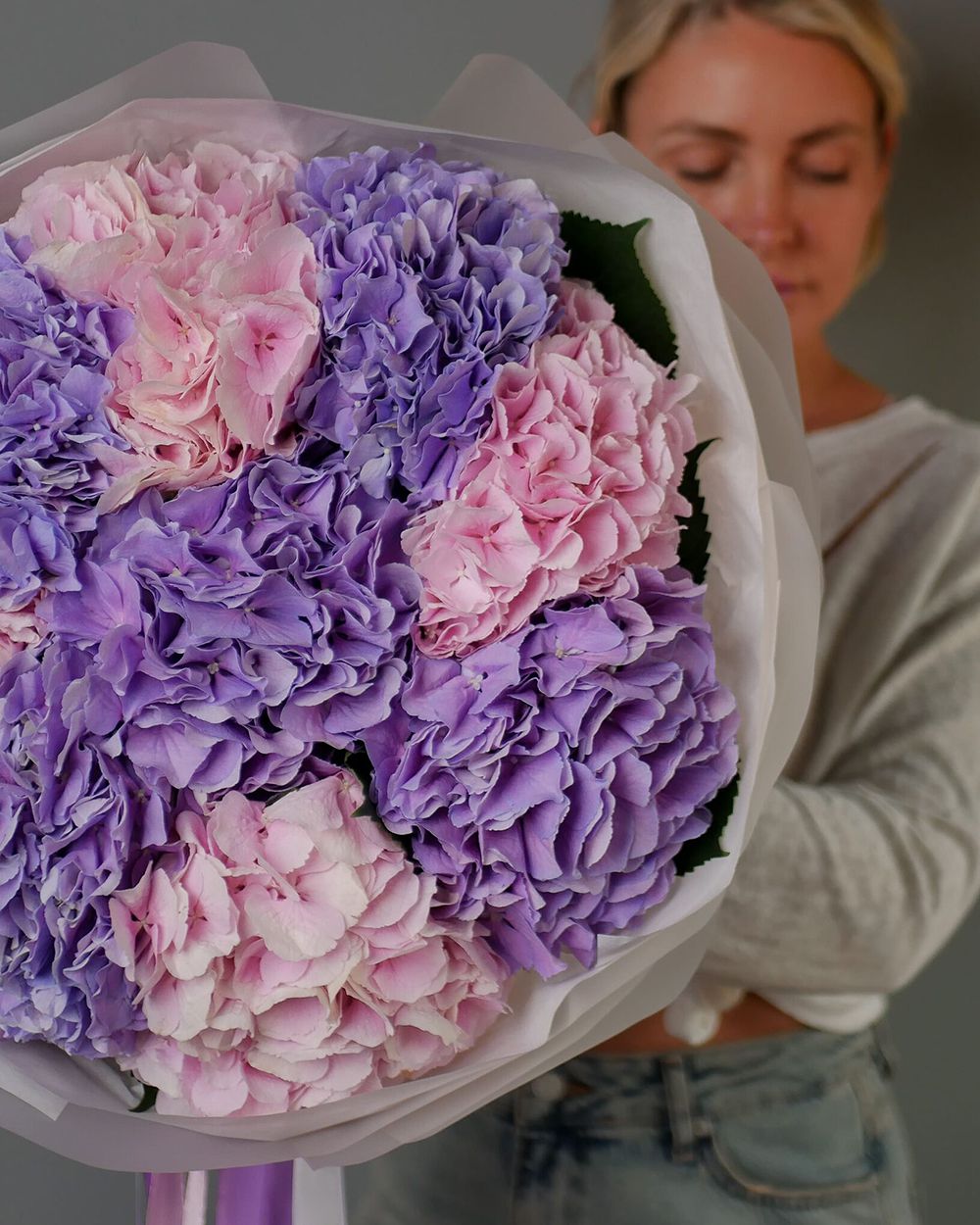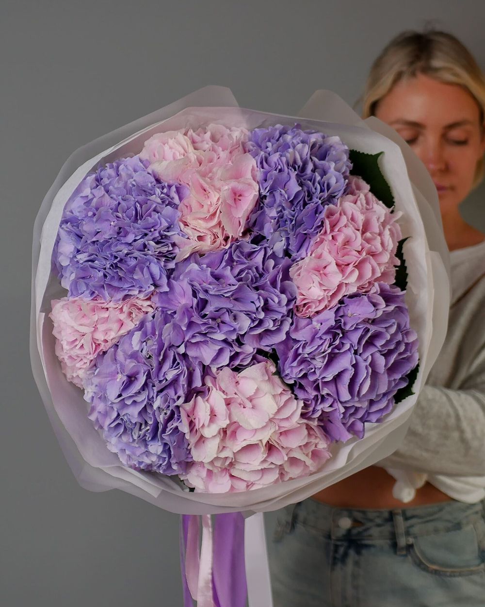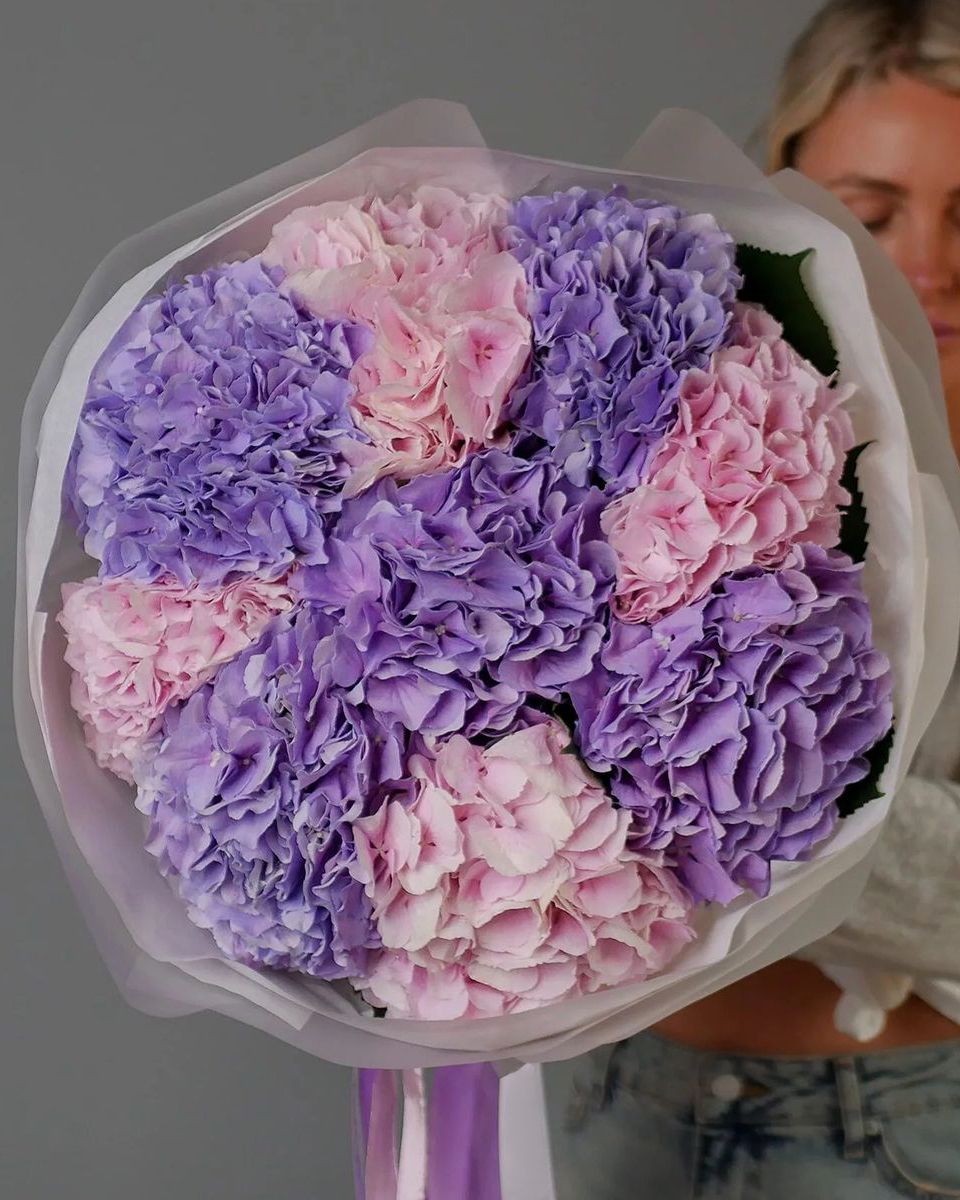 Состав: Гортензия Mix (Pink, Purple) - 9 шт, Тишью белая, Матовая пленка белая кругом
