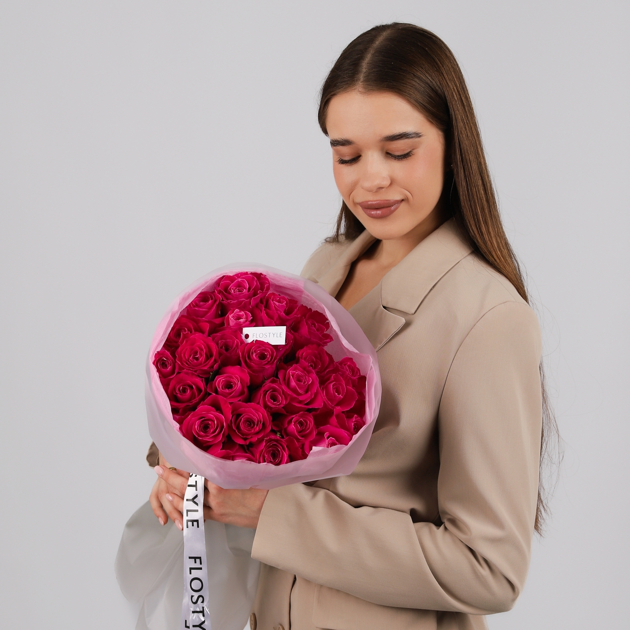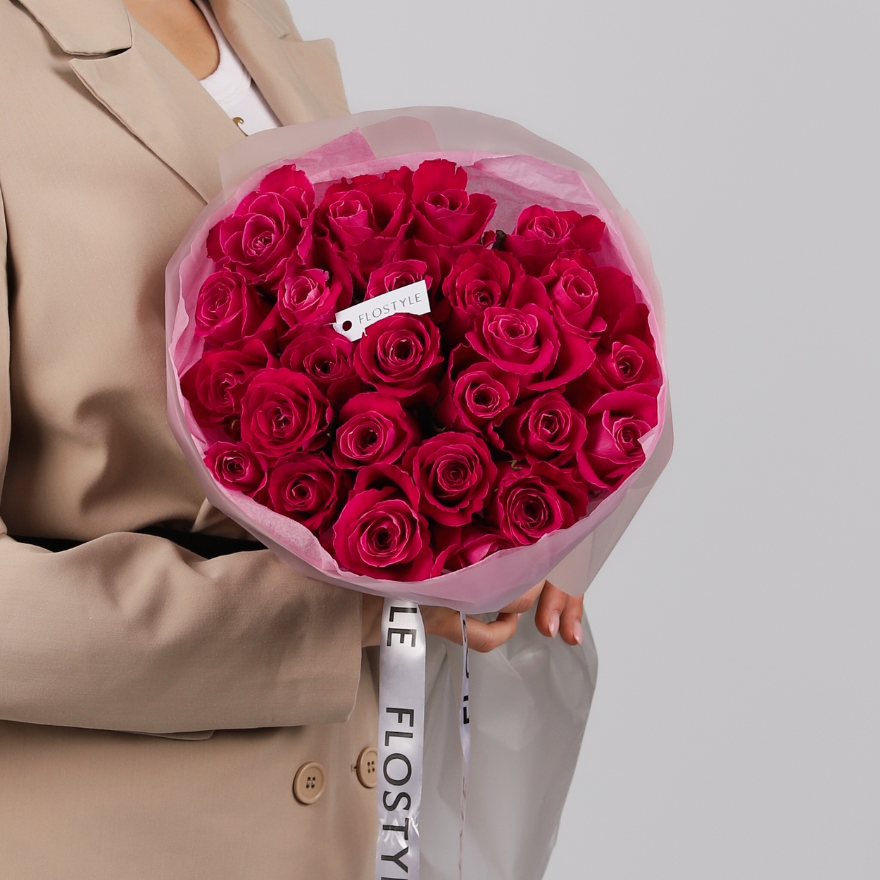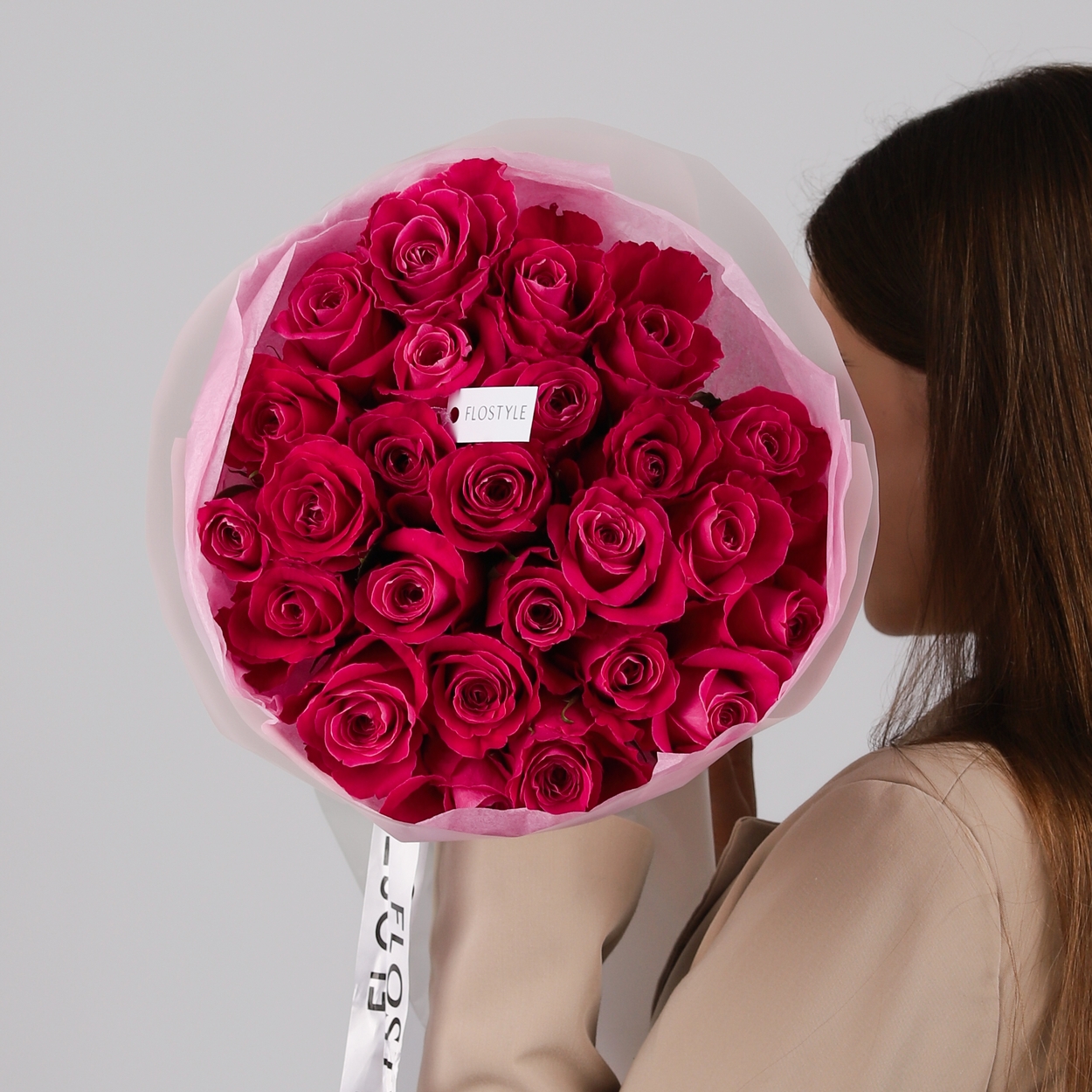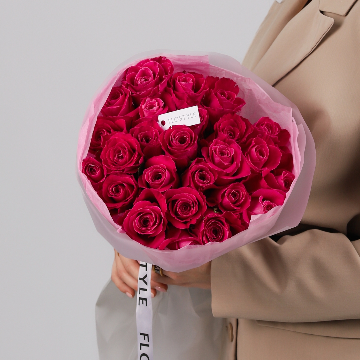 Состав: Роза Pink - 25 шт, Тишью розовая, Матовая пленка белая кругом
