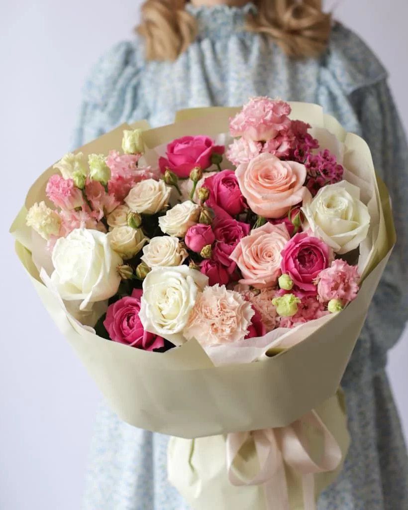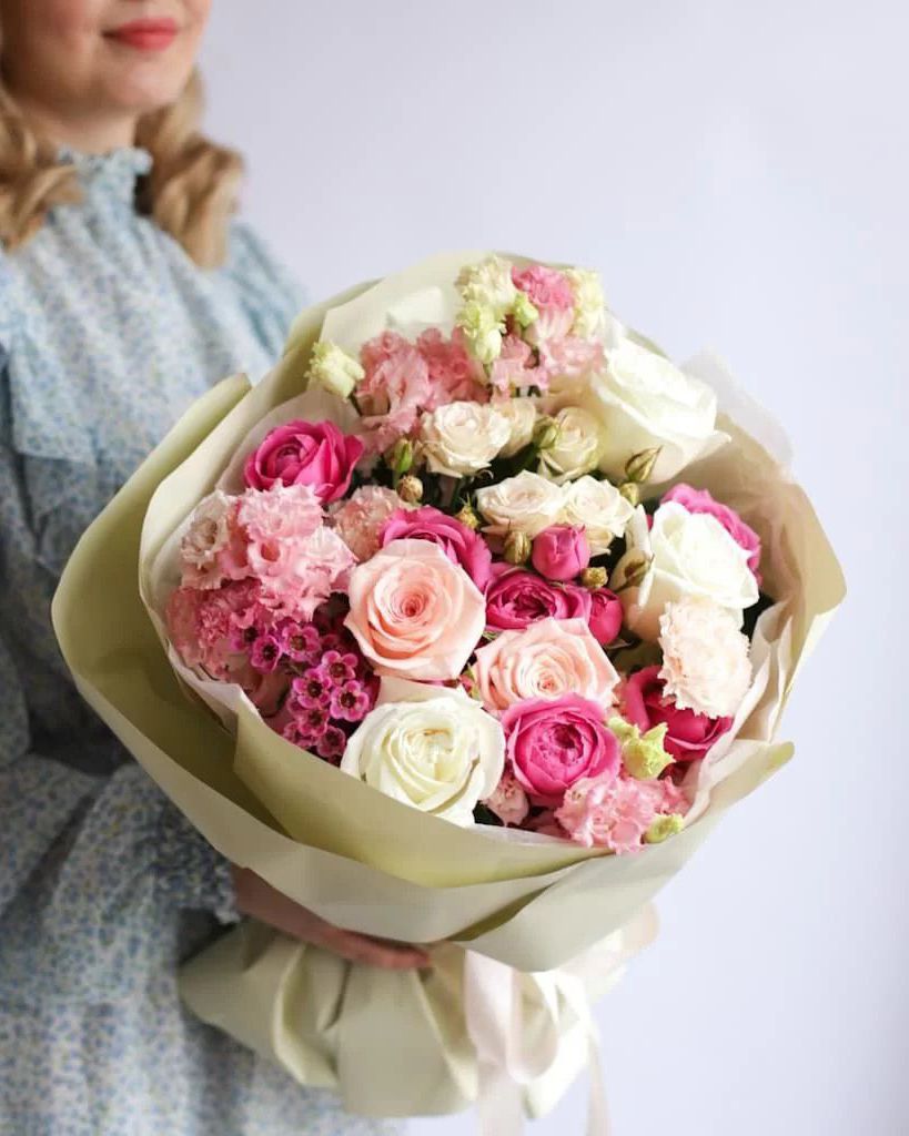 Состав: Роза Playa Blanca - 3 шт, Роза Pink - 2 шт, Роза кустовая Clas sensation - 3 шт, Роза кустовая Royal Porcelina - 1 шт, Эустома Pink - 3 шт, Диантус Brut - 3 шт, Хамелациум - 1 шт, Тишью белая, Матовая пленка бежевая кругом