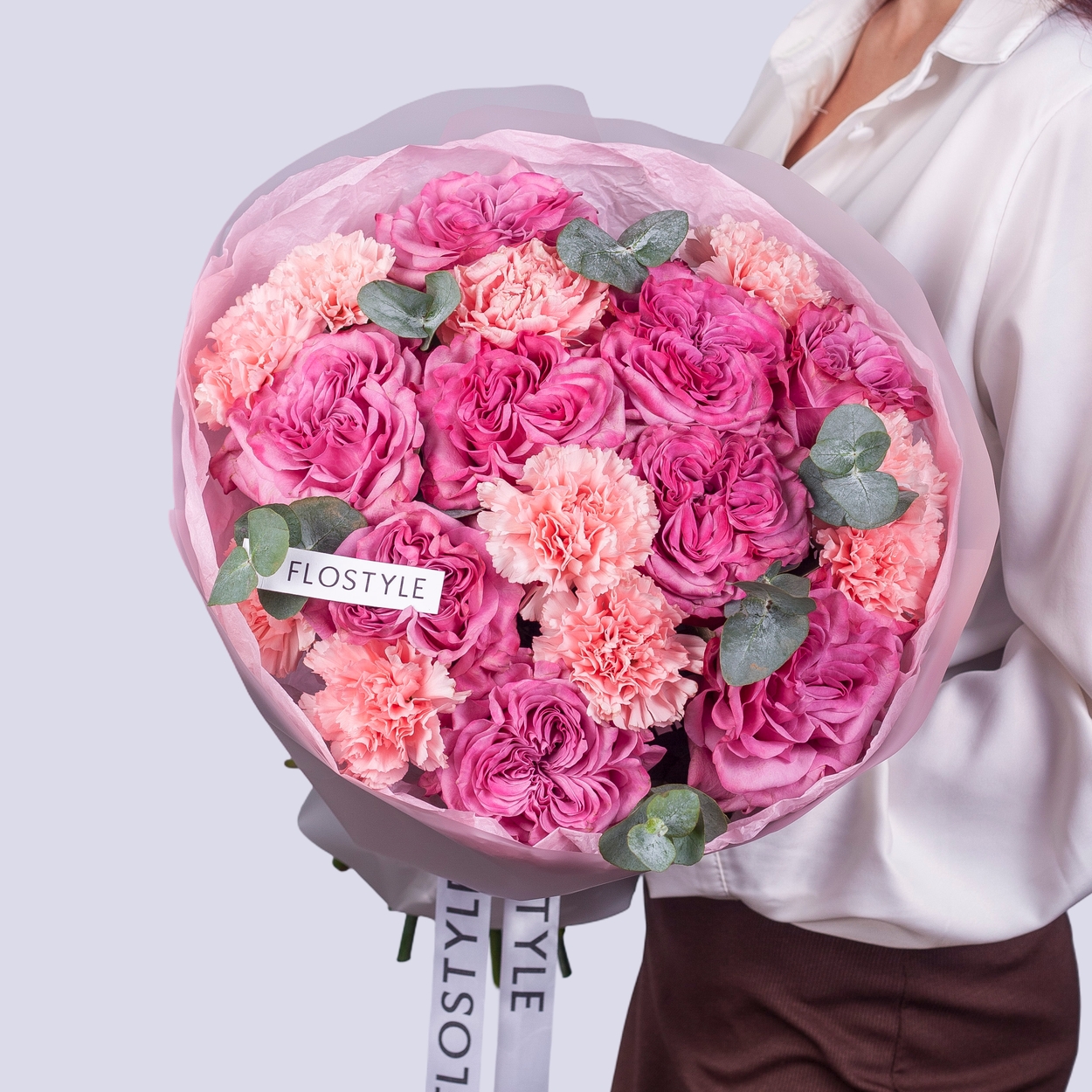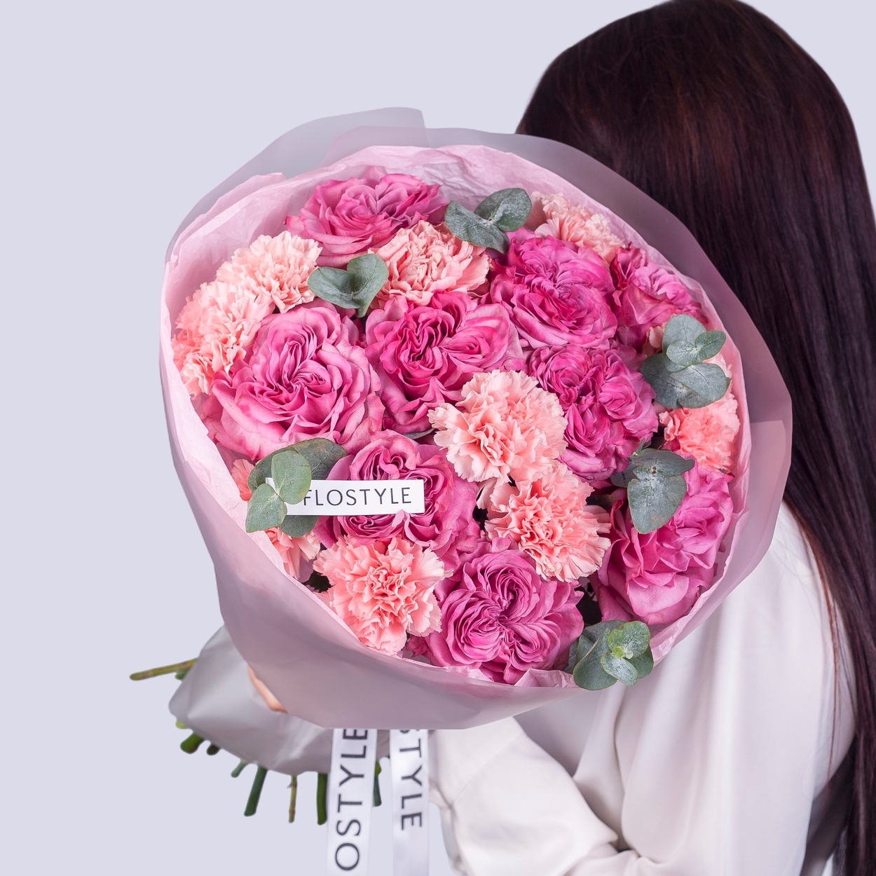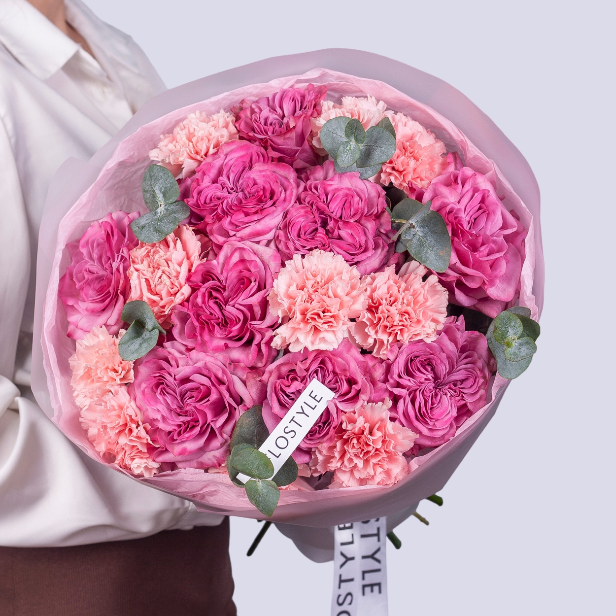 Состав: Роза Country Blues - 9 шт, Диантус Pink - 8 шт, Эвкалипт - 0,5 шт, Тишью розовая, Матовая пленка белая кругом