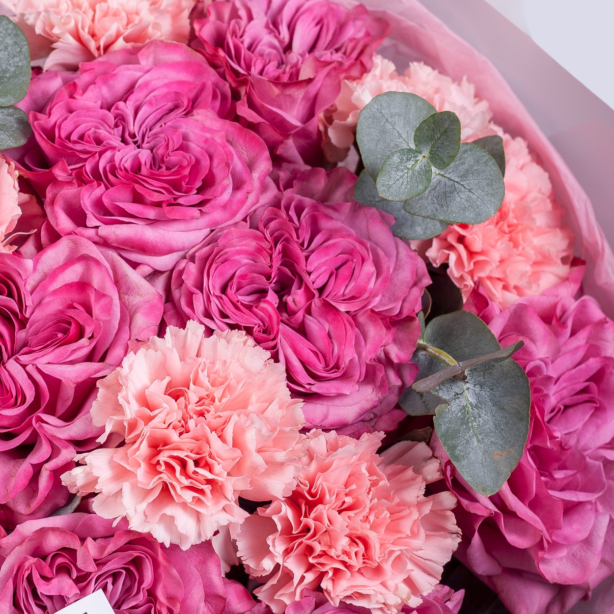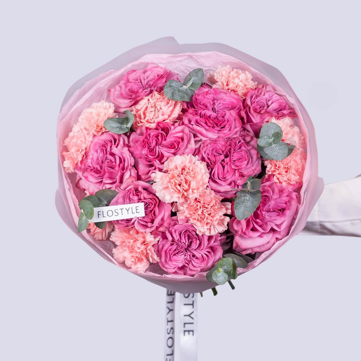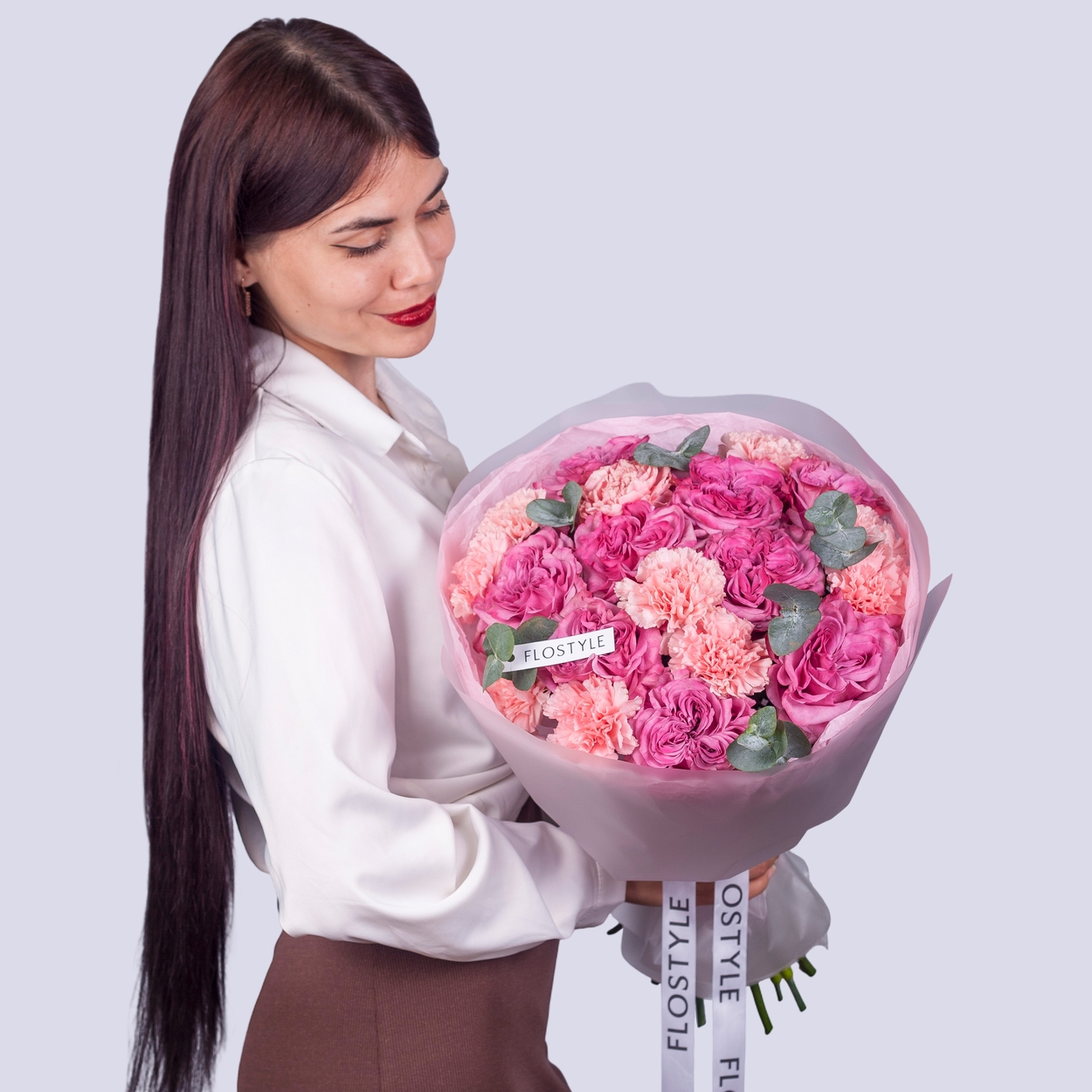 Состав: Роза Country Blues - 9 шт, Диантус Pink - 8 шт, Эвкалипт - 0,5 шт, Тишью розовая, Матовая пленка белая кругом