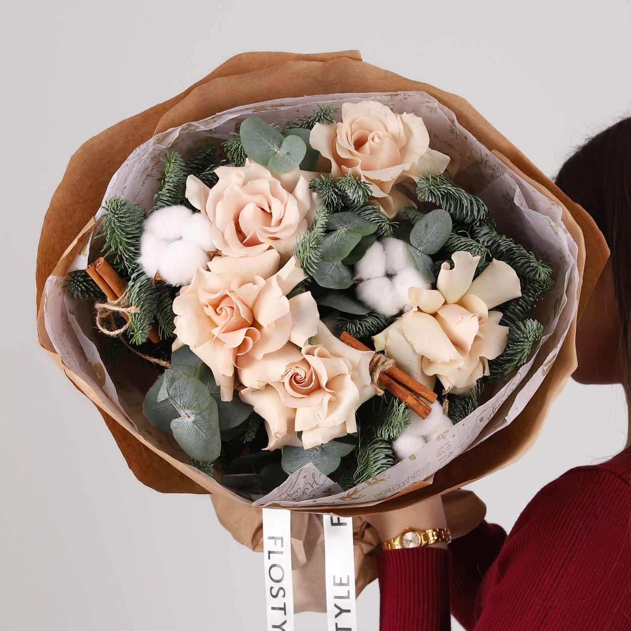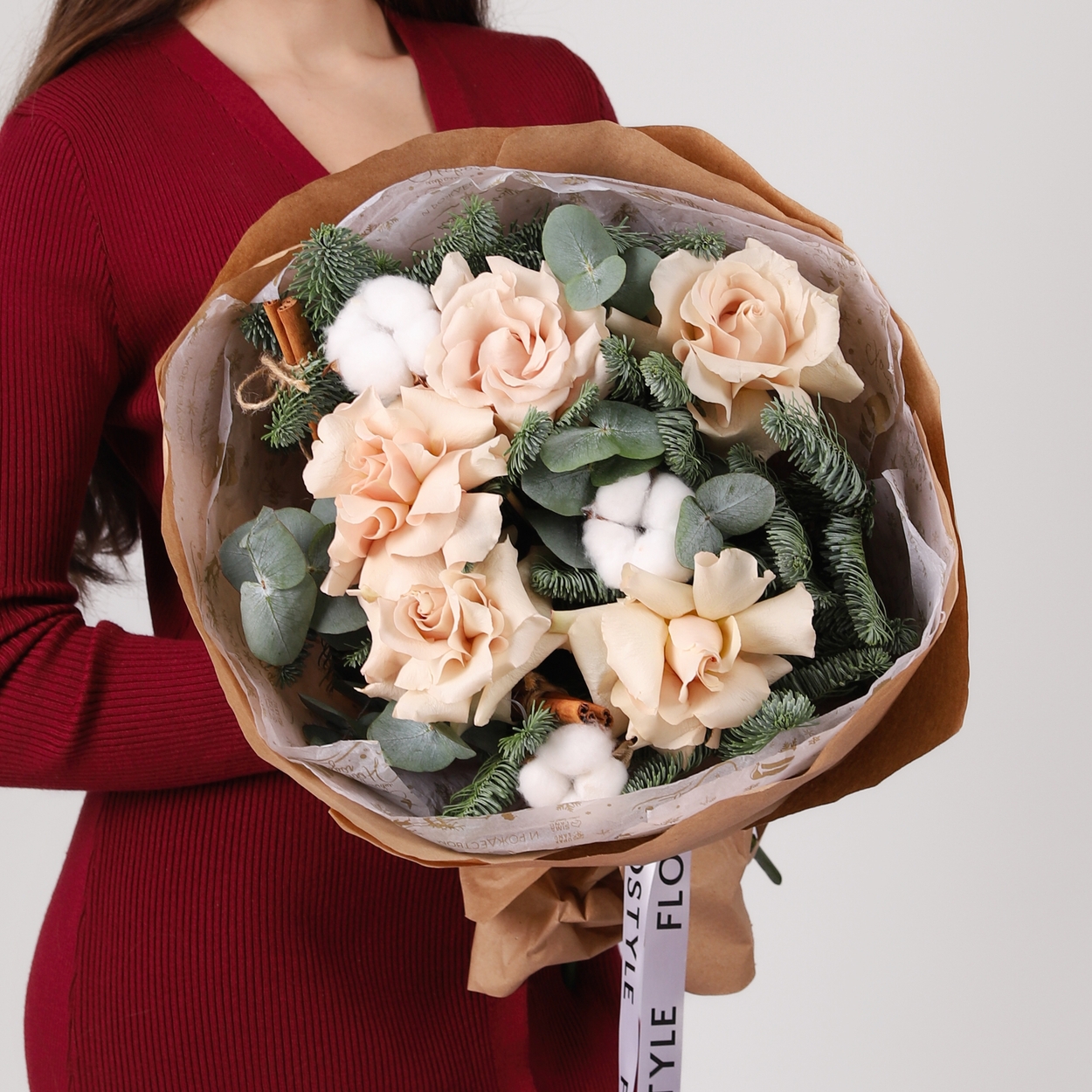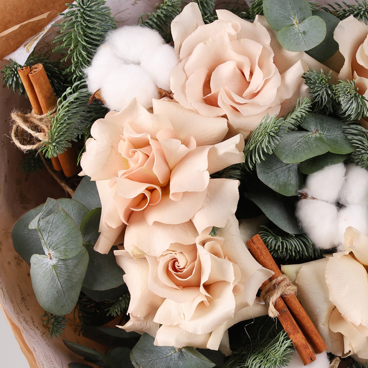 Состав: Роза Quicksand французская - 5 шт, Хлопок - 3 шт, Корица - 2 шт, Нобилис - 1 шт, Эвкалипт - 0,5 шт, Тишью белая, Крафт бумага