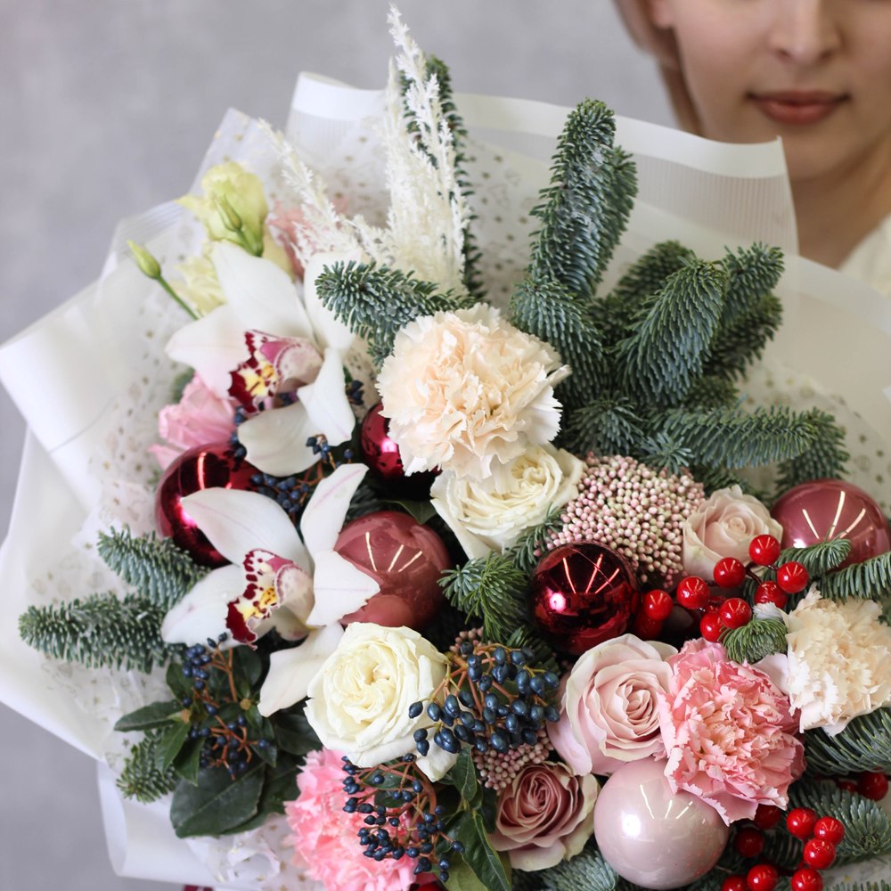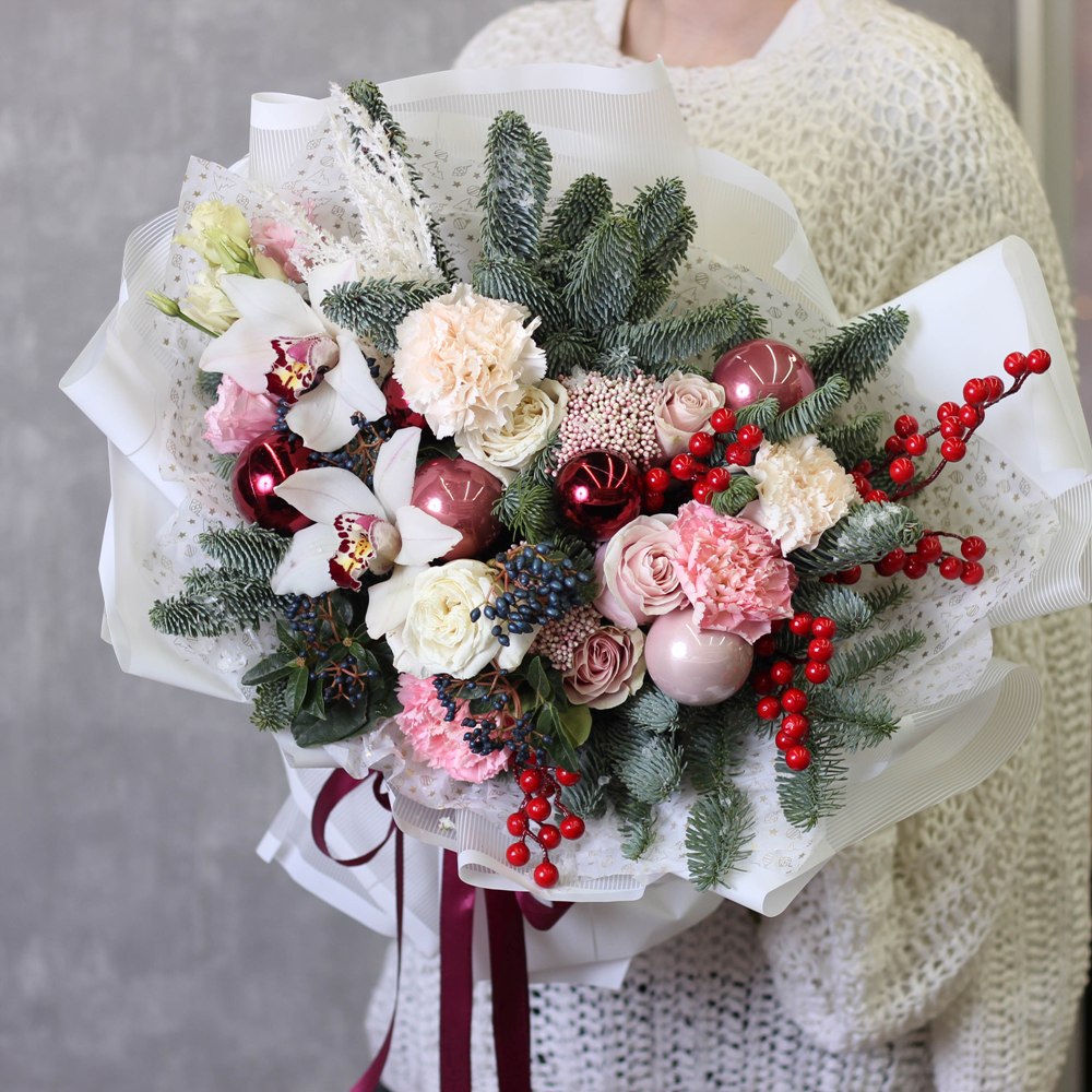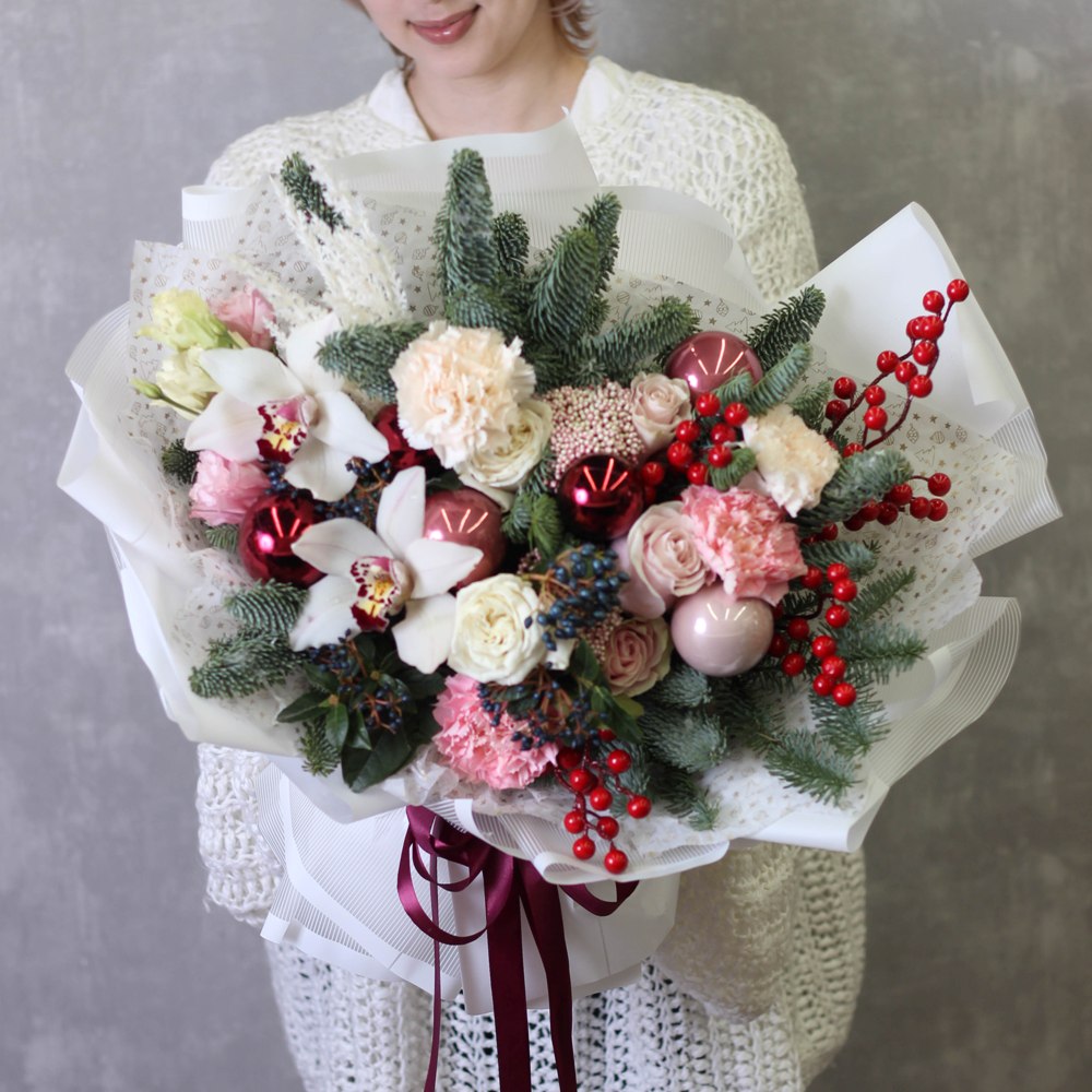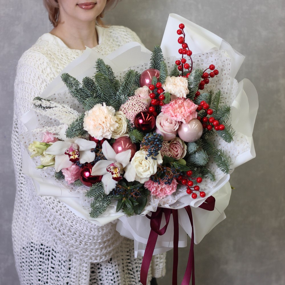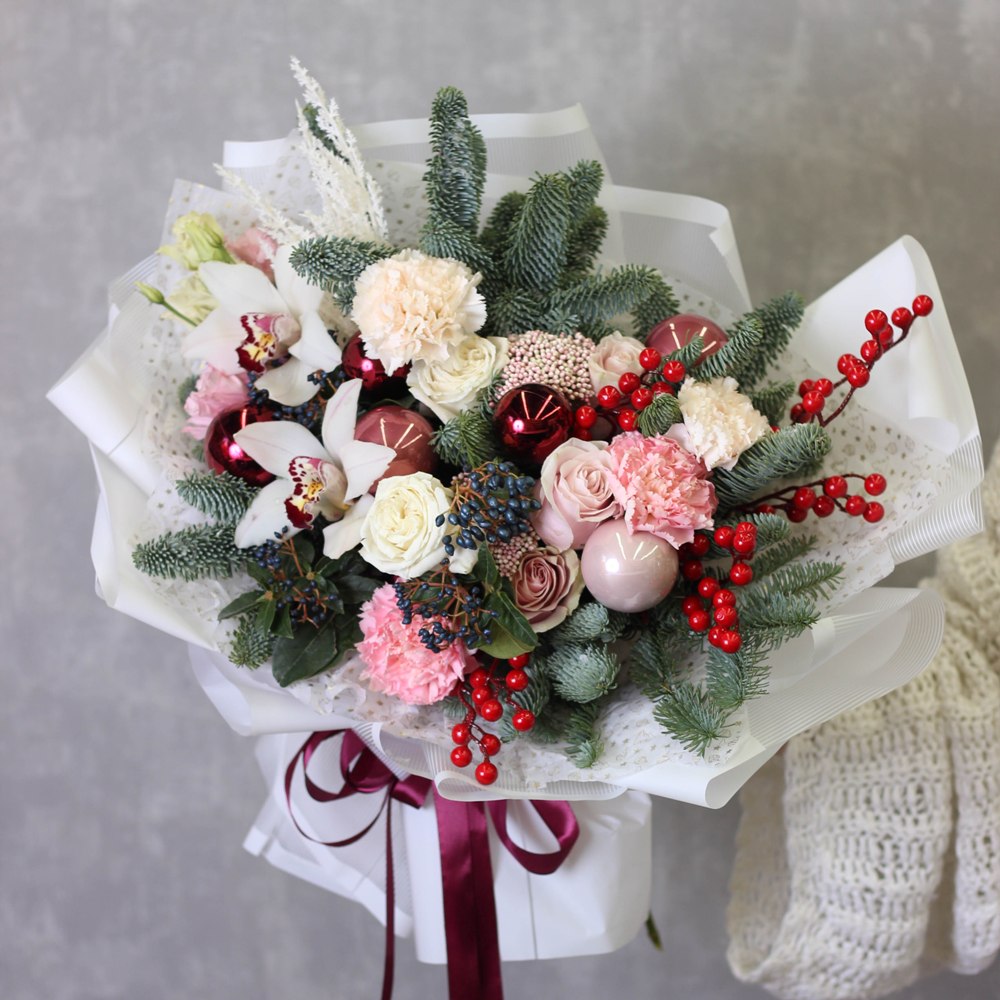 Состав: Нобилис — 2 шт, Роза Playa Blanca — 2 шт, Роза Frutteto — 3 шт, Вибурнум — 3 шт, Орхидея White — 2 шт, Диантус Pink/Apple Tea — 3 шт, Эустома Pink — 1 шт, Озотамнус — 2 шт, Кортдерия стаб — 1 шт, Декоративные ягоды — 3 ветки, Шар больш — 7 шт, Тишью новогодний, Матовая пленка белая прозрачная складками