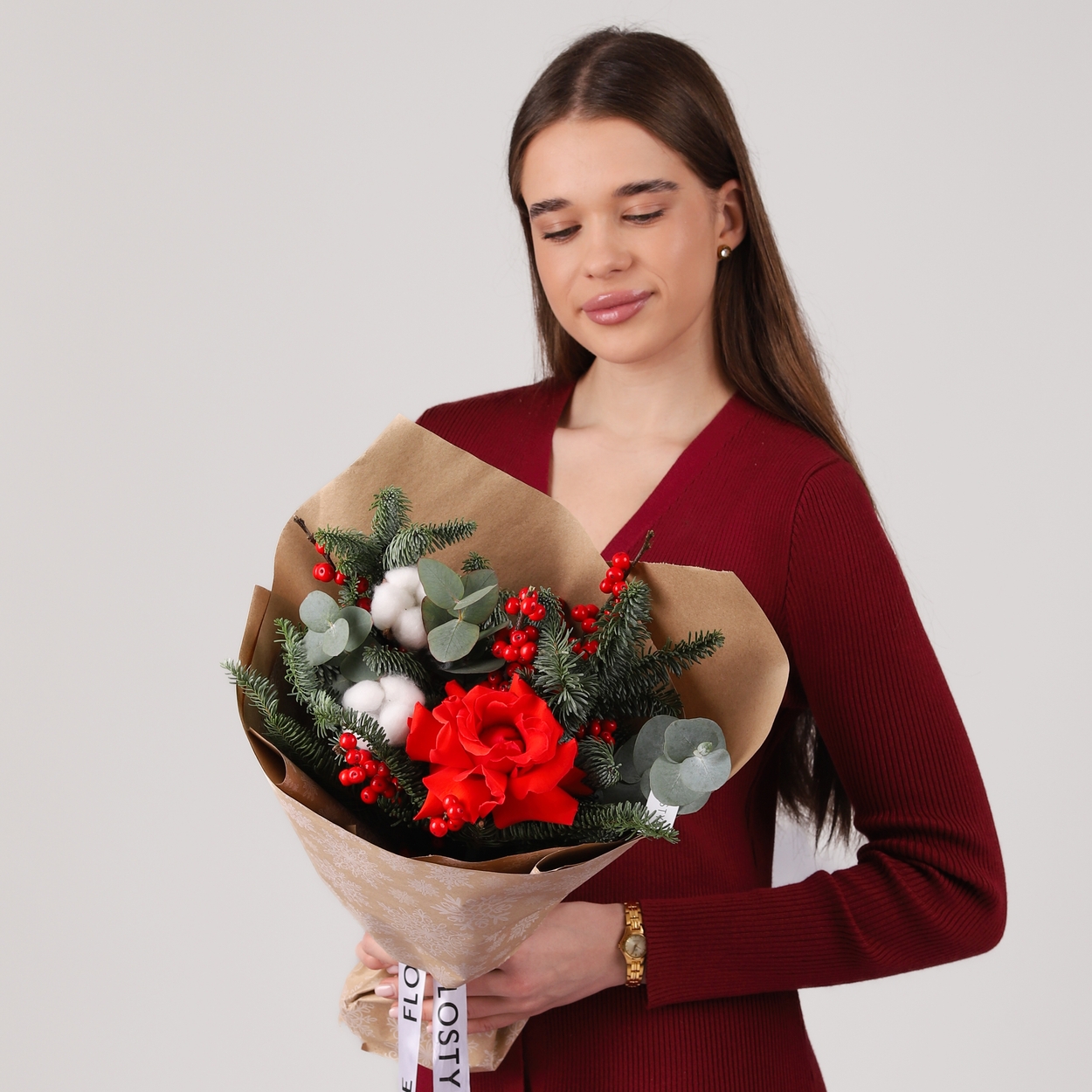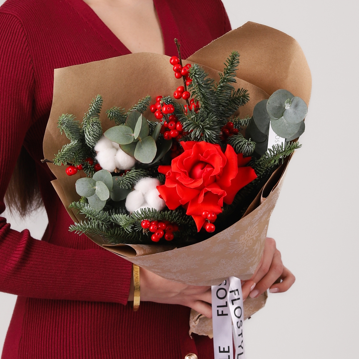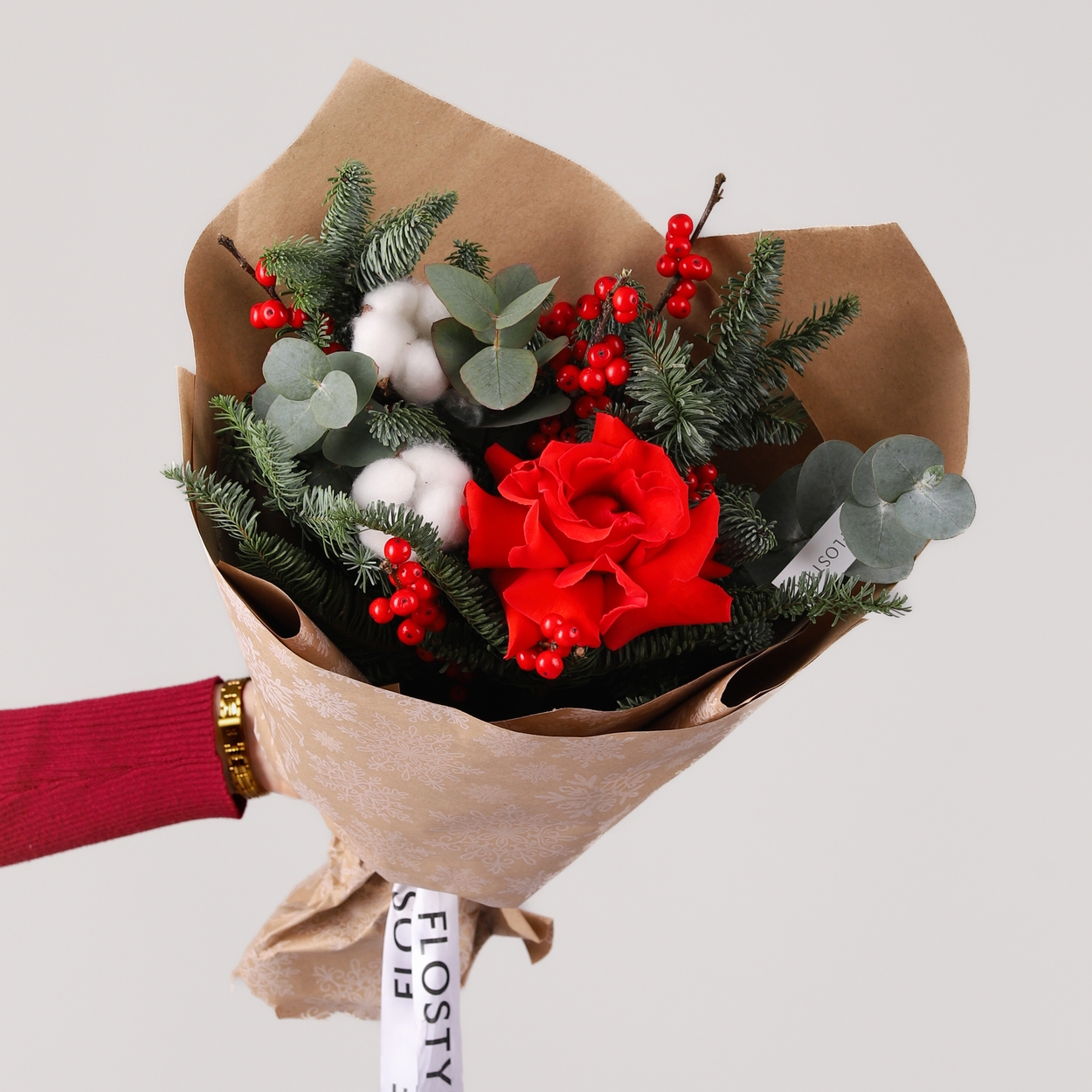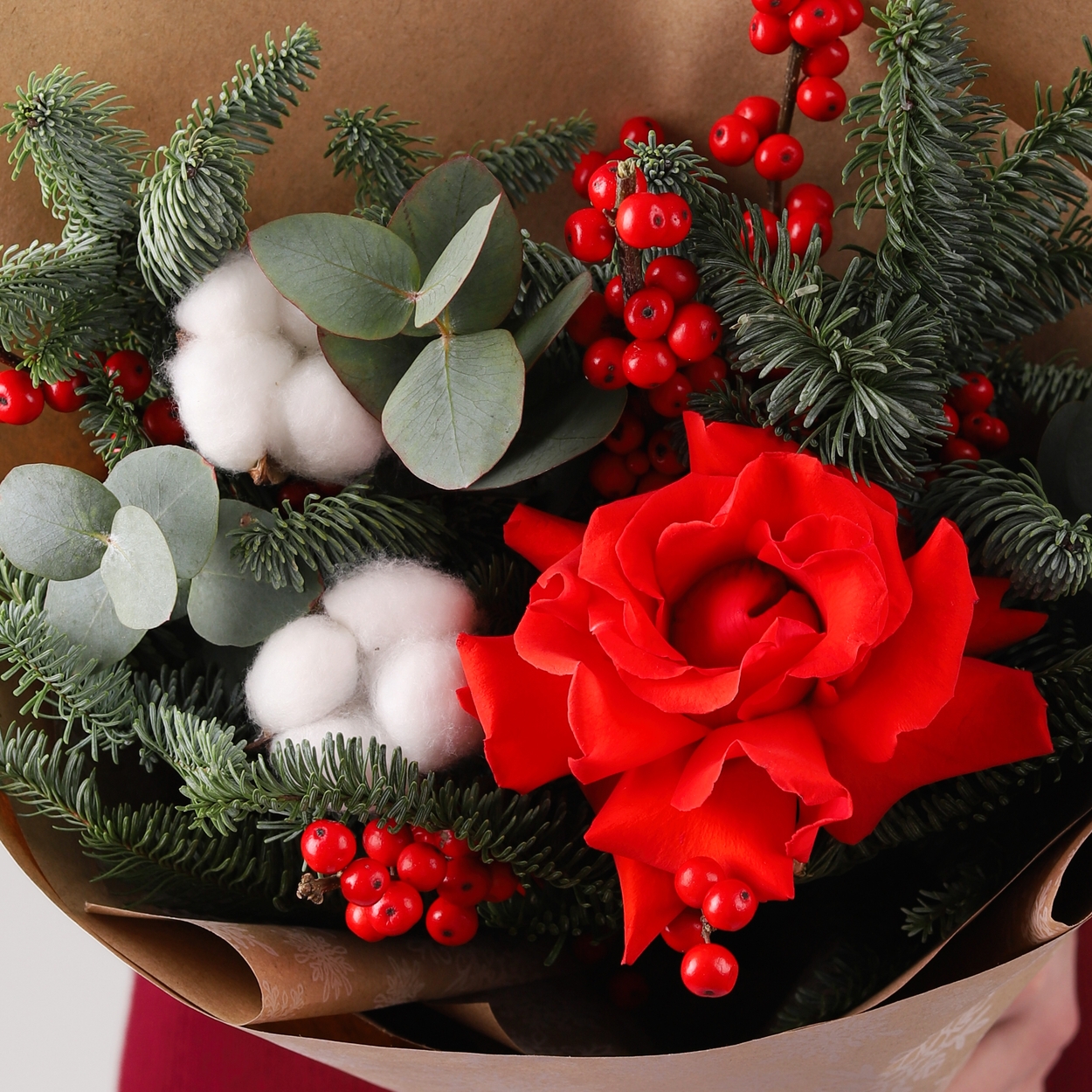 Состав: Роза Nina французская - 1 шт, Хлопок - 2 шт, Илекс - 1 шт, Эвкалипт - 0,5 шт, Нобилис - 0,5 шт
