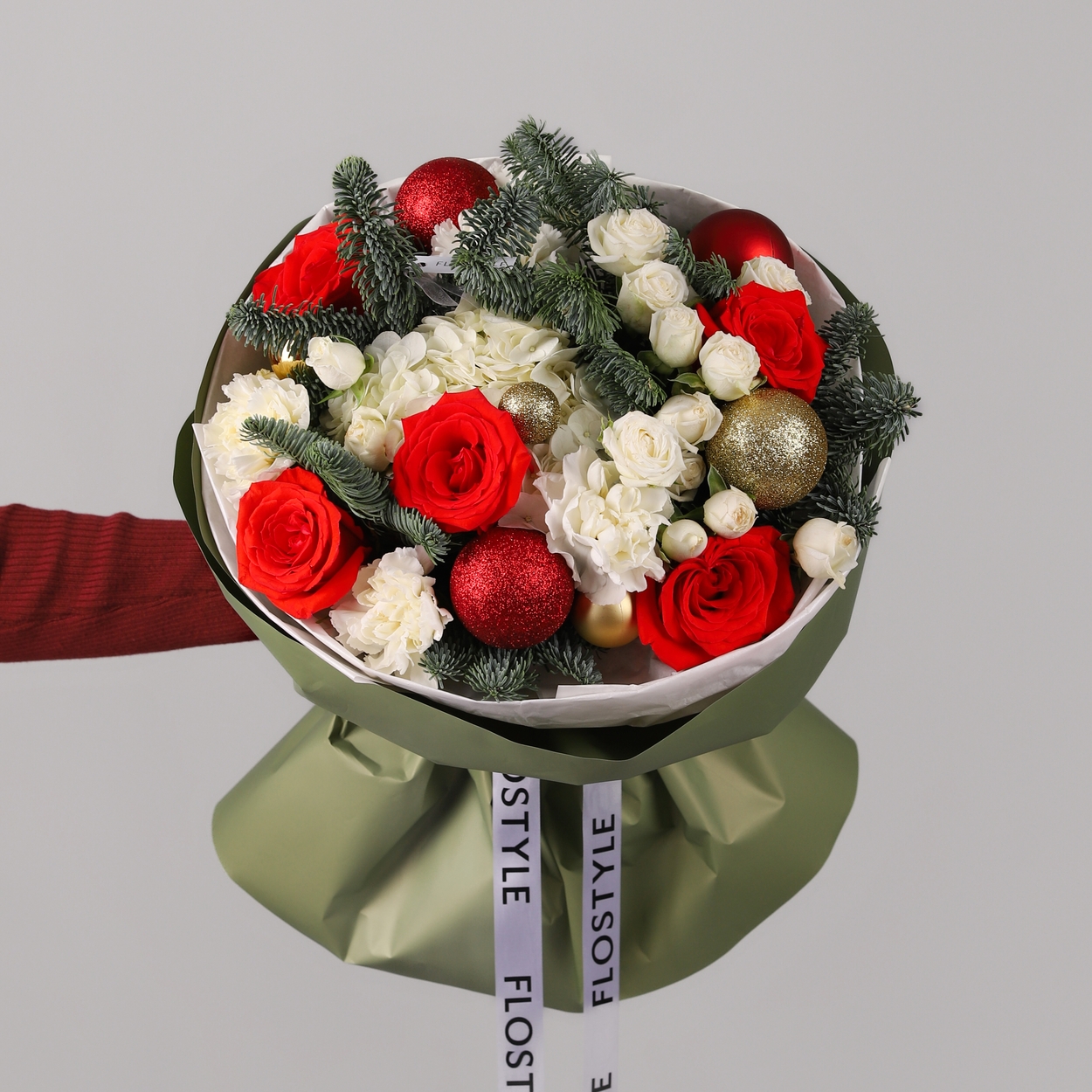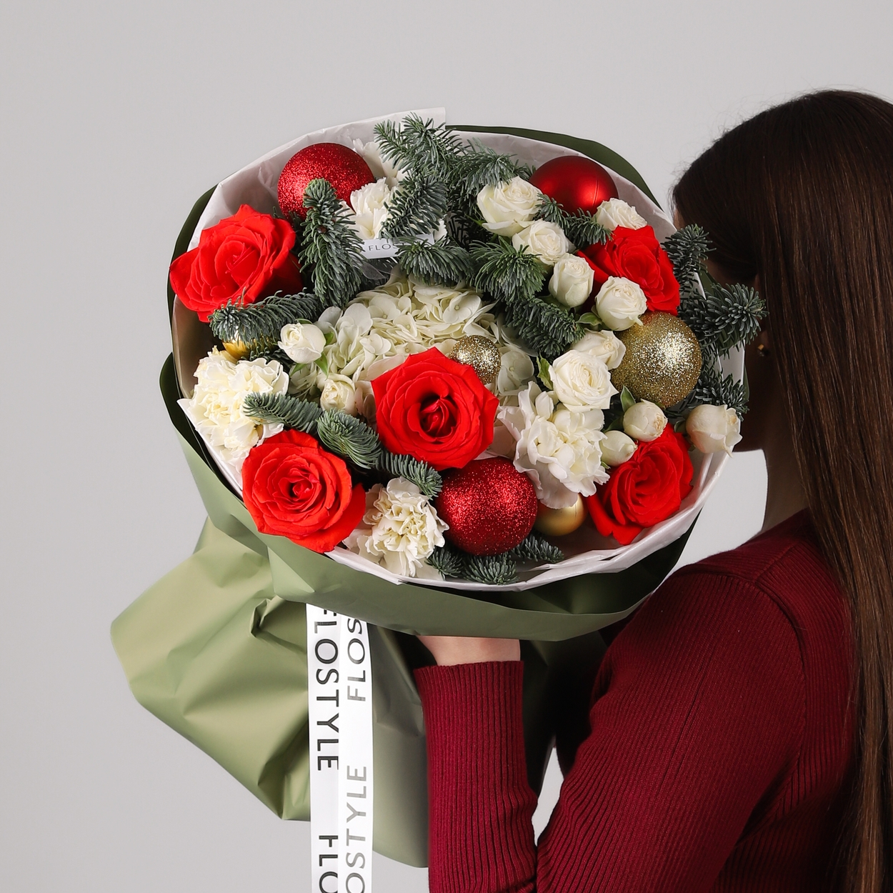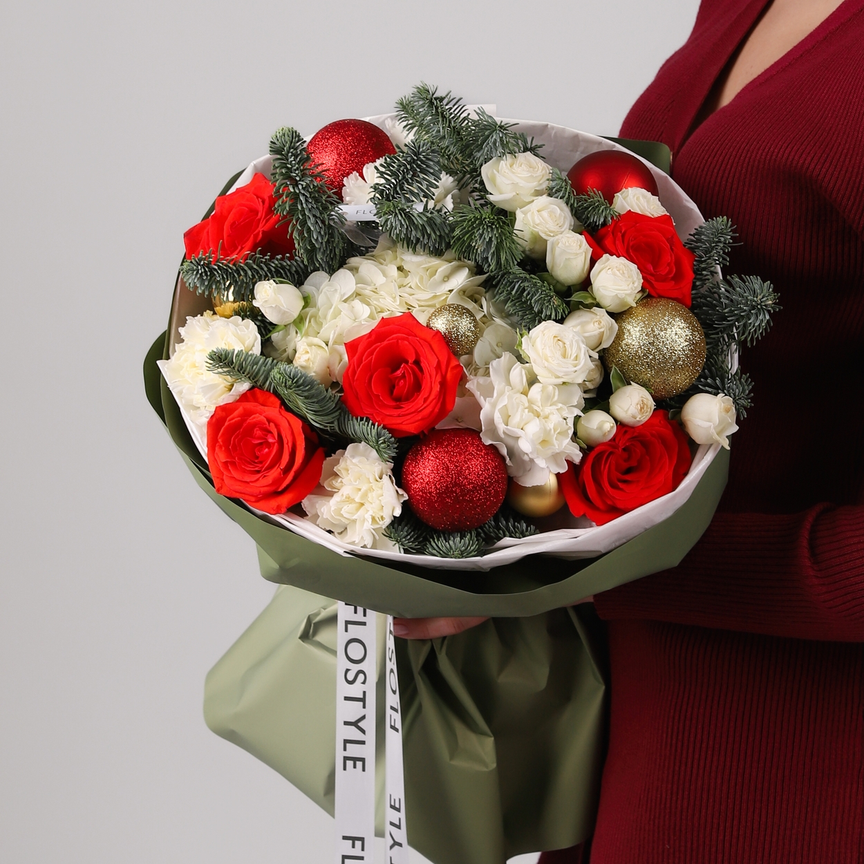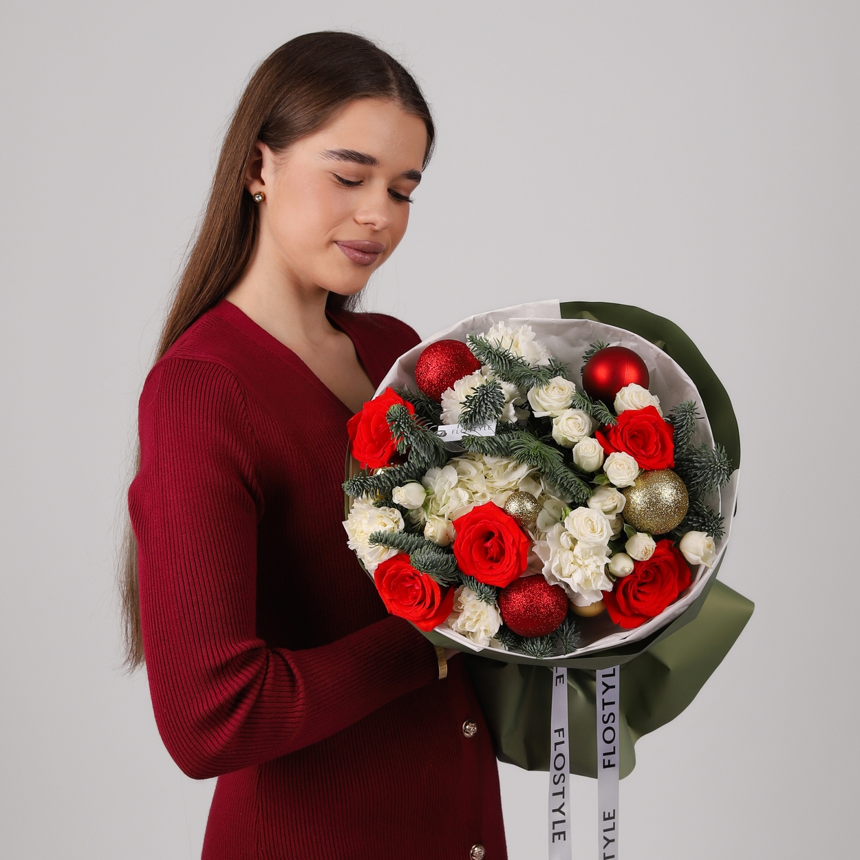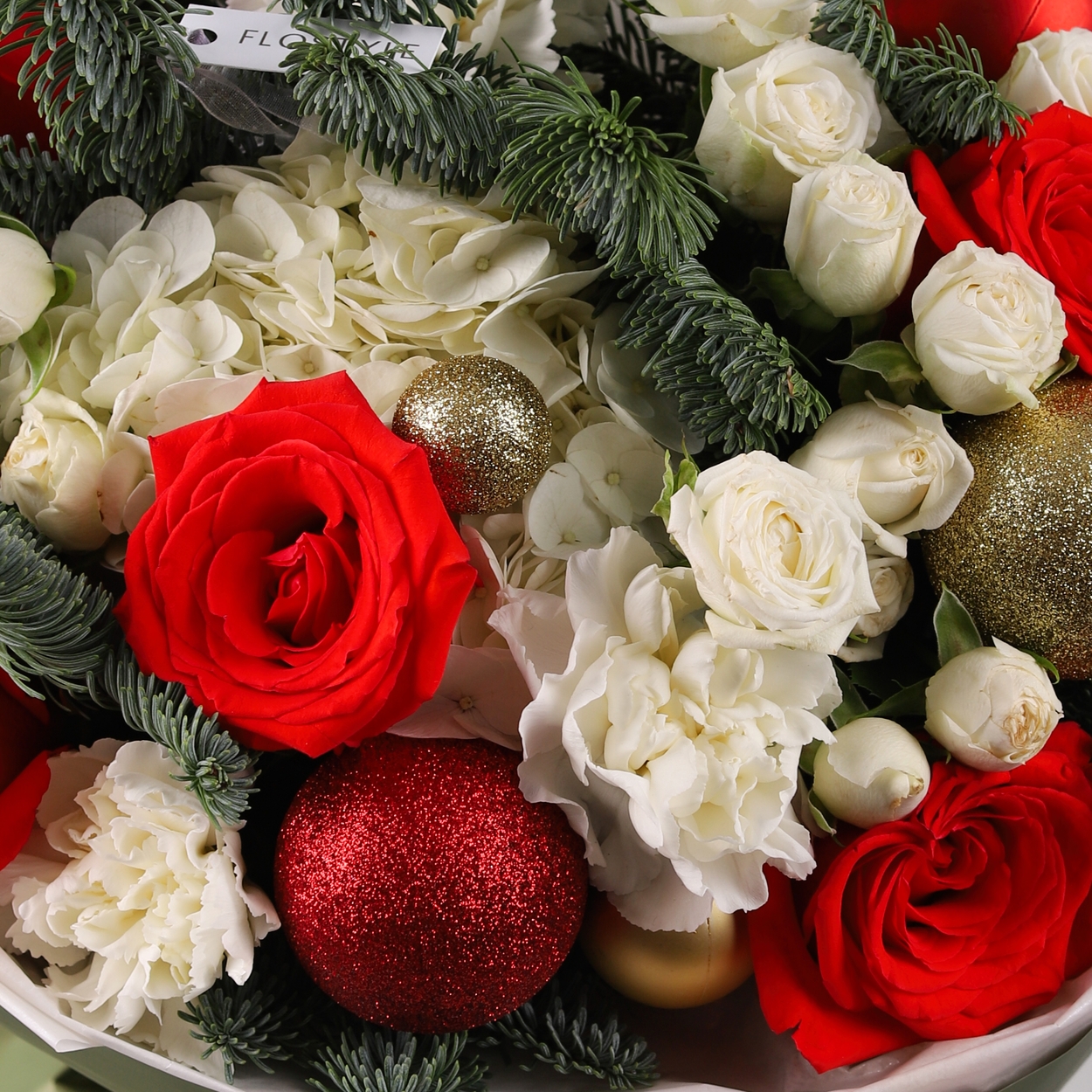 Состав: Роза Nina - 5 шт, Шар большой - 4 шт, Шар маленький - 2 шт, Роза кустовая White - 3 шт, Гортензия White - 1 шт, Диантус White - 5 шт, Нобилис - 0,5 шт, Тишью белая, Матовая пленка хаки кругом