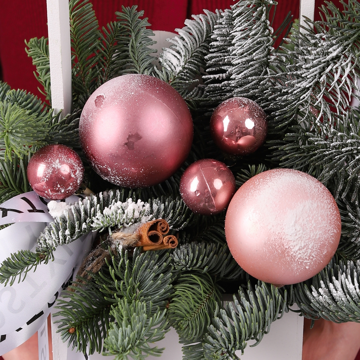 Состав: Ящик S белый, Шар большой - 3 шт, Шар маленький - 4 шт, Шар средний 1 шт, Корица - 2 шт, Нобилис - 0,5 шт, Лента атласная