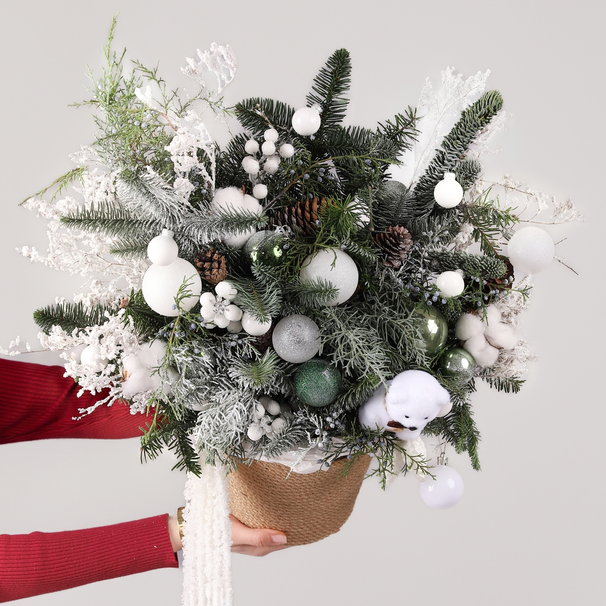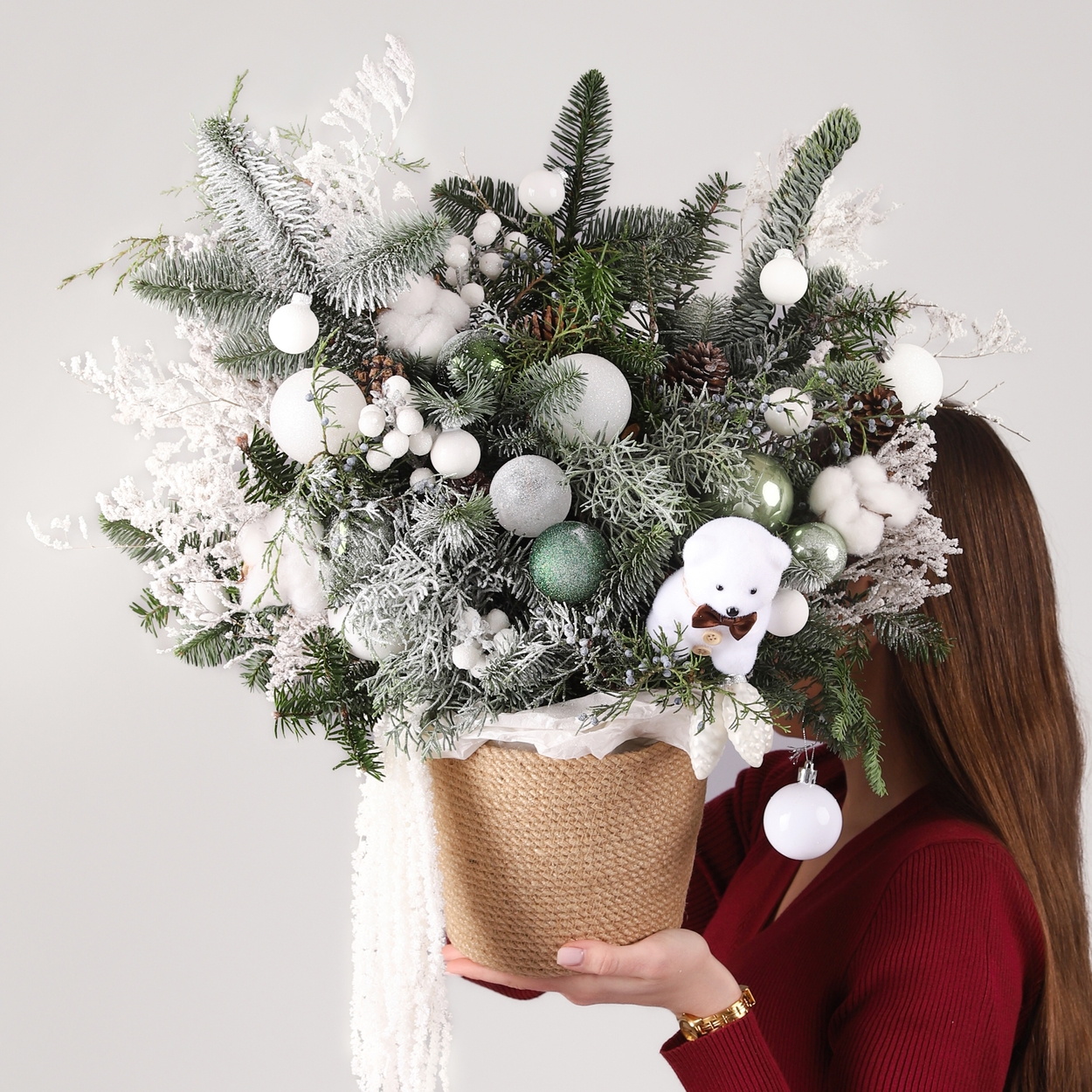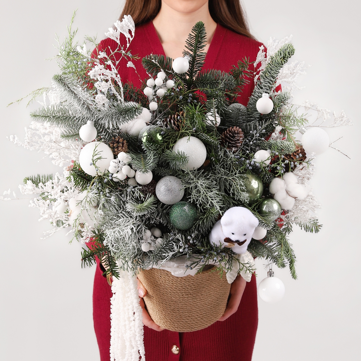 Состав: Кашпо плетенное, Медведь игрушка - 1 шт, Шар большой - 4 шт, Шар средний - 8 шт, Шар маленький - 7 шт, Хлопок - 3 шт, Кипарис - 1 шт, Можжевельник - 1 шт, Шишка сосна - 3 шт, Шишка ель - 2 шт, Белые ягоды - 2 шт, Заснеженные ветки - 3 шт, Амарант - 1 шт