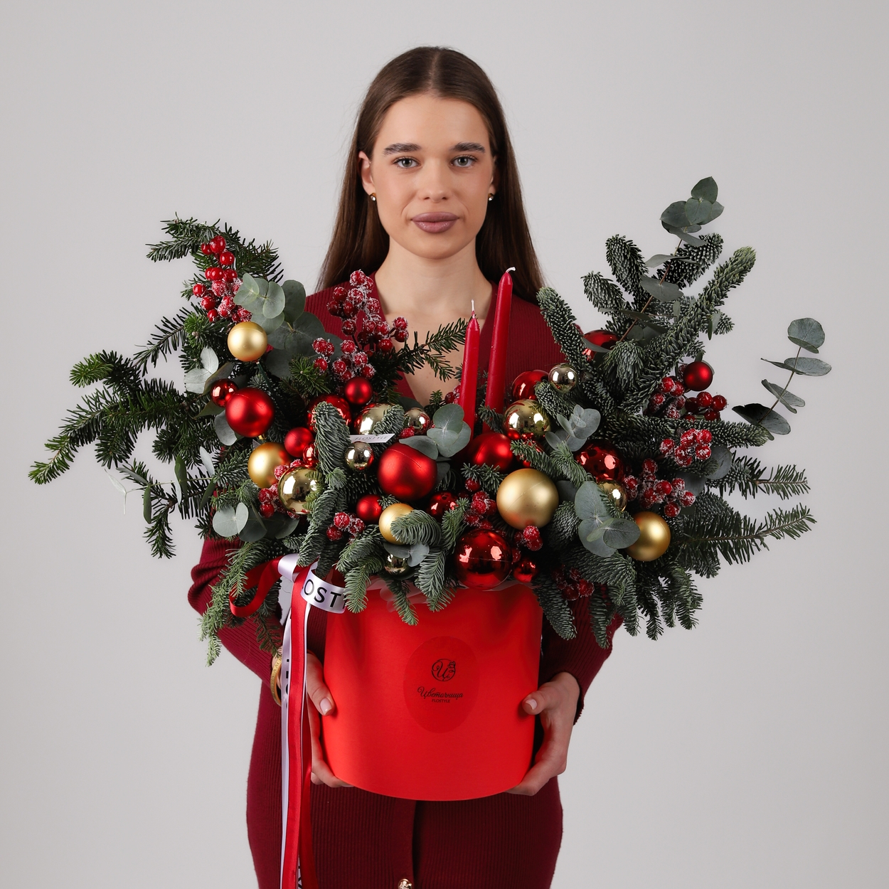 Состав: Коробка L красная, Шар большой - 6 шт, Шар средний - 9 шт, Шар маленький - 10 шт, Ягоды Искусственные - 2 ветки, Свечи - 2 шт, Нобилис - 4 шт, Лента атласная