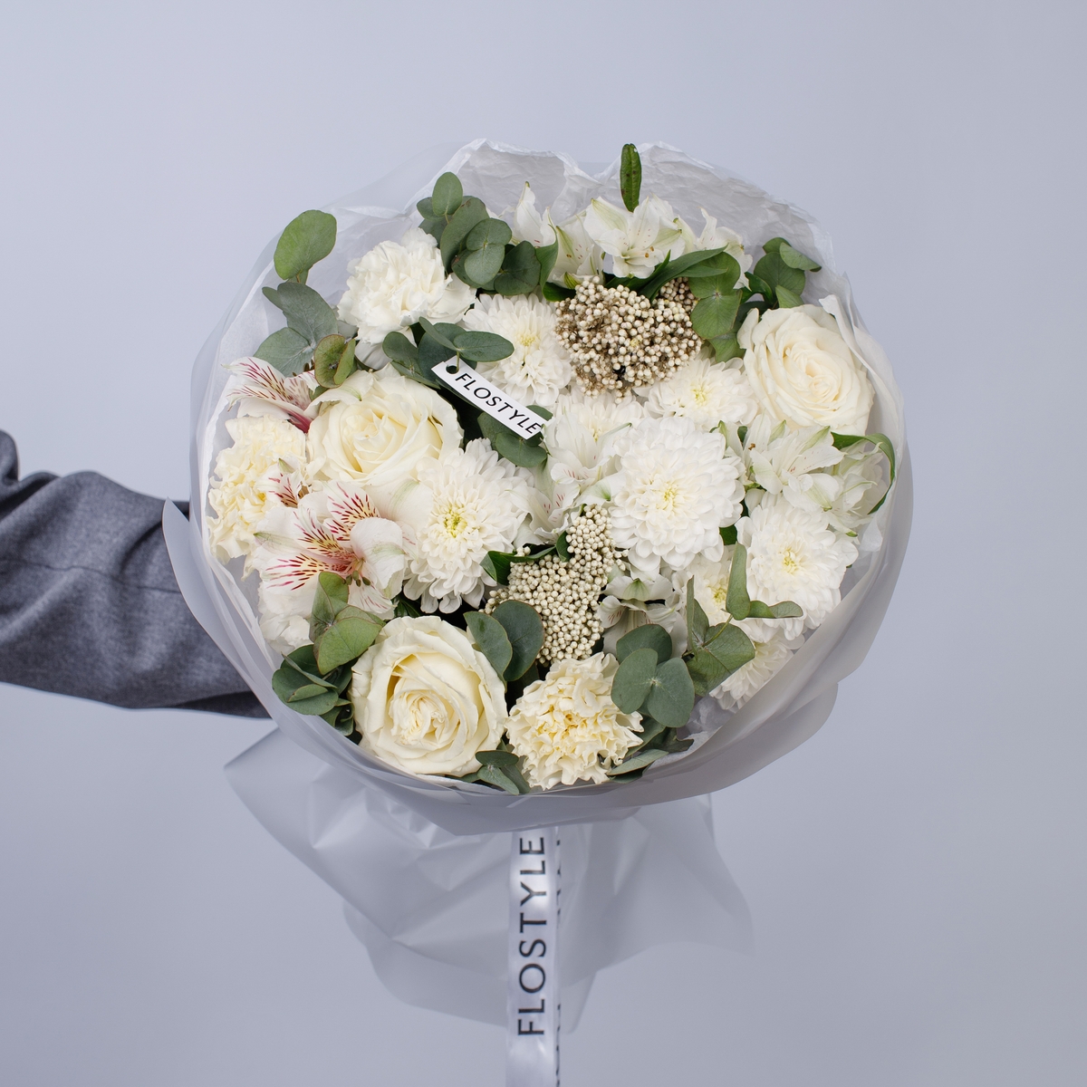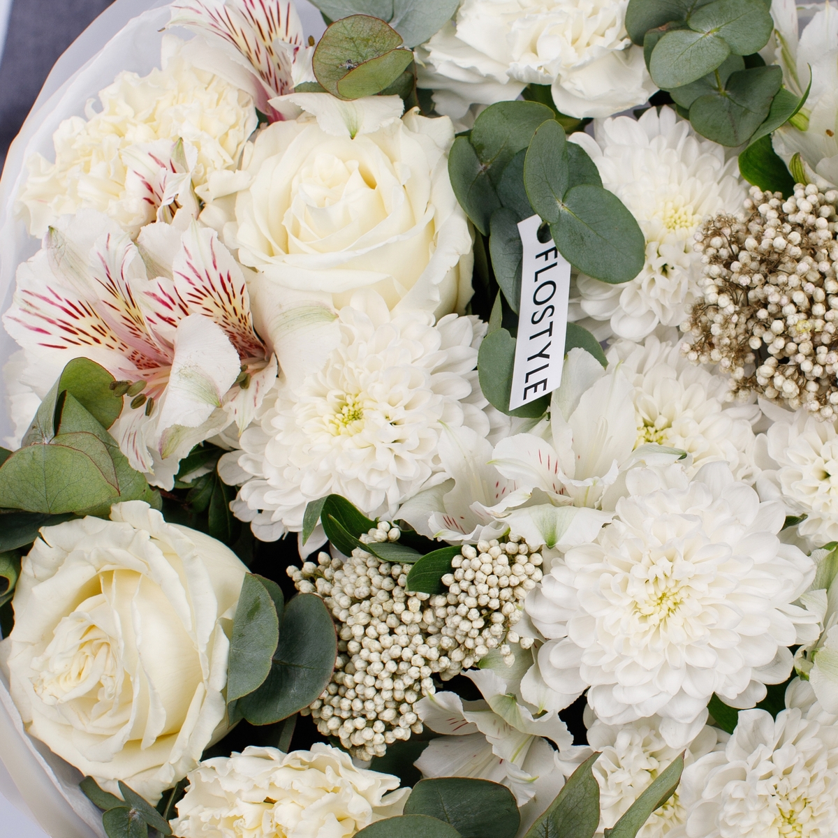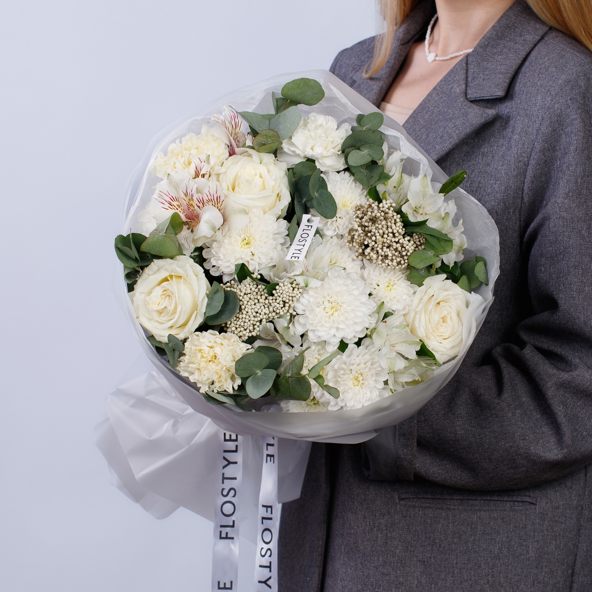 Состав: Роза Playa Blanca - 3 шт, Хризантема Altaj - 2 шт, Альстромерия White - 4 шт, Диантус White - 3 шт, Озотамнус - 2 шт, Фисташка - 1 шт, Эвкалипт - 1 шт, Тишью белая, Матовая пленка белая кругом