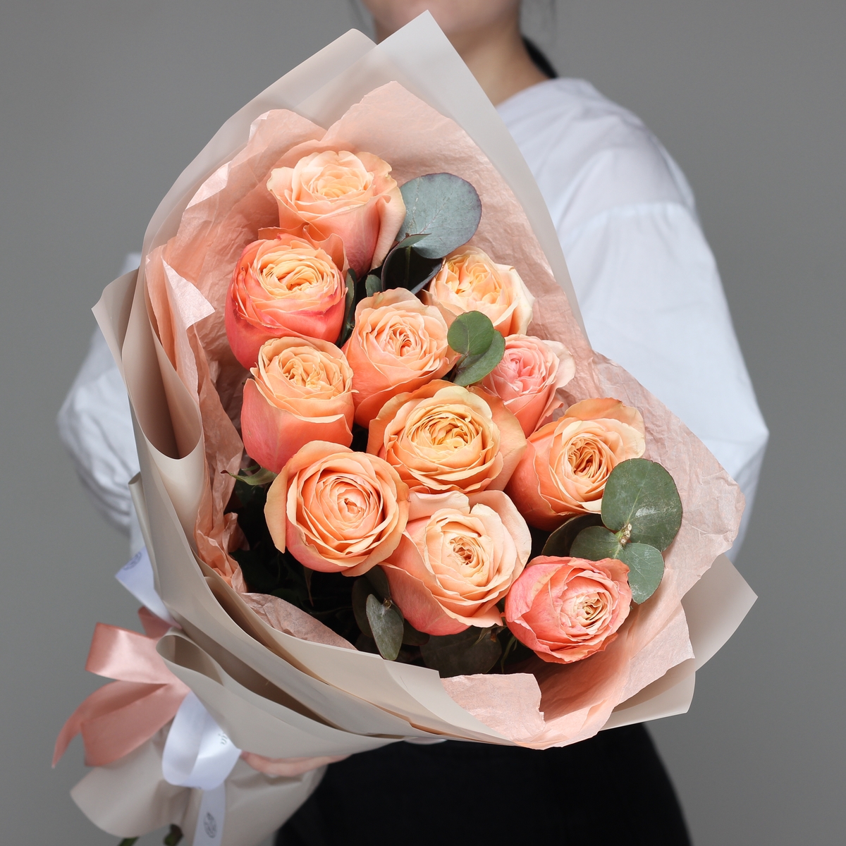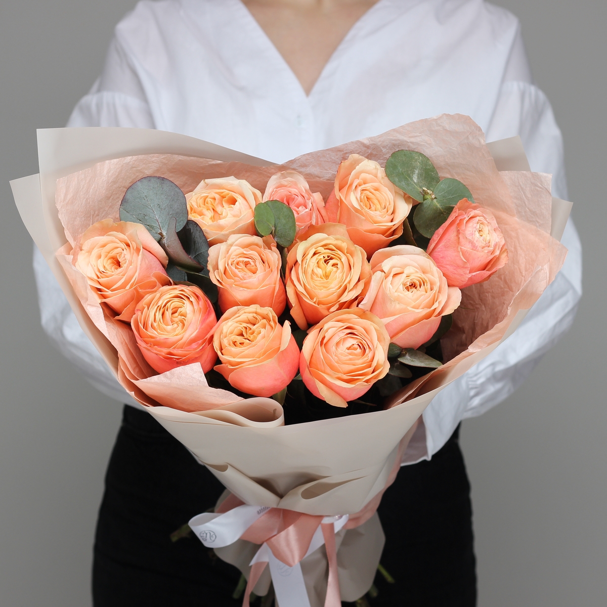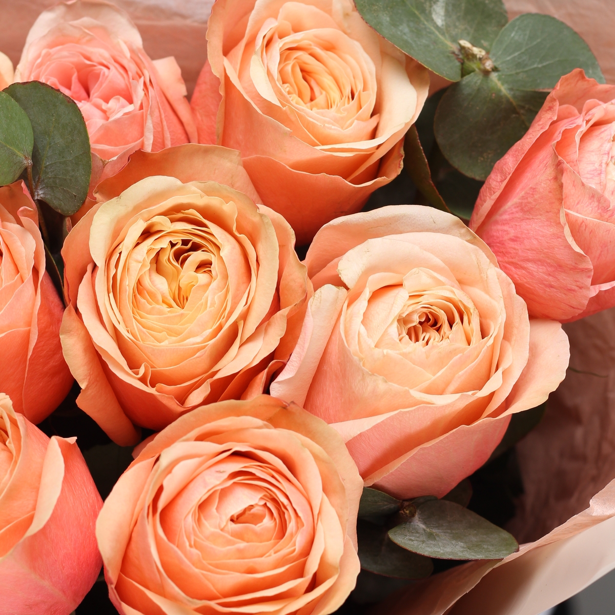 Состав: Роза Kahala - 11 шт, Эвкалипт — 0,5 шт, Тишью персиковое, Матовая пленка бежевая ушками