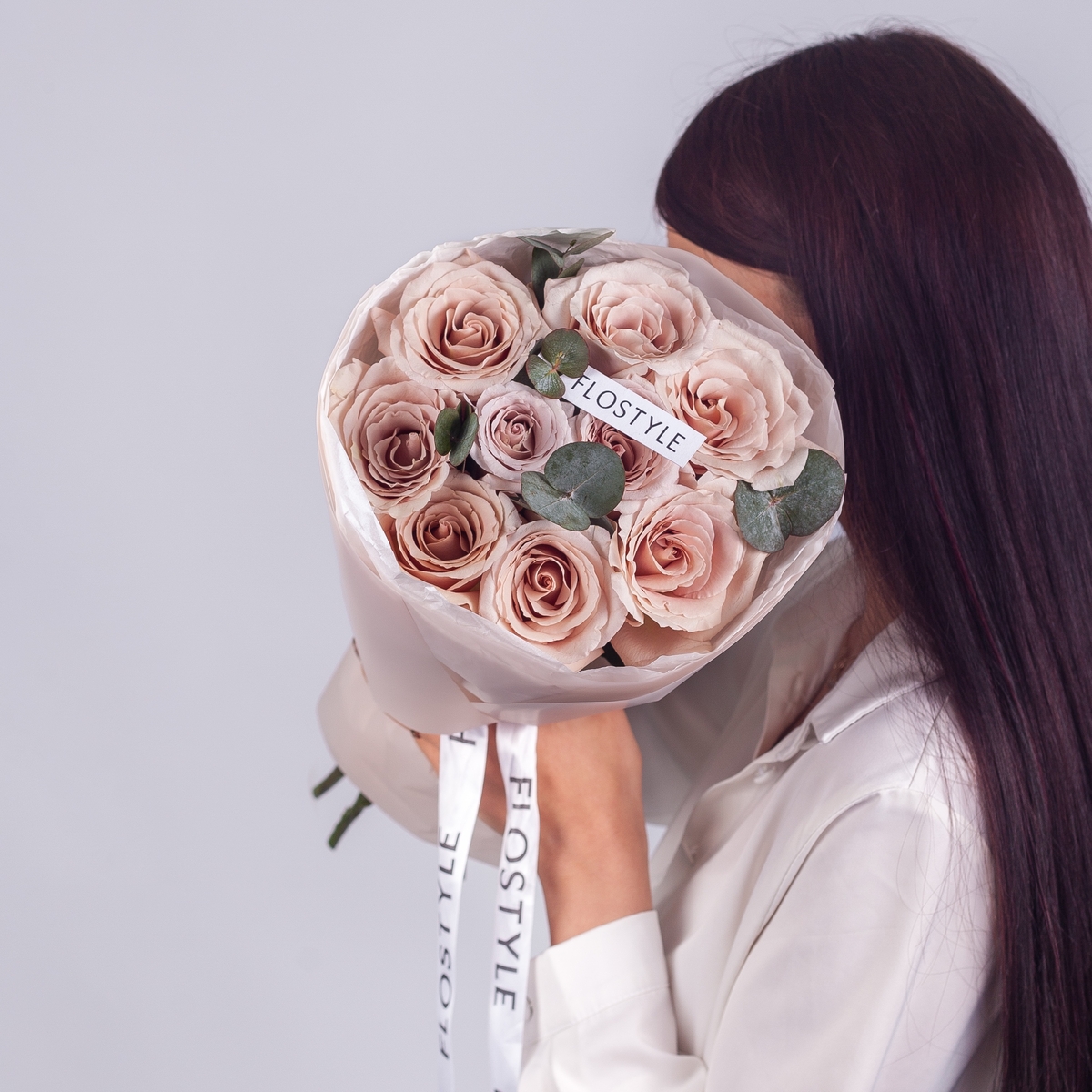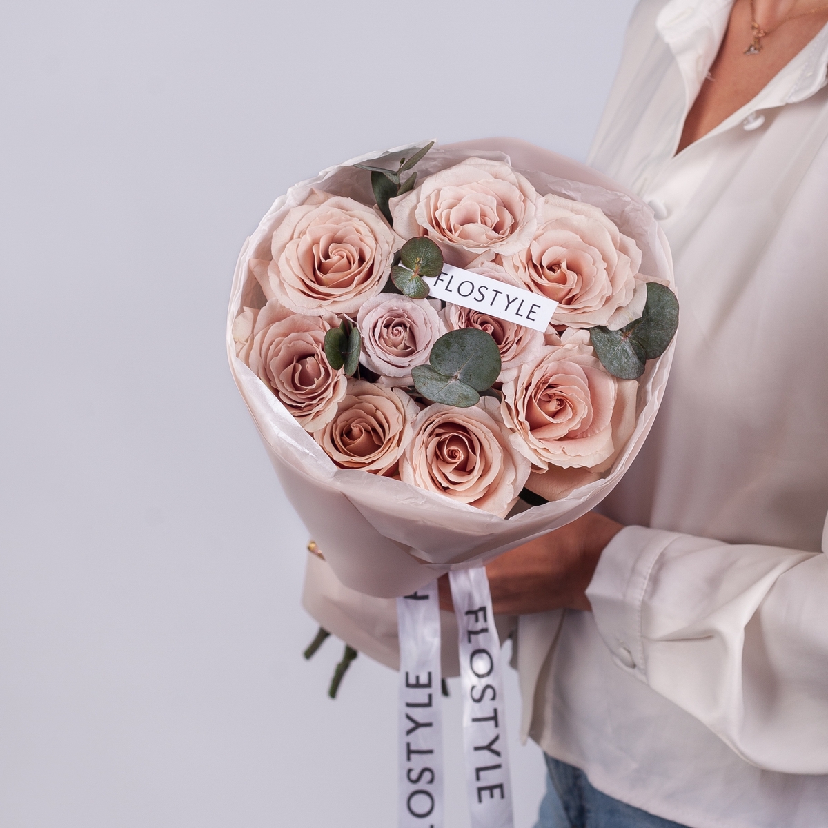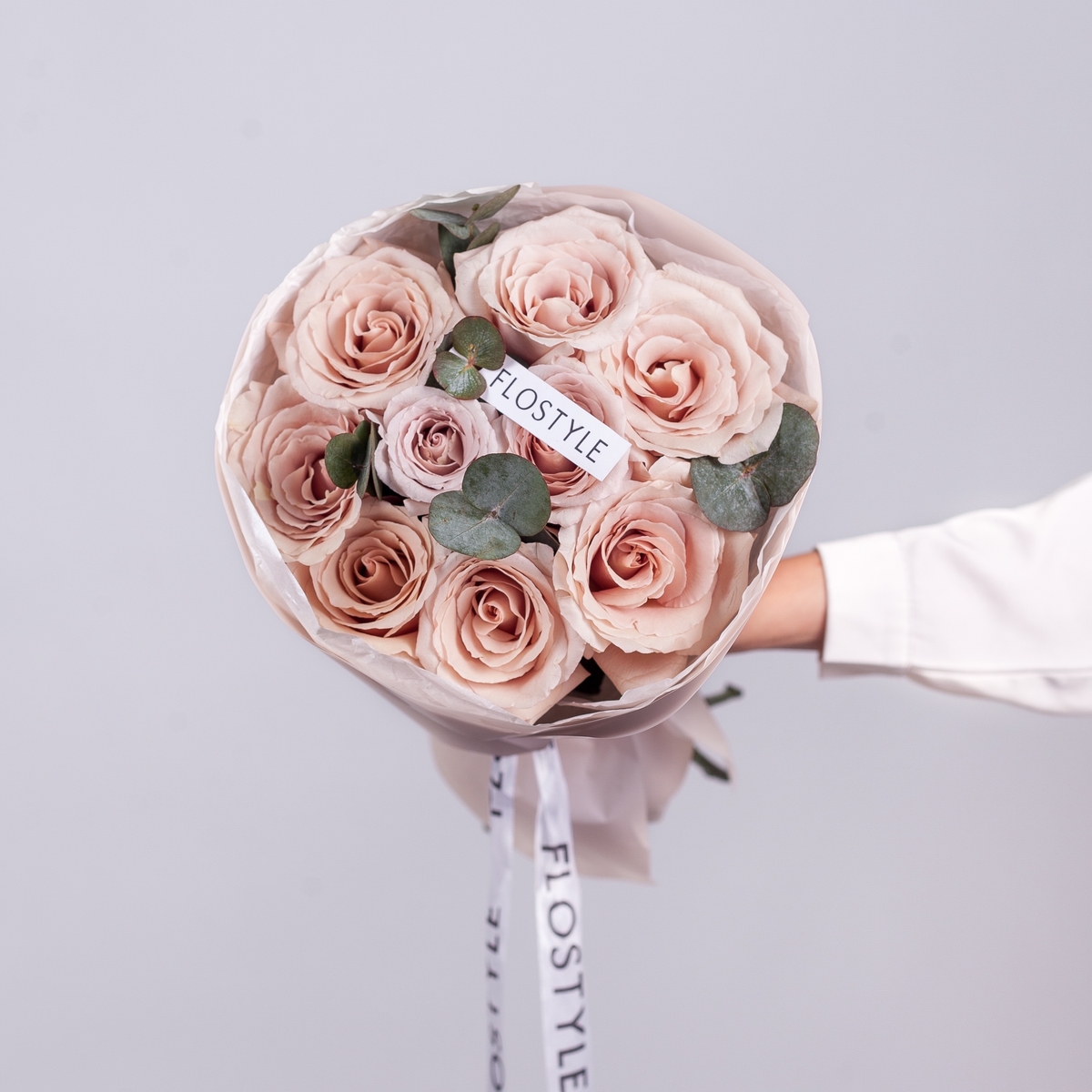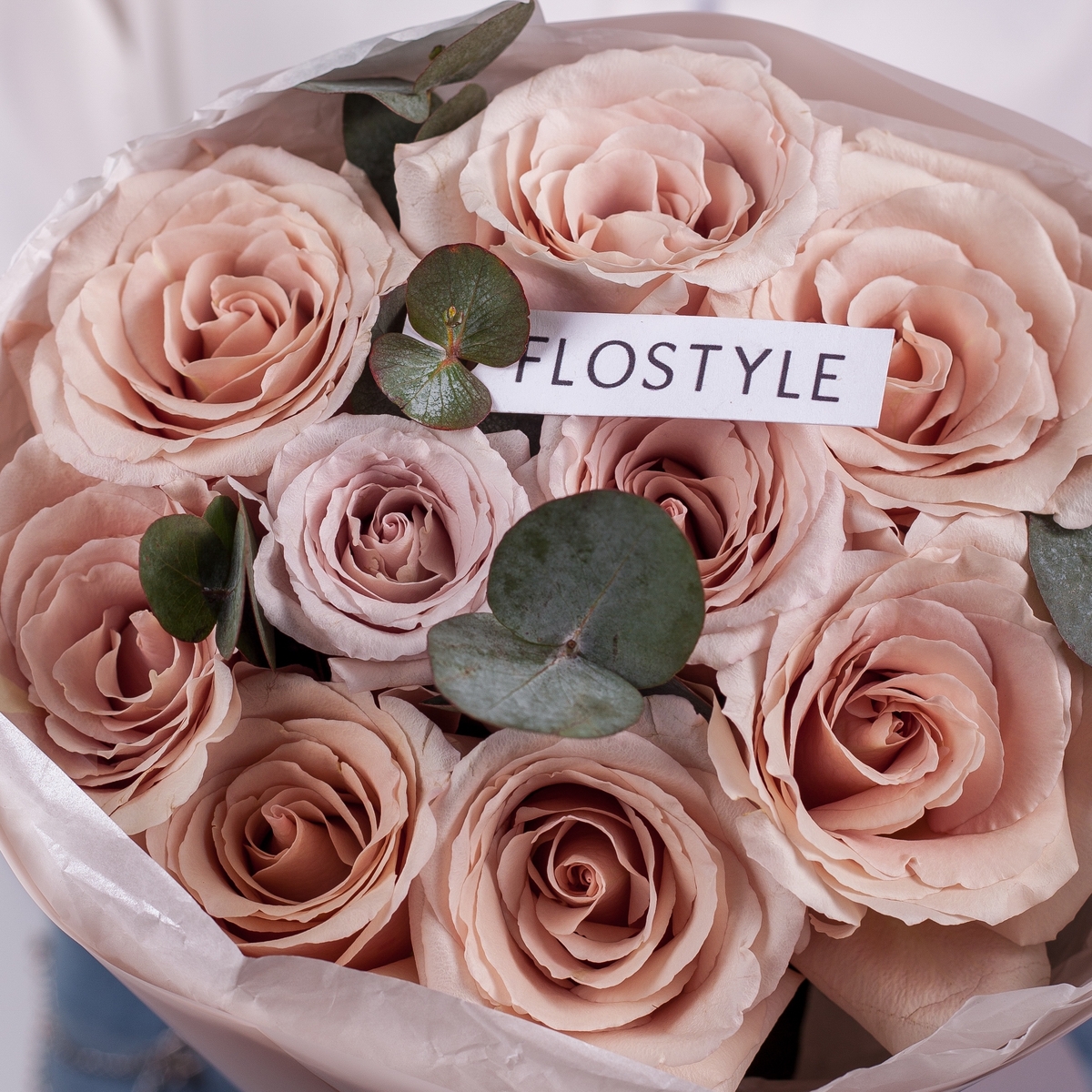 Состав: Роза Quicksand - 9 шт, Эвкалипт - 0,5 шт, Тишью бежевая, Матовая пленка белая кругом