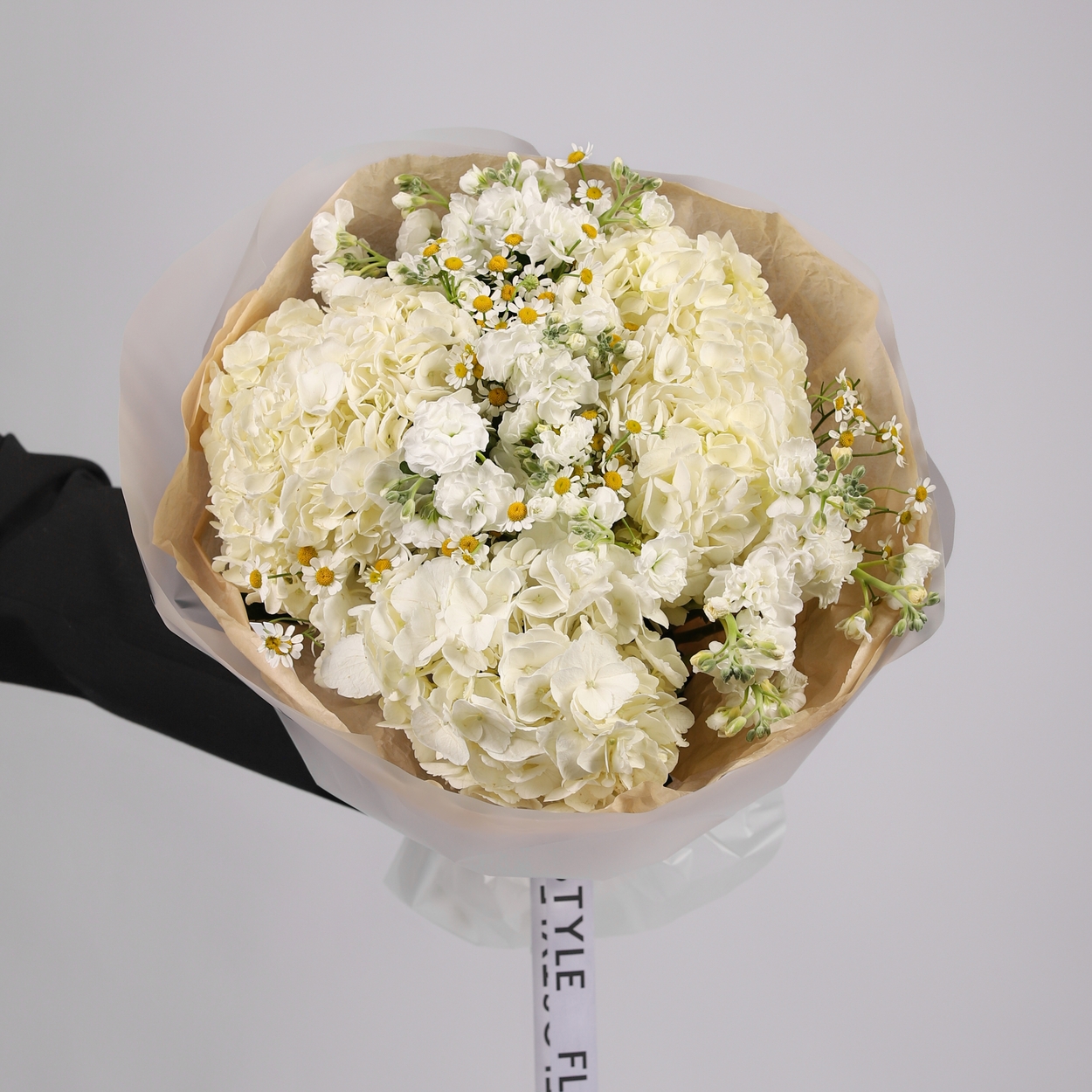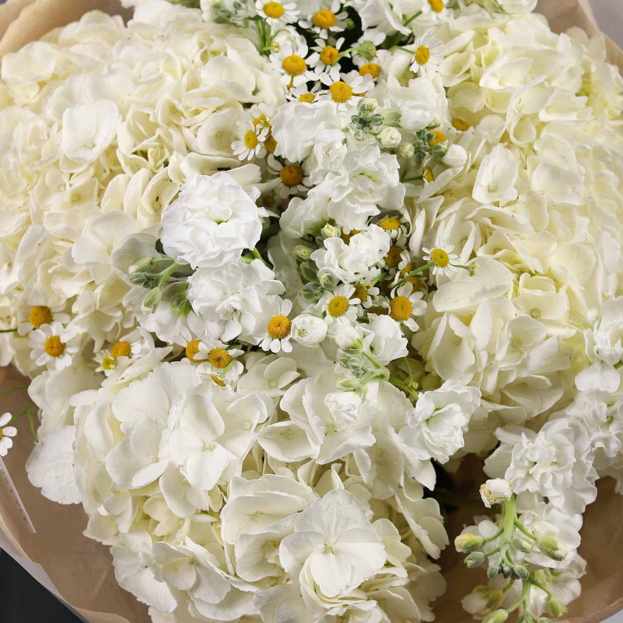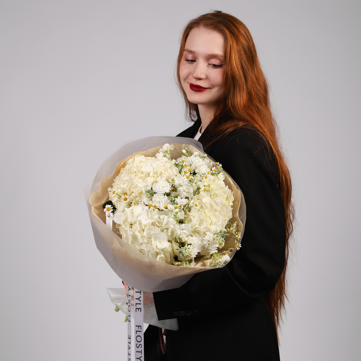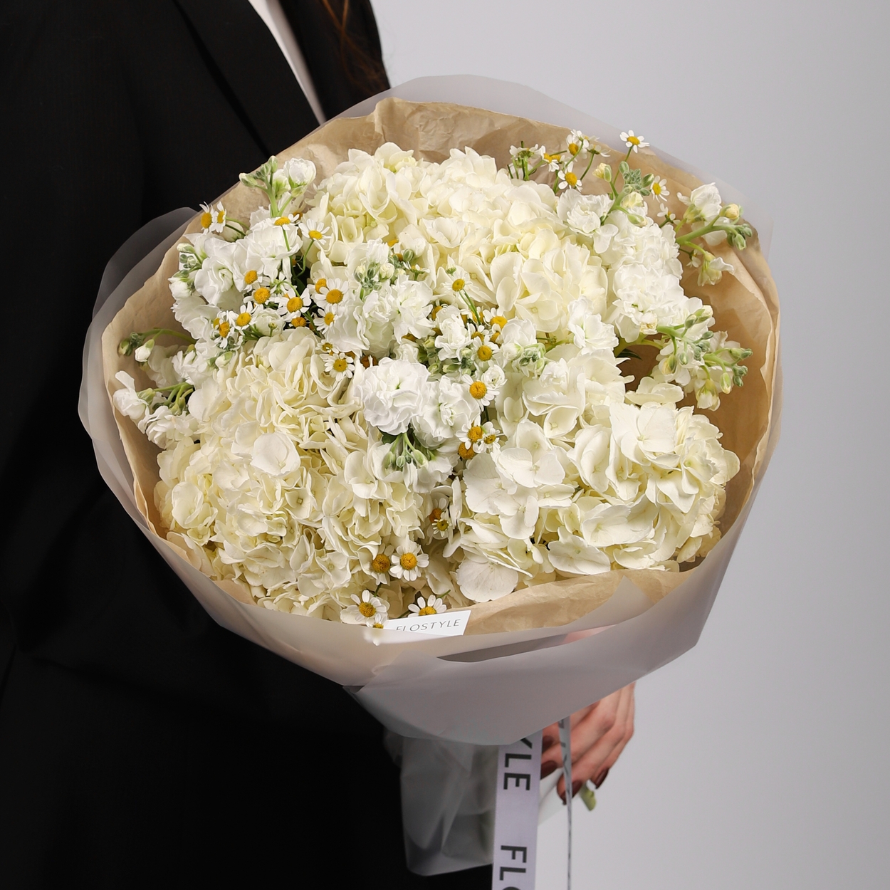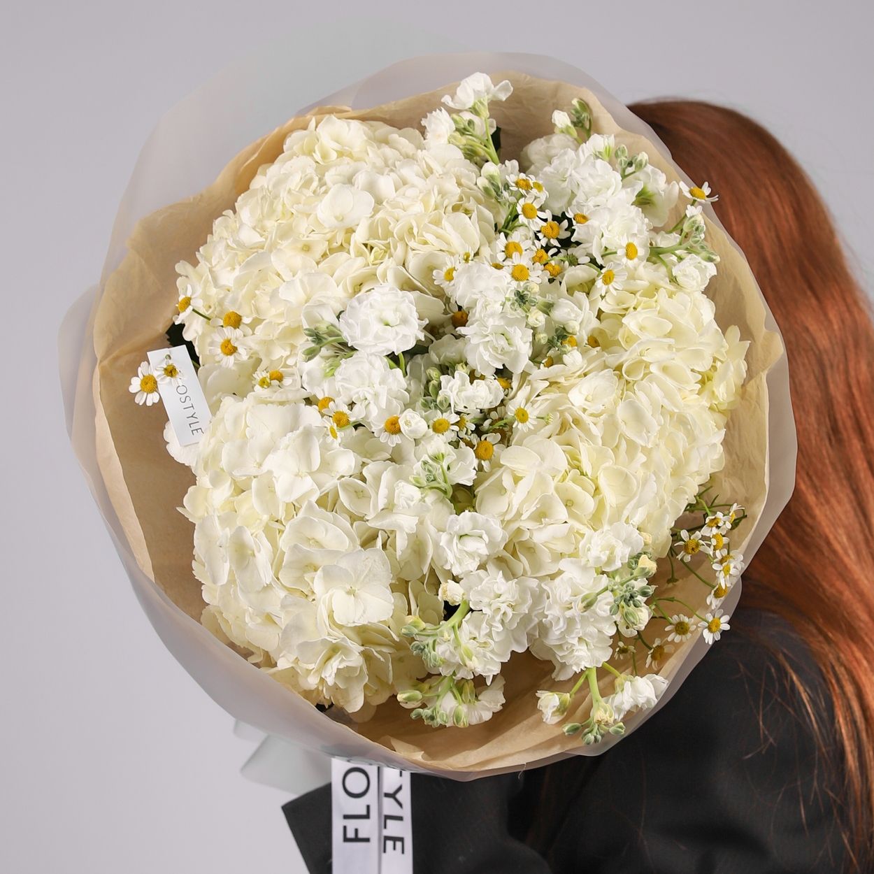 Состав: Гортензия White - 3 шт, Маттиола White - 4 шт, Ромашка танацетум - 5 шт, Фисташка - 2 шт, Тишью Бежевая, Матовая пленка белая кругом
