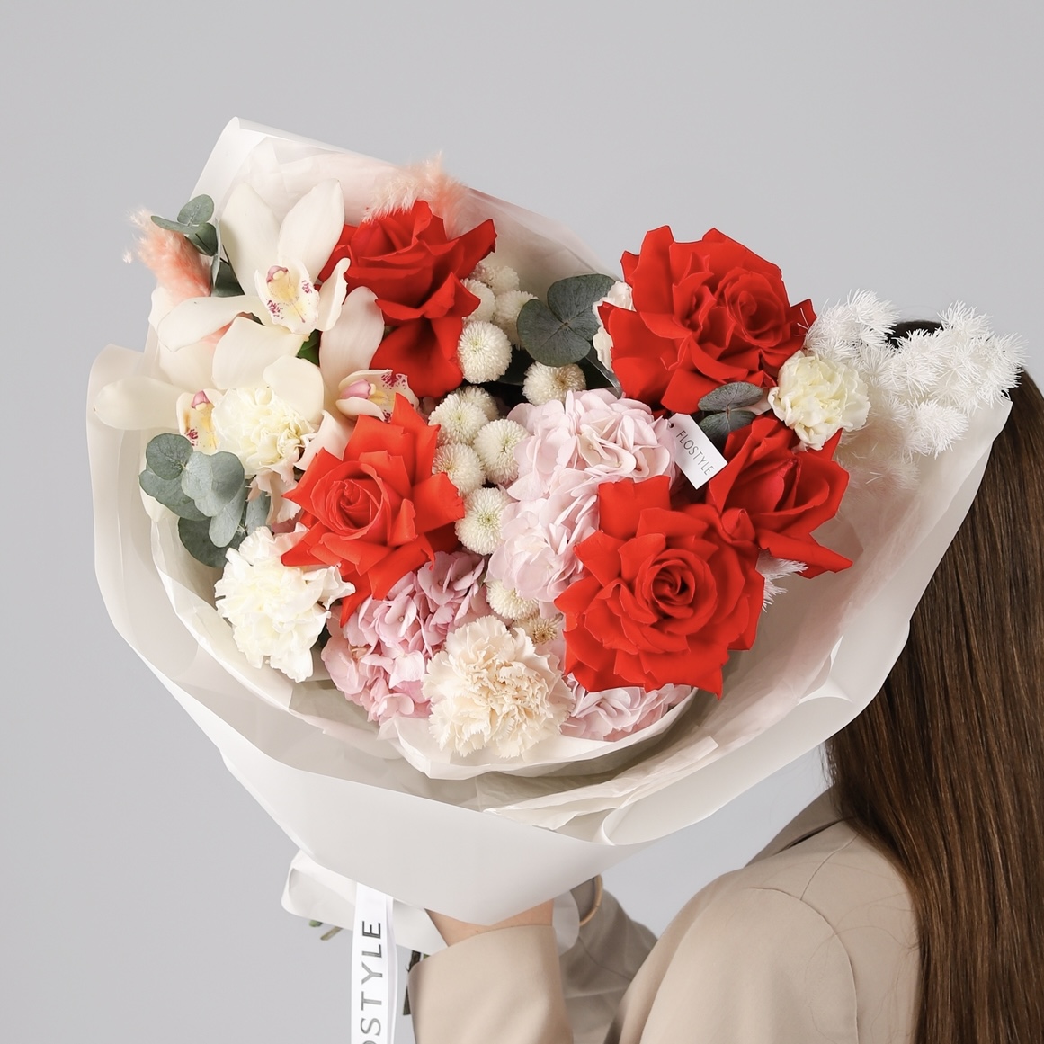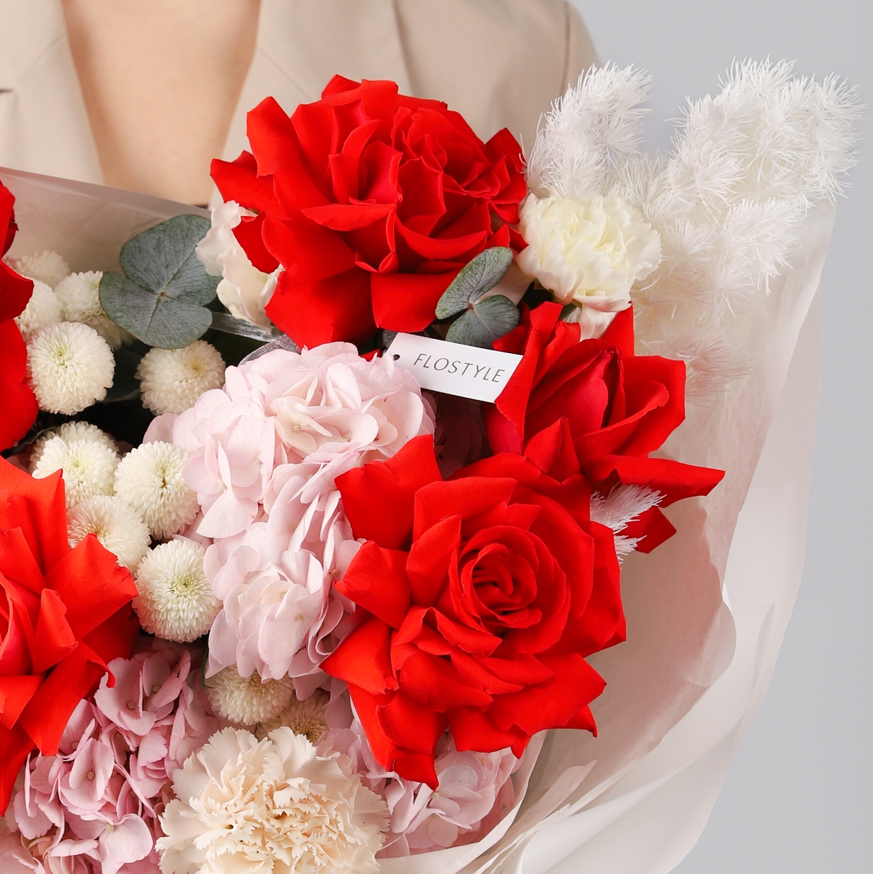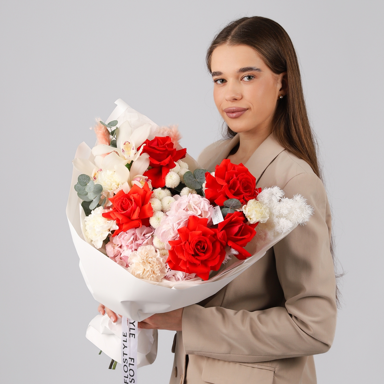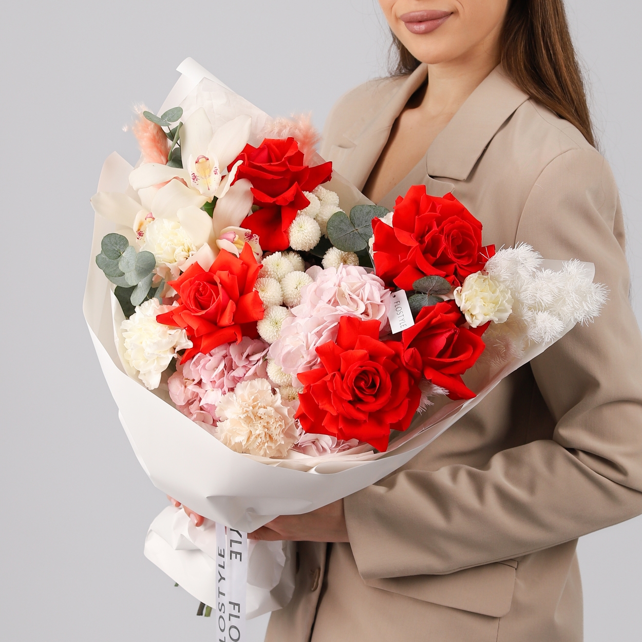 Состав: Роза Nina французская - 5 шт, Орхидея White - 3 шт, Гортензия Pink - 3 шт, Хризантема Newton - 2 шт, Диантус Brut/White - 6 шт, Аспарагус - 1 шт, Пампасная трава - 2 шт, Эвкалипт - 0,5 шт,