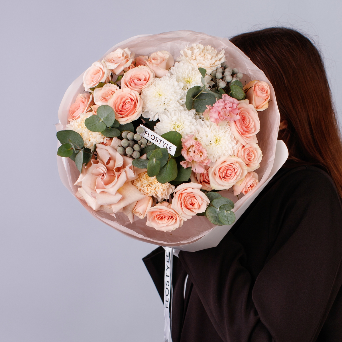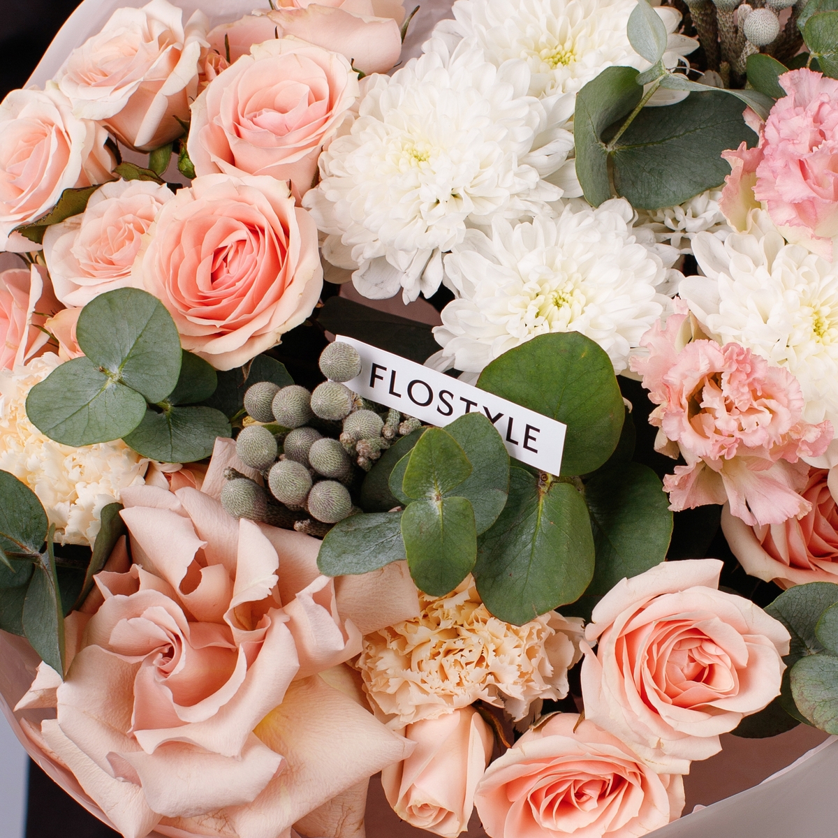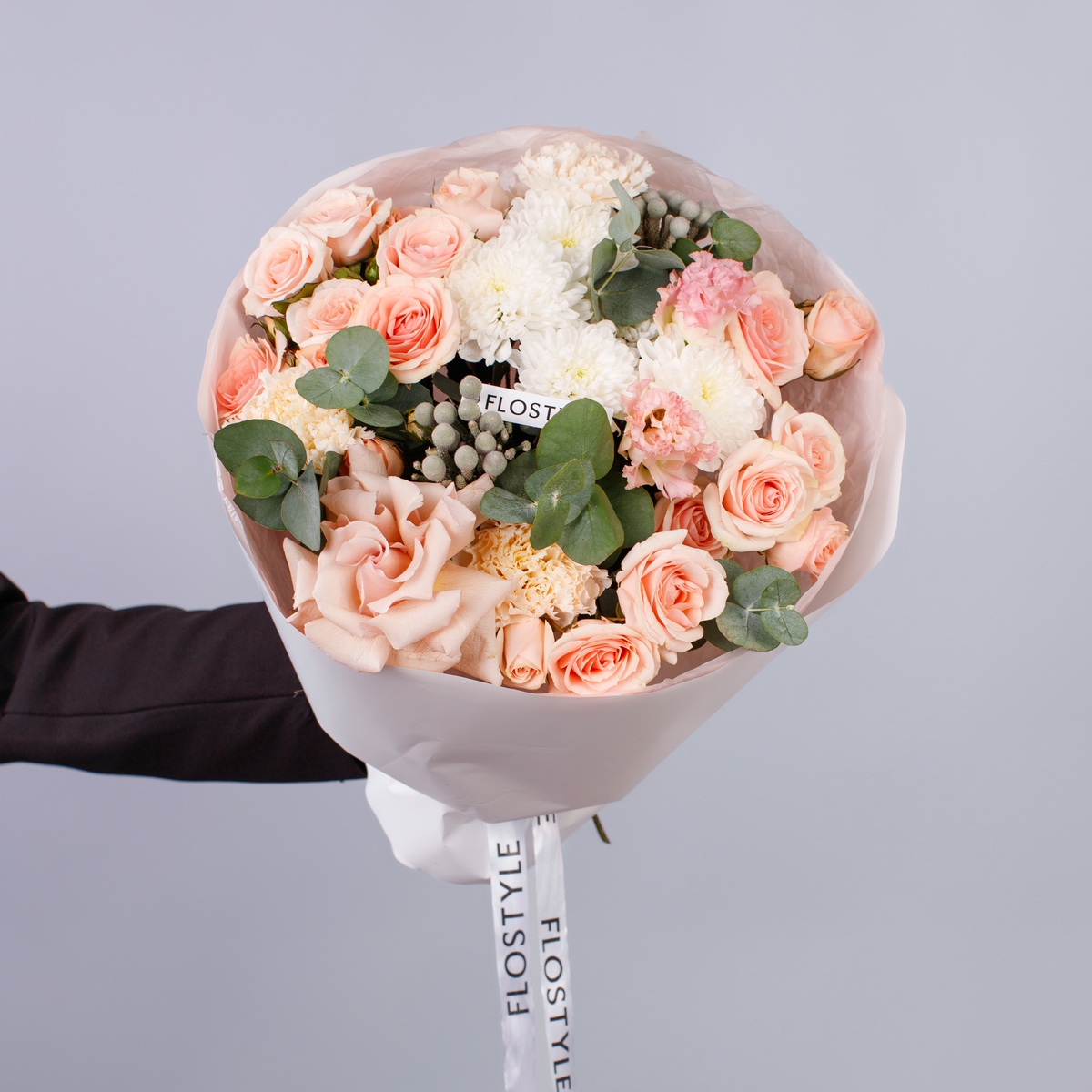 Состав: Роза Quicksand французская - 1 шт, Роза кустовая Star Blush - 4 шт, Хризантема Altaj - 1 шт, Эустома Pink - 1 шт, Диантус Brut - 3 шт, Бруния - 2 шт, Эвкалипт - 1 шт, Фисташка - 2 шт, Розовая Тишью, Матовая пленка белая кругом