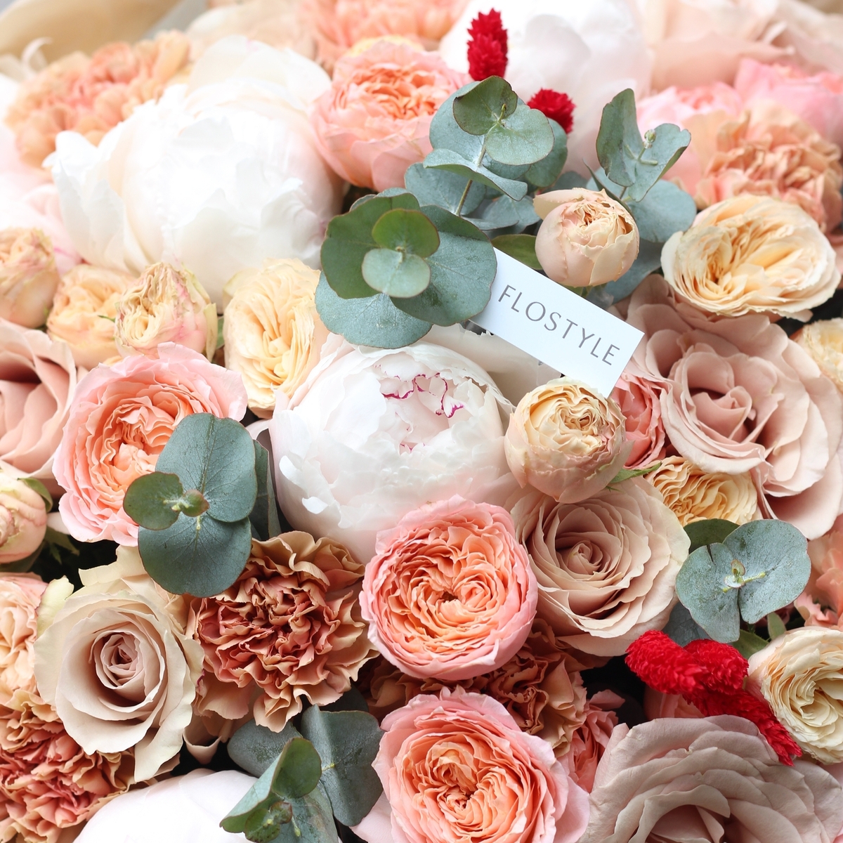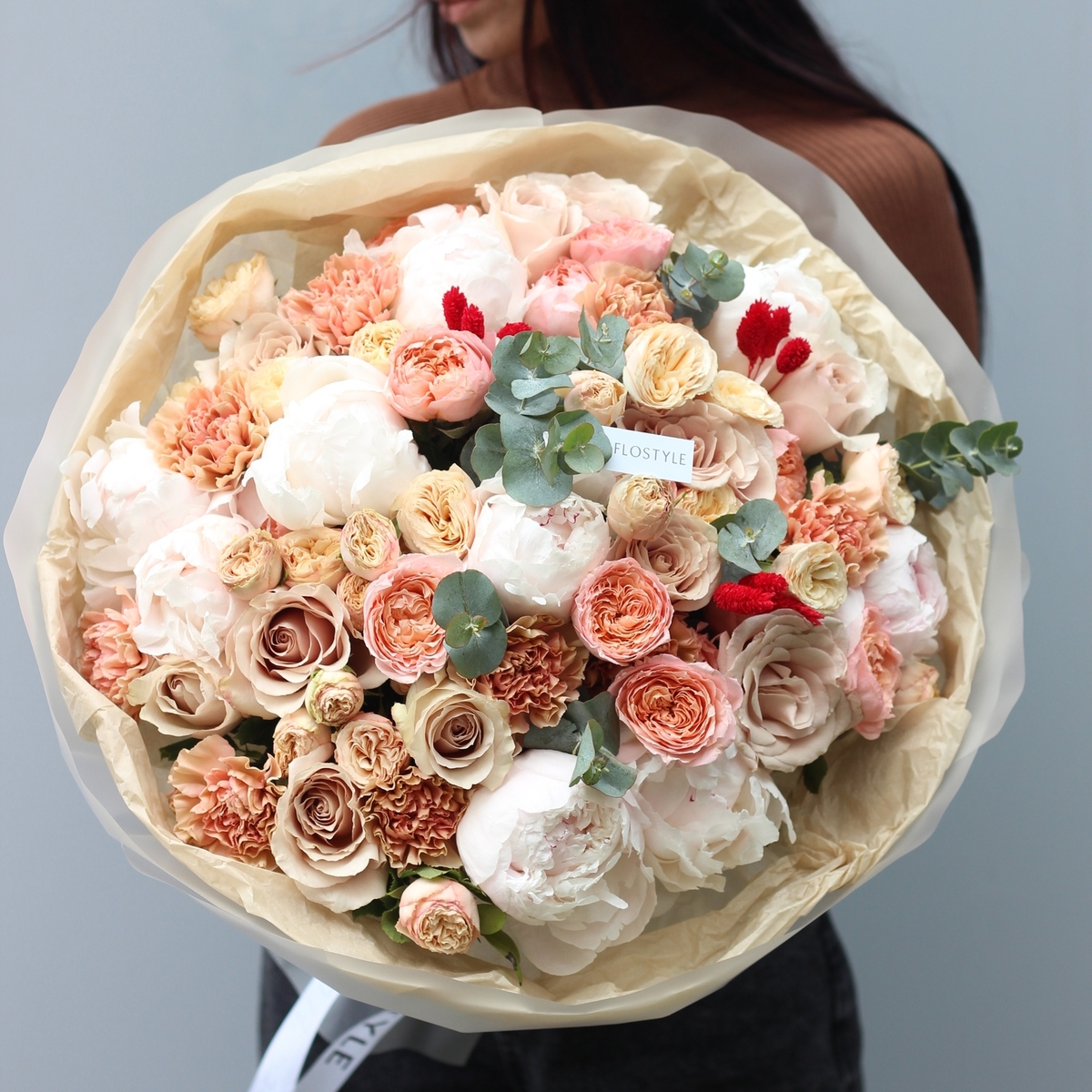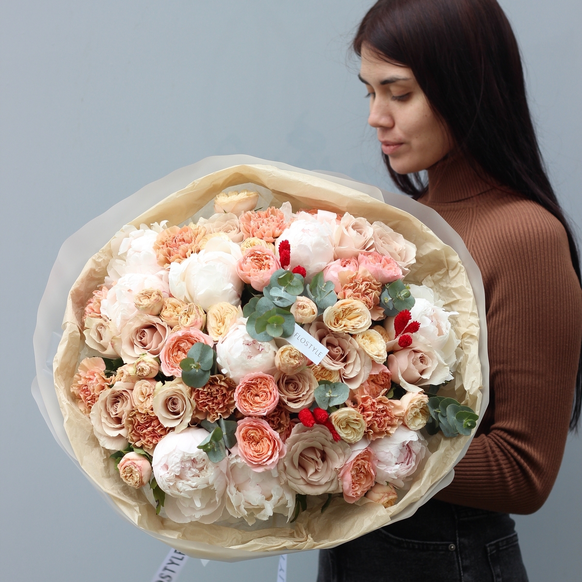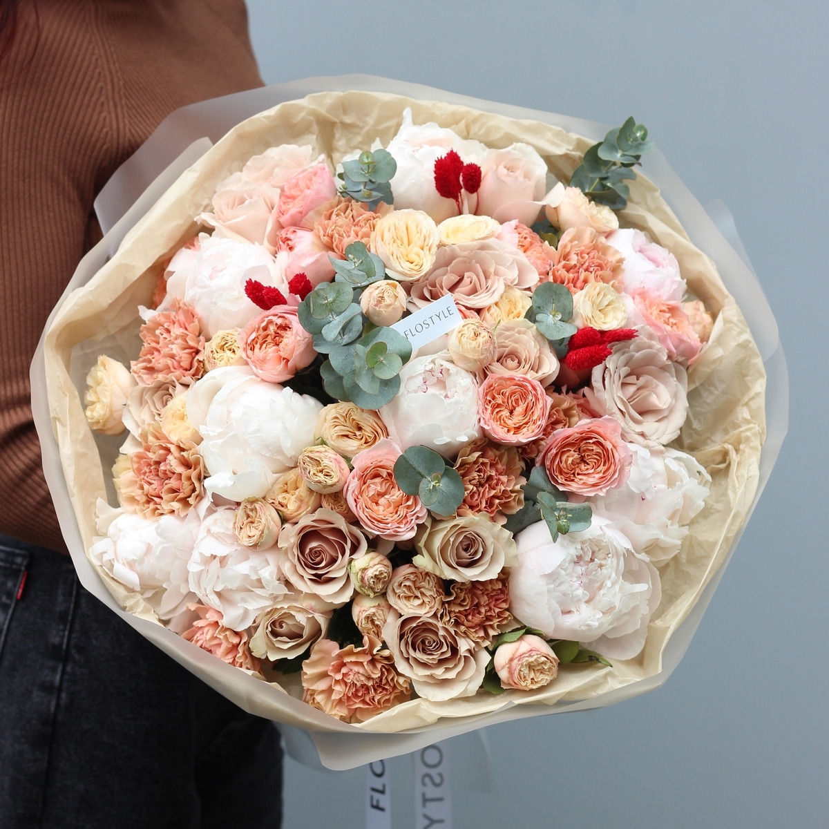 Состав: Пионы White - 9 шт, Роза Quicksand - 10 шт, Роза кустовая Juliet - 4 шт, Роза кустовая Gentle Trendsetter - 5 шт, Диантус Apple Tea - 9 шт, Фалярис красный - 7 шт, Фисташка - 4 шт, Эвкалипт - 1 шт, Тишью бежевая, Матовая пленка белая кругом