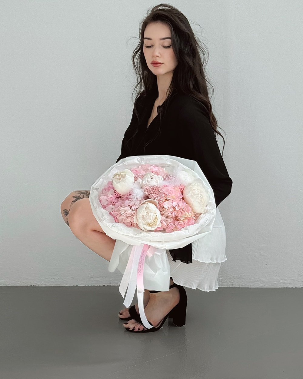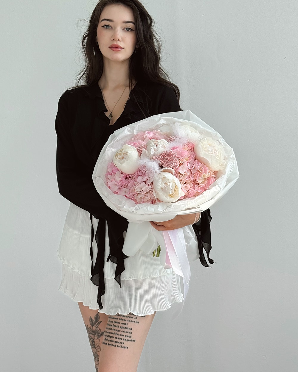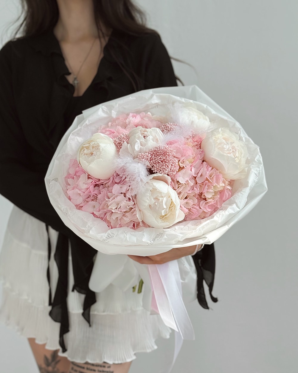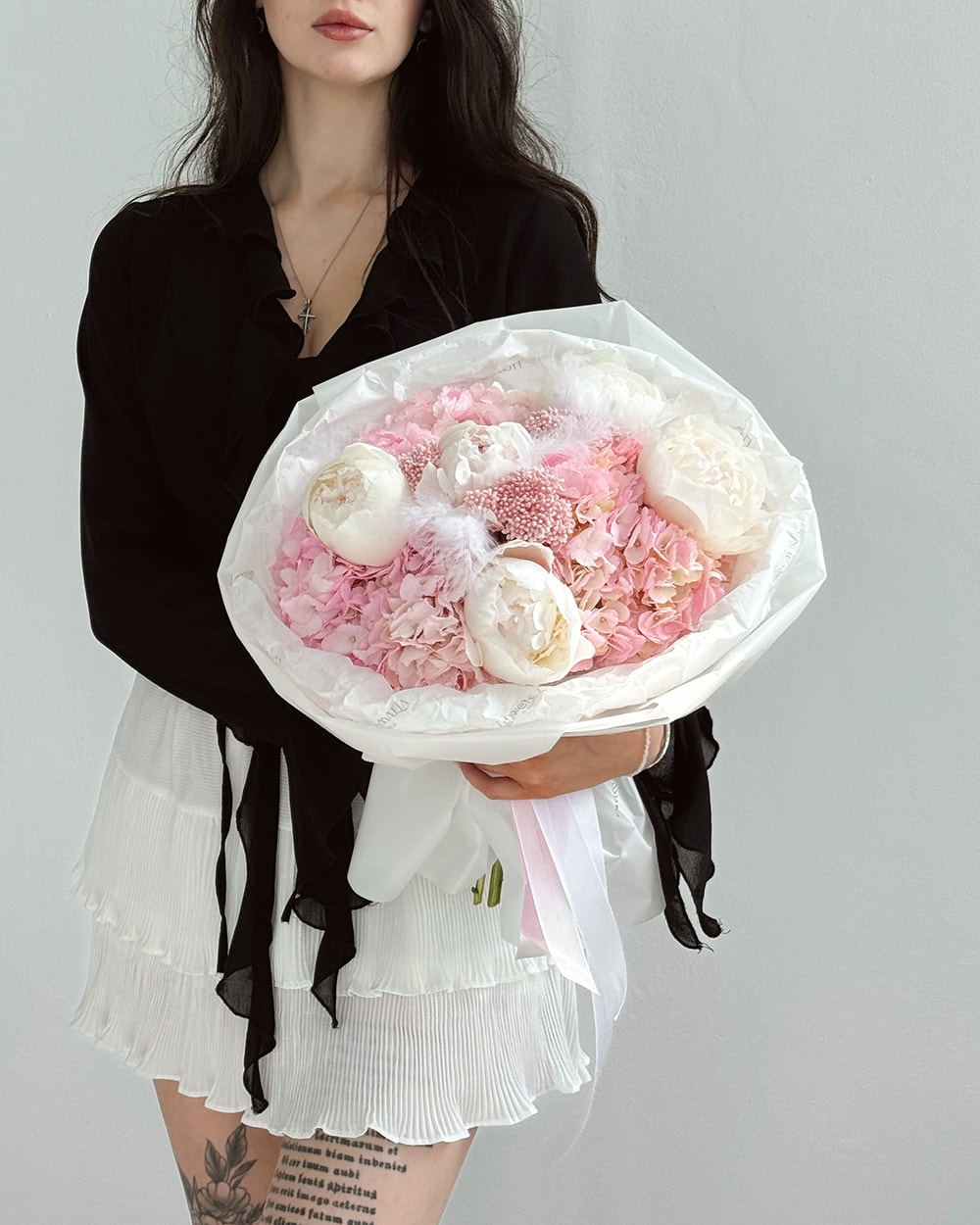 Этот букет я создавала как лёгкое прикосновение. Пышные пионы — как база: мягкие, светлые, с красивым раскрытием. Гортензия добавляет фактуру и объём, а перья — ту самую воздушность, будто букет парит в воздухе.