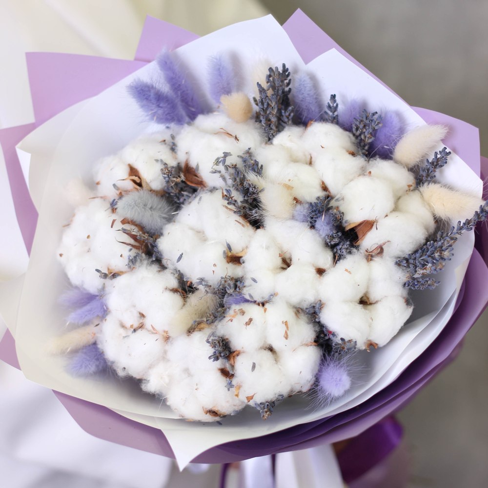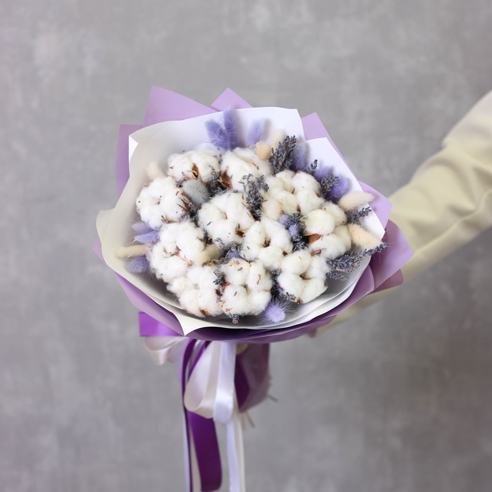Состав: Хлопок натур - 11 шт, Лаванда — 25 шт, Лагурус — 20 шт, Матовая пленка белая и пурпурная углами