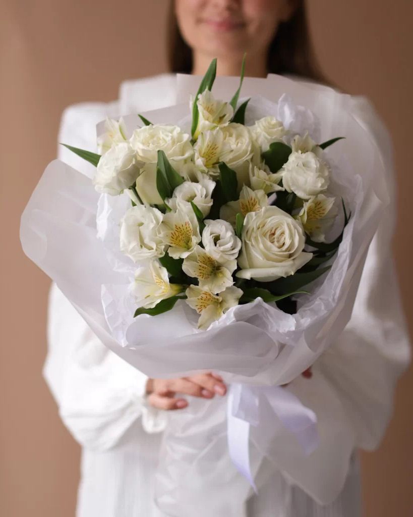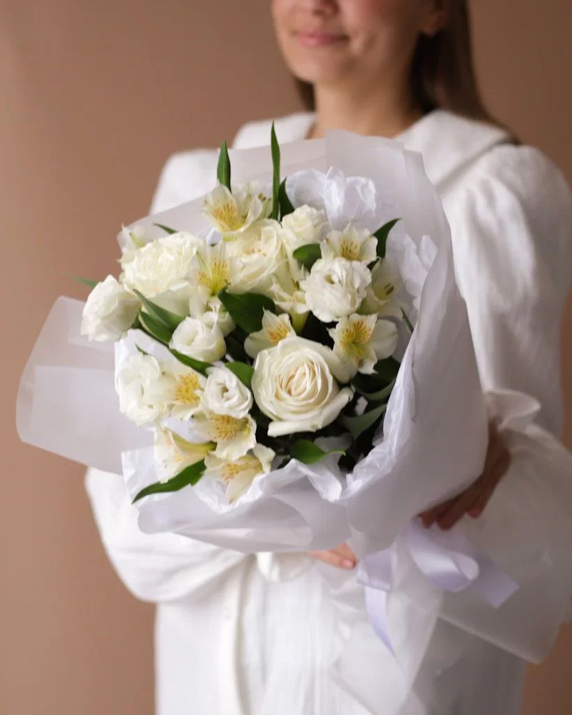 Состав: Роза Playa Blanca - 3 шт, Альстромерия White - 3 шт, Эустома White - 1 шт, Фисташка - 1 шт, Тишью белая, Матовая пленка белая кругом