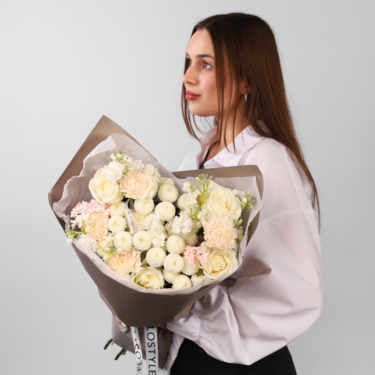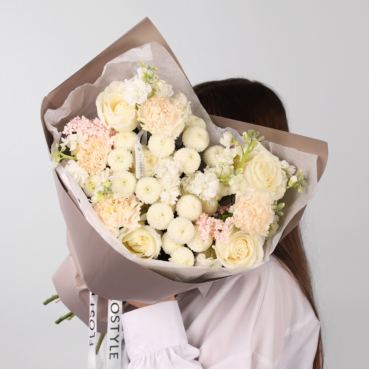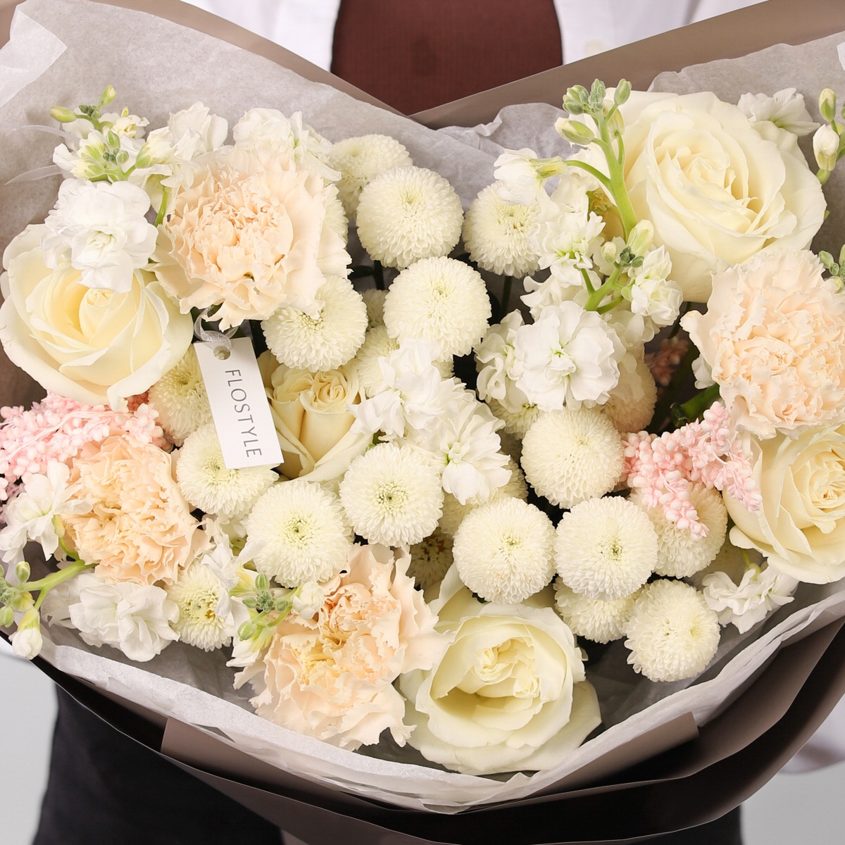 Роза Playa Blanca - 5 шт, Хризантема Newton - 4 шт, Диантус Brut - 4 шт, Маттиола White - 3 шт, Сухоцветы Сорго - 1 шт, Фисташка - 2 шт, Тишью белая, Матовая пленка серая ушками
