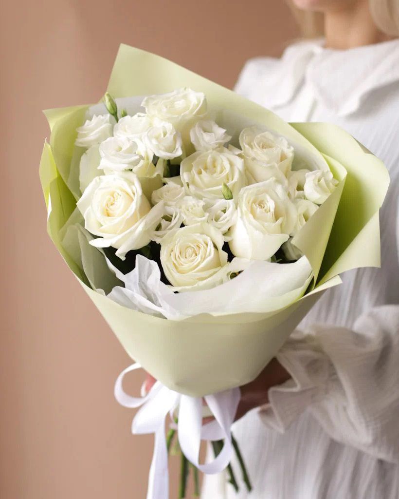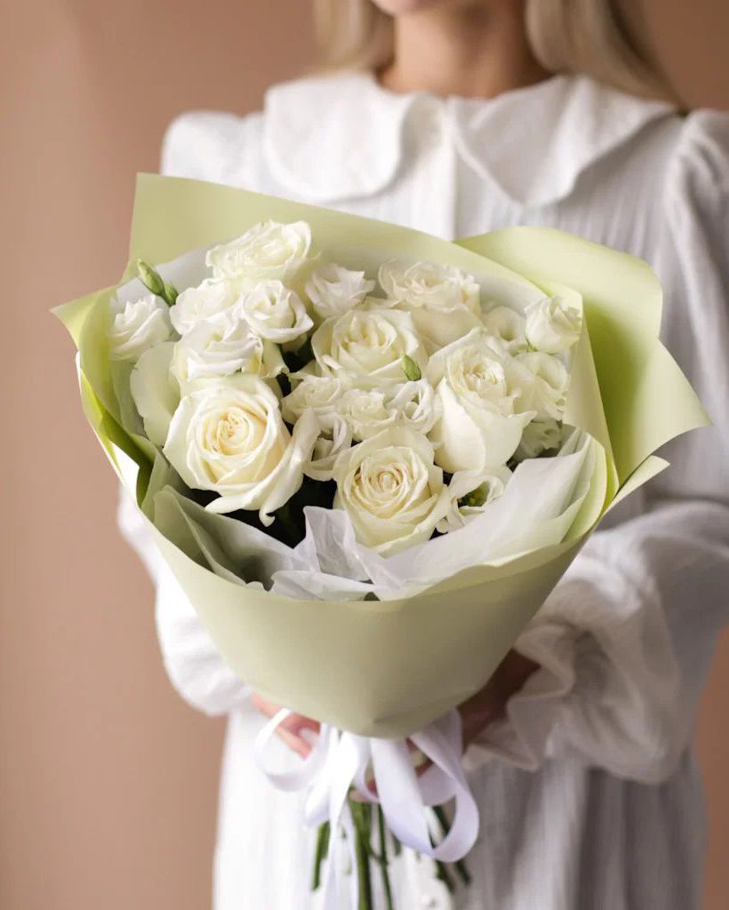 Состав: Роза Playa Blanca - 5 шт, Эустома White - 4 шт, Тишью белая, Матовая пленка бежевая углами