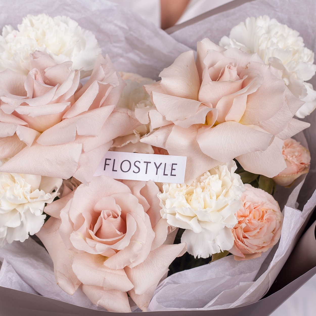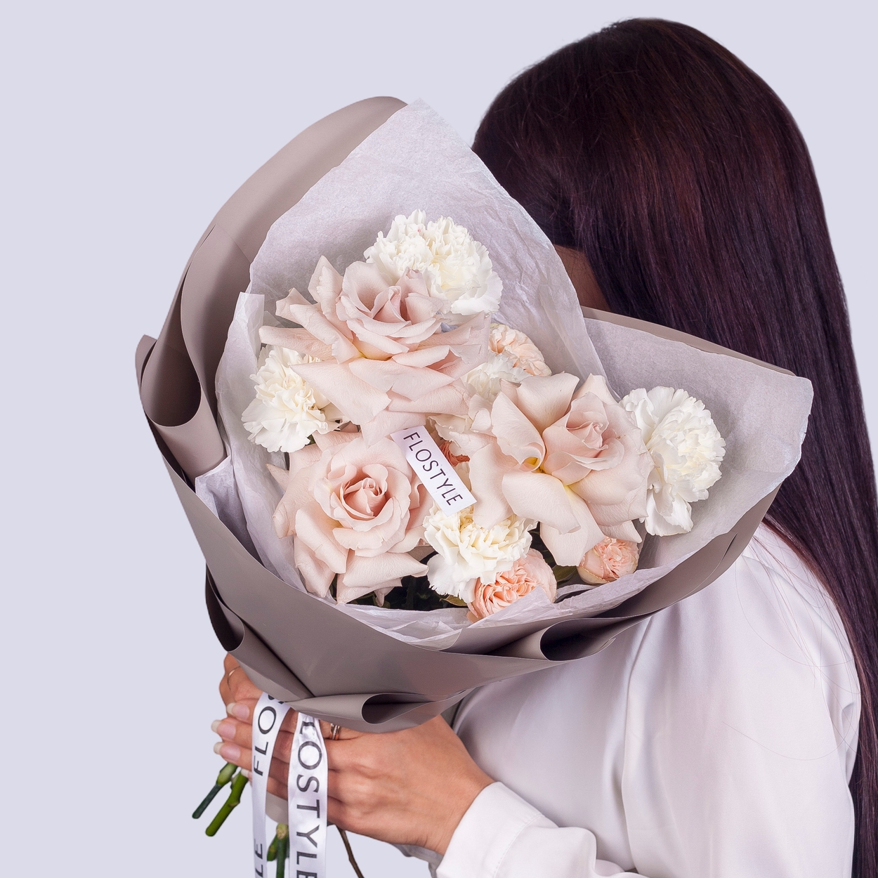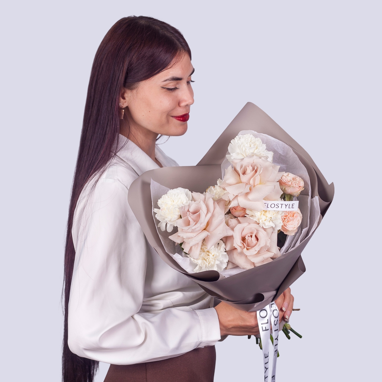 Состав: Роза Quicksand французская - 3 шт, Роза кустовая Gentle Trendsetter 1 шт, Диантус White - 5 шт, Тишью белая, Матовая пленка серая ушками