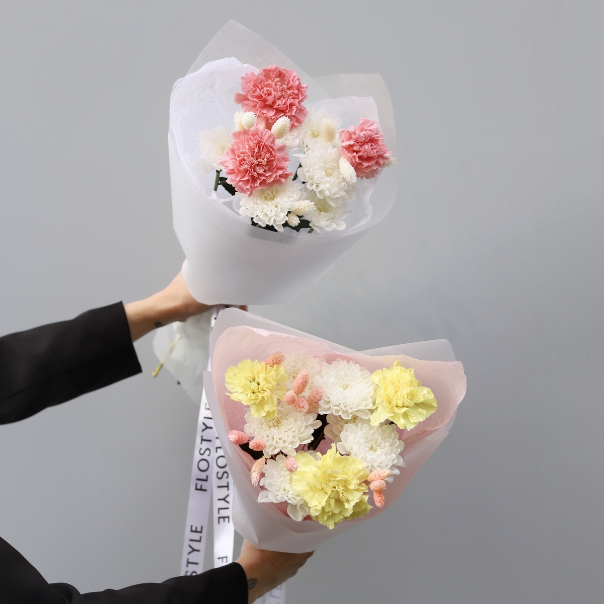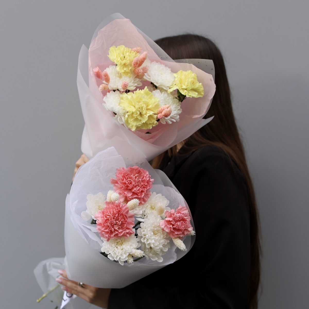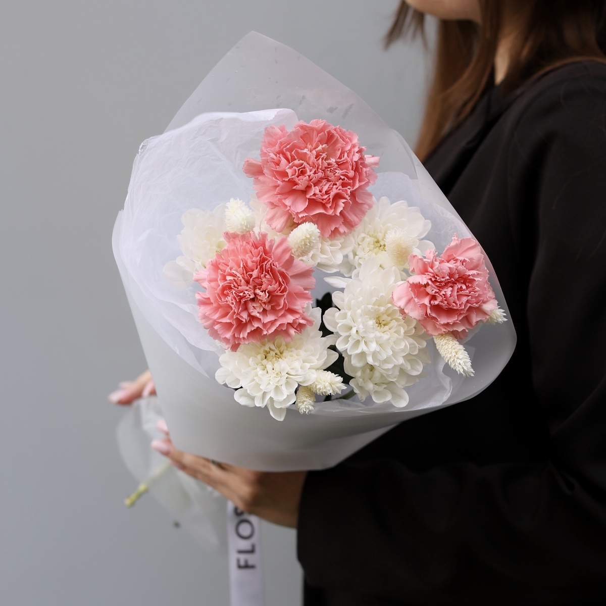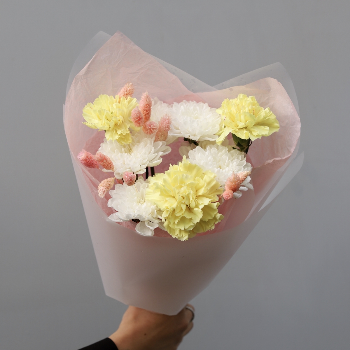 Состав: Диантус (выбор цвета) - 3 шт, Хризантема Altaj - 1 шт, Фалярис - 10 шт, Тишью белая, Матовая пленка белая ушками
