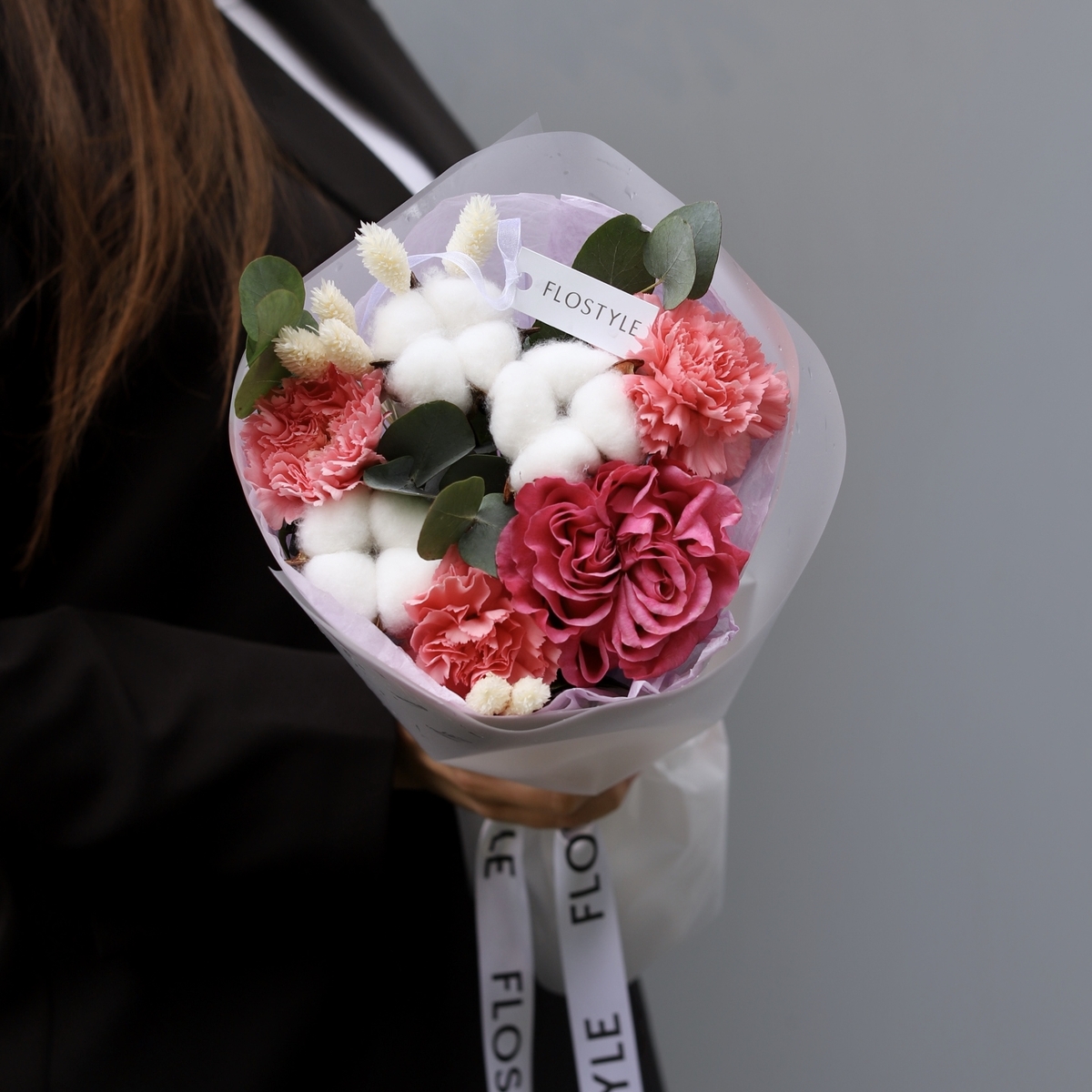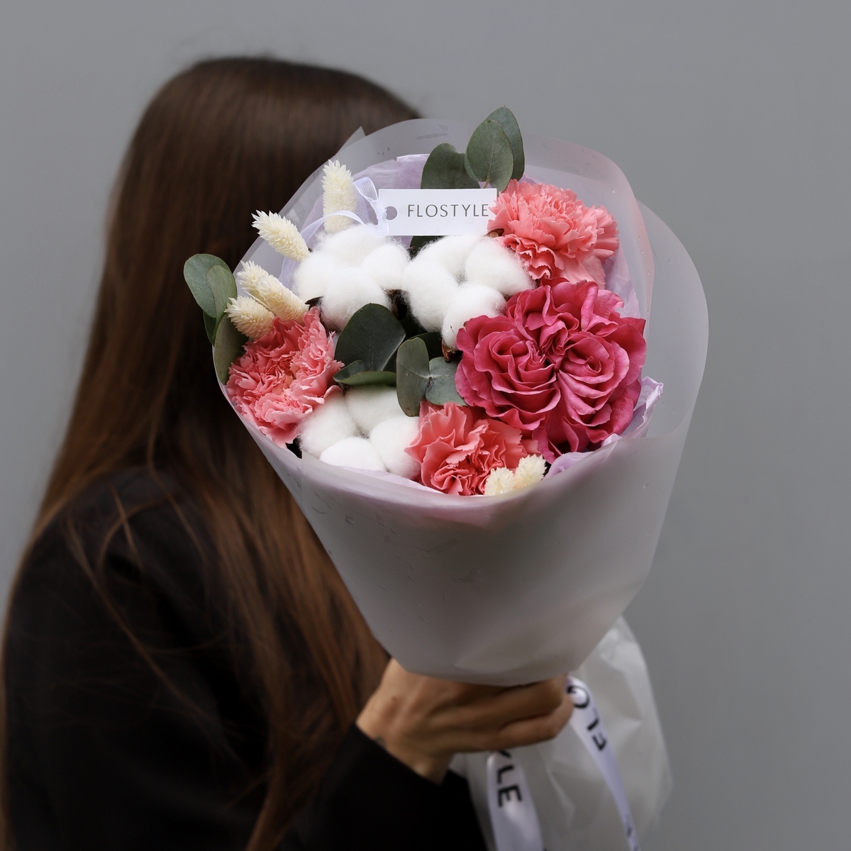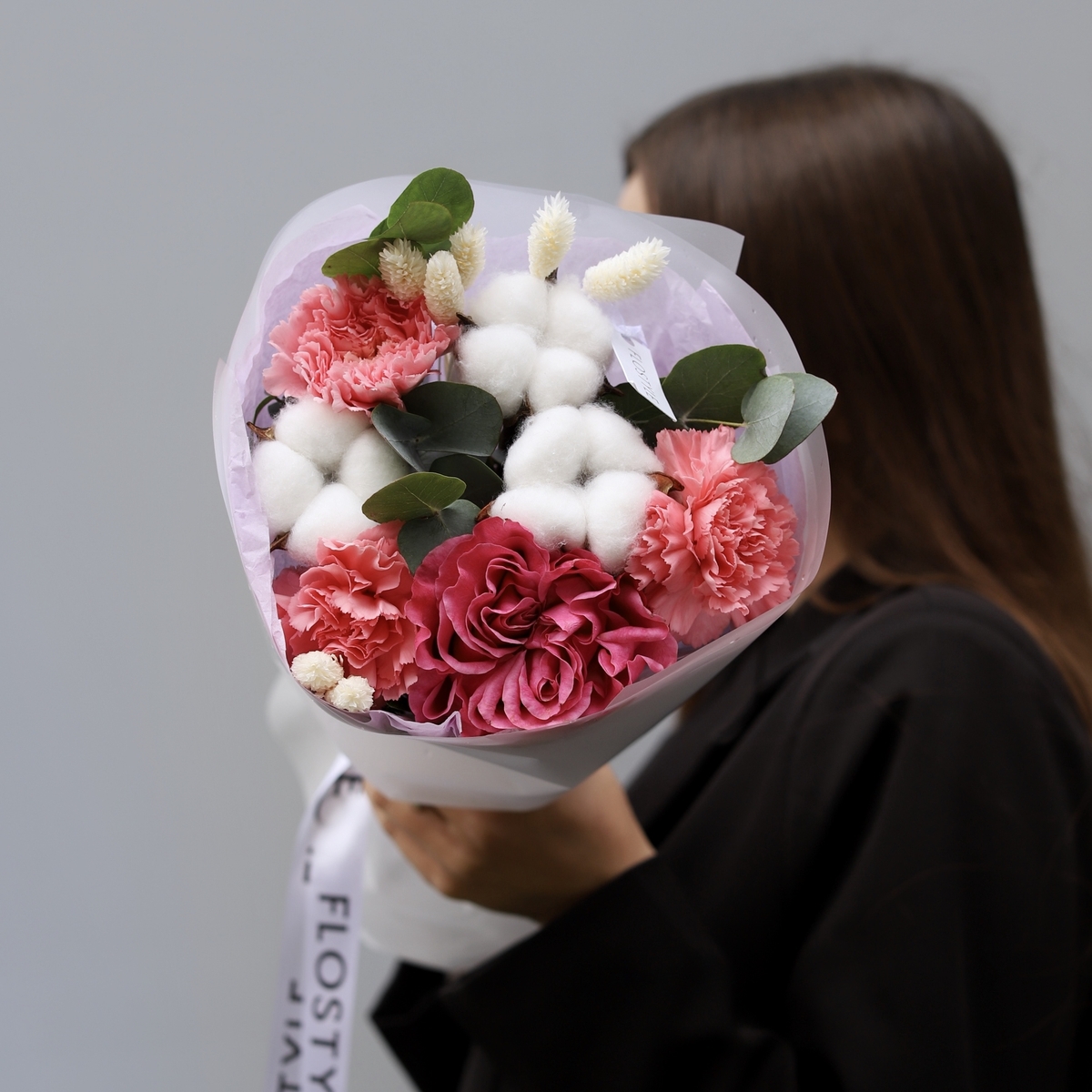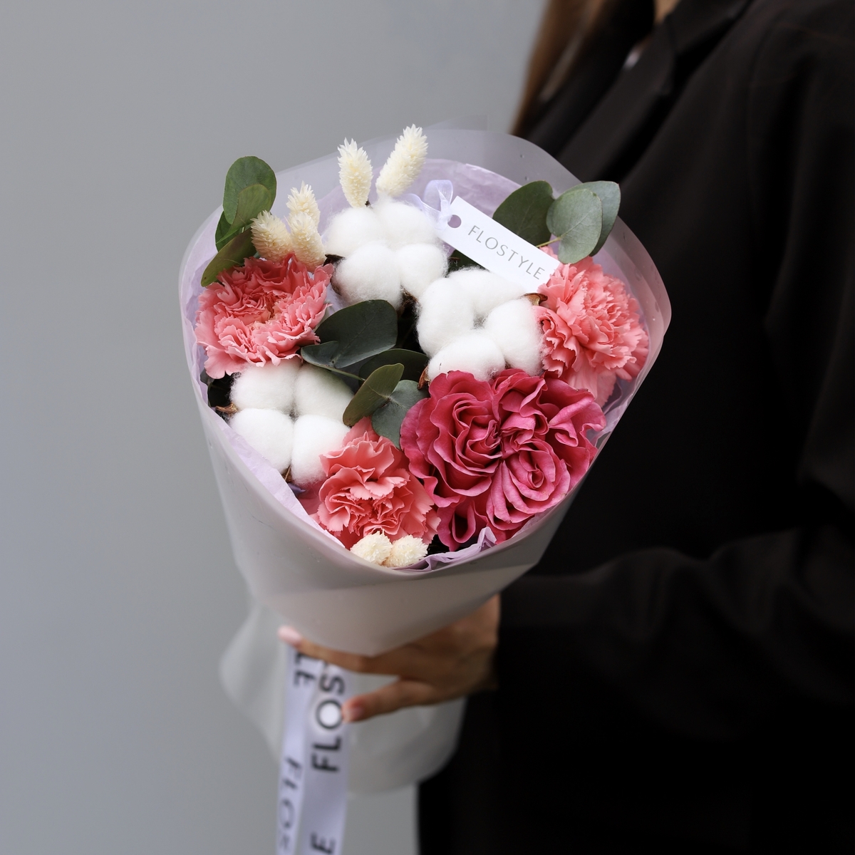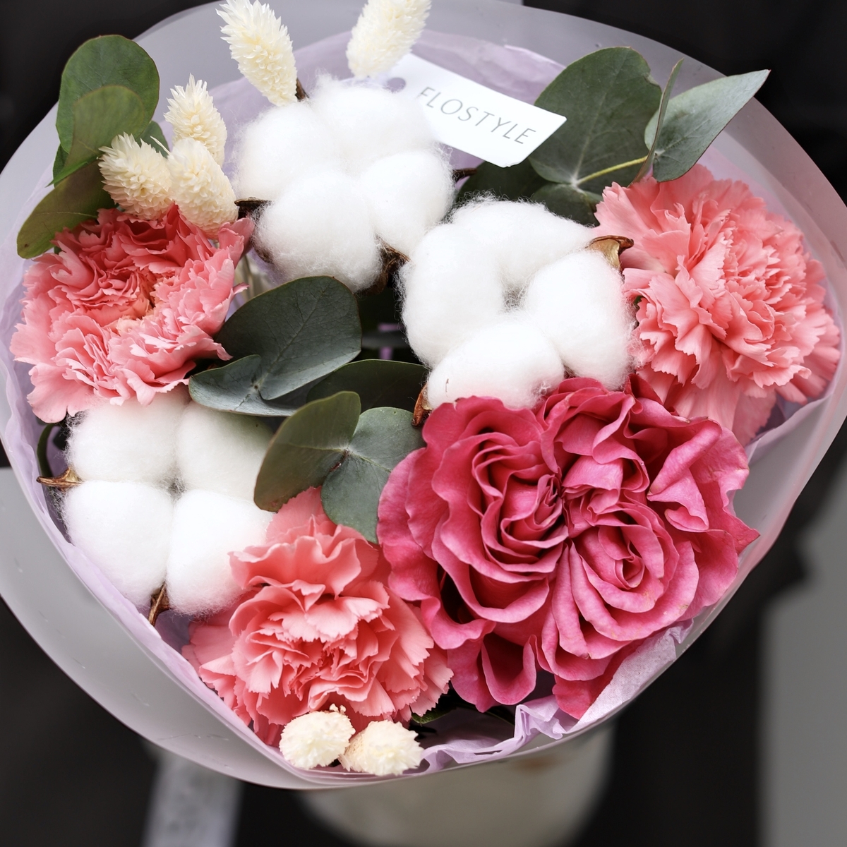 Состав: Роза Country Blues - 1 шт, Диантус Pink -3 шт, Хлопок - 3 шт, Фалярис -7 шт, Эвкалипт - 0,3 шт, фисташка - 1 шт, Тишью белая, Матовая пленка белая кругом