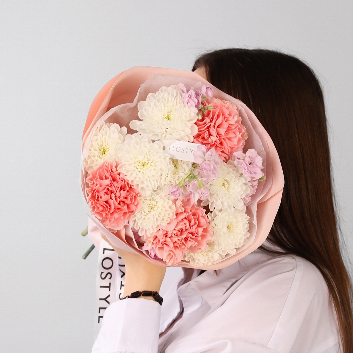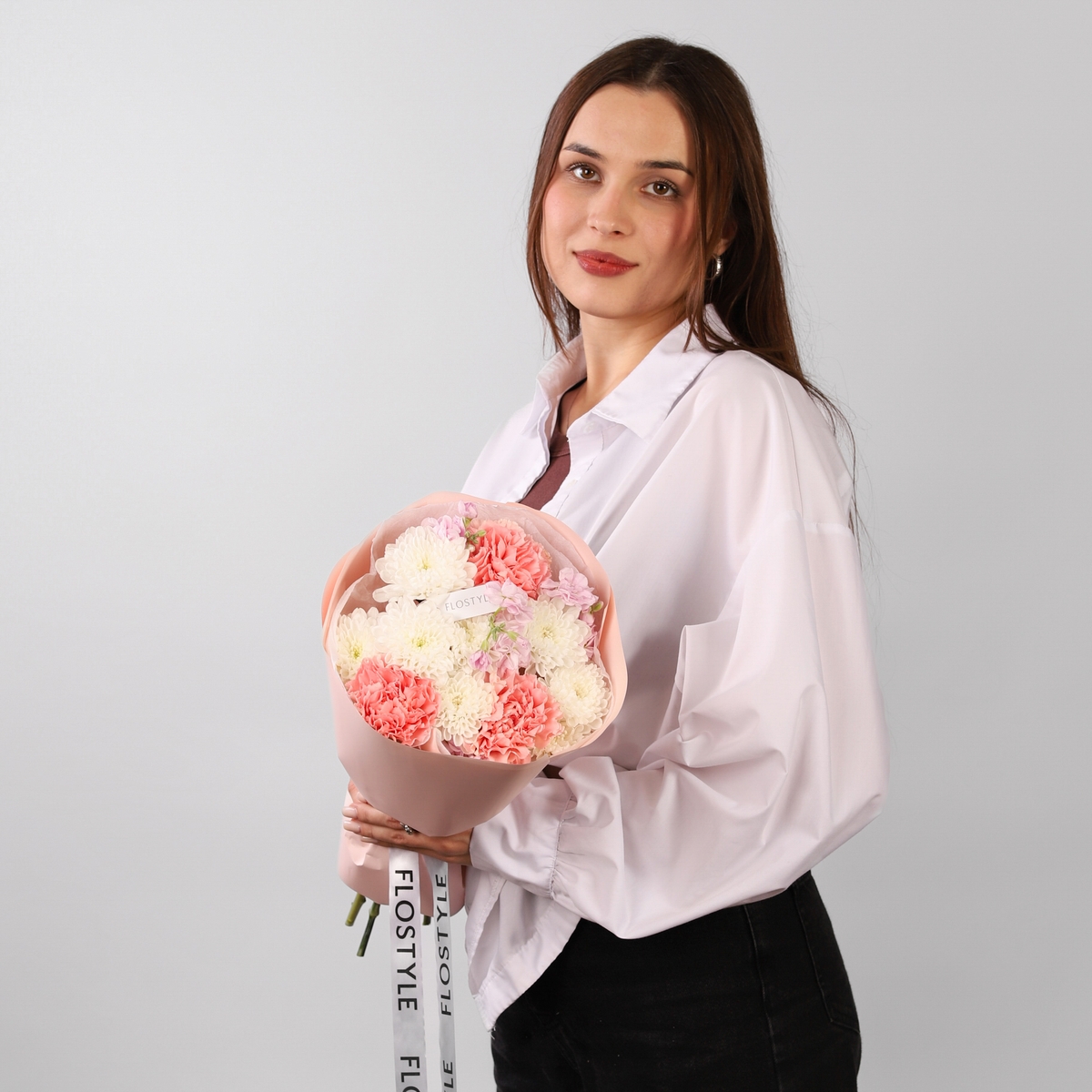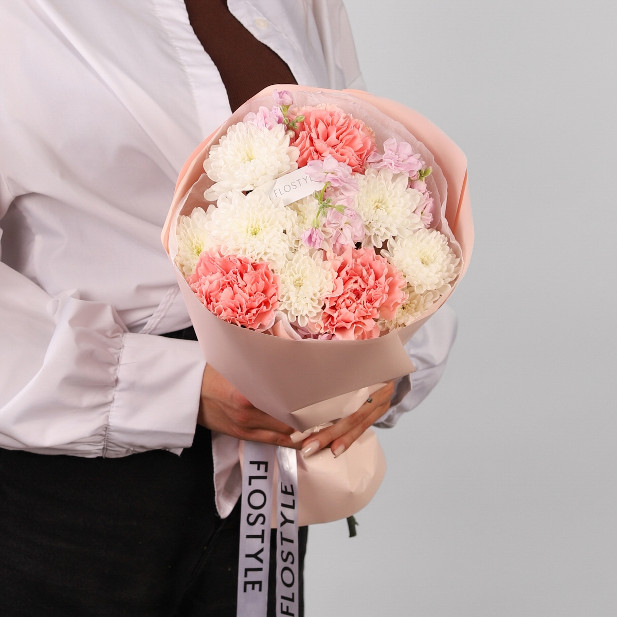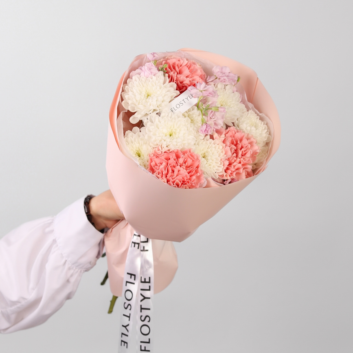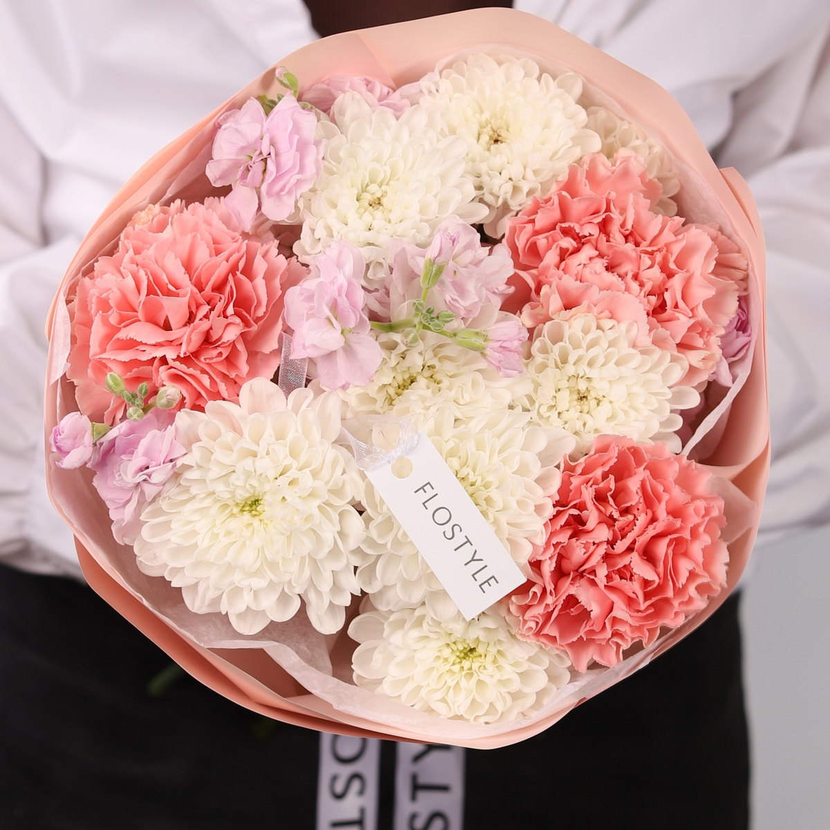 Состав: Хризантема Altaj - 2 шт, Диантус Pink - 3 шт, Маттиола Pink - 1 шт, Фисташка - 1 шт, Тишью белая, Матовая пленка розовая кругом