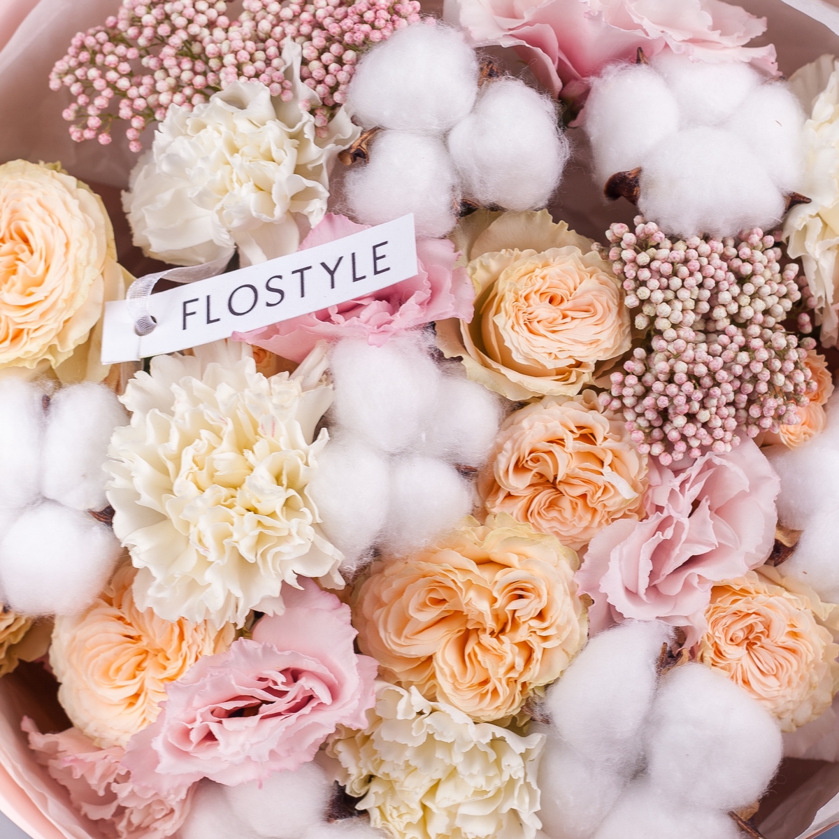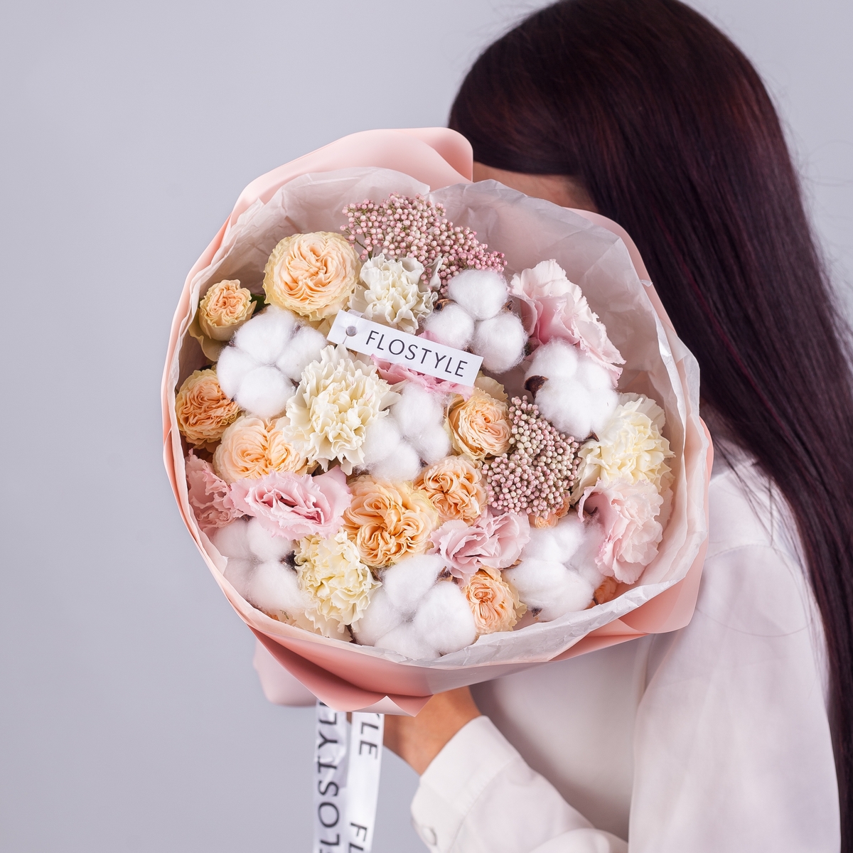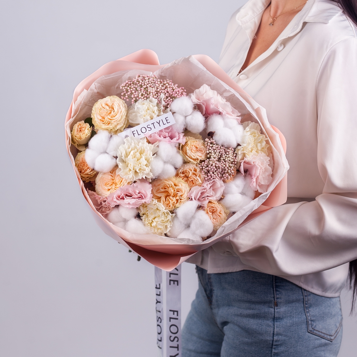 Состав: Роза кустовая Summerrose - 3 шт, Диантус White - 5 шт, Эустома Pink - 2 шт, Озотамнус Pink - 2 шт, Хлопок White - 7 шт, Фисташка - 1 шт, Тишью белая, Матовая пленка розовая кругом