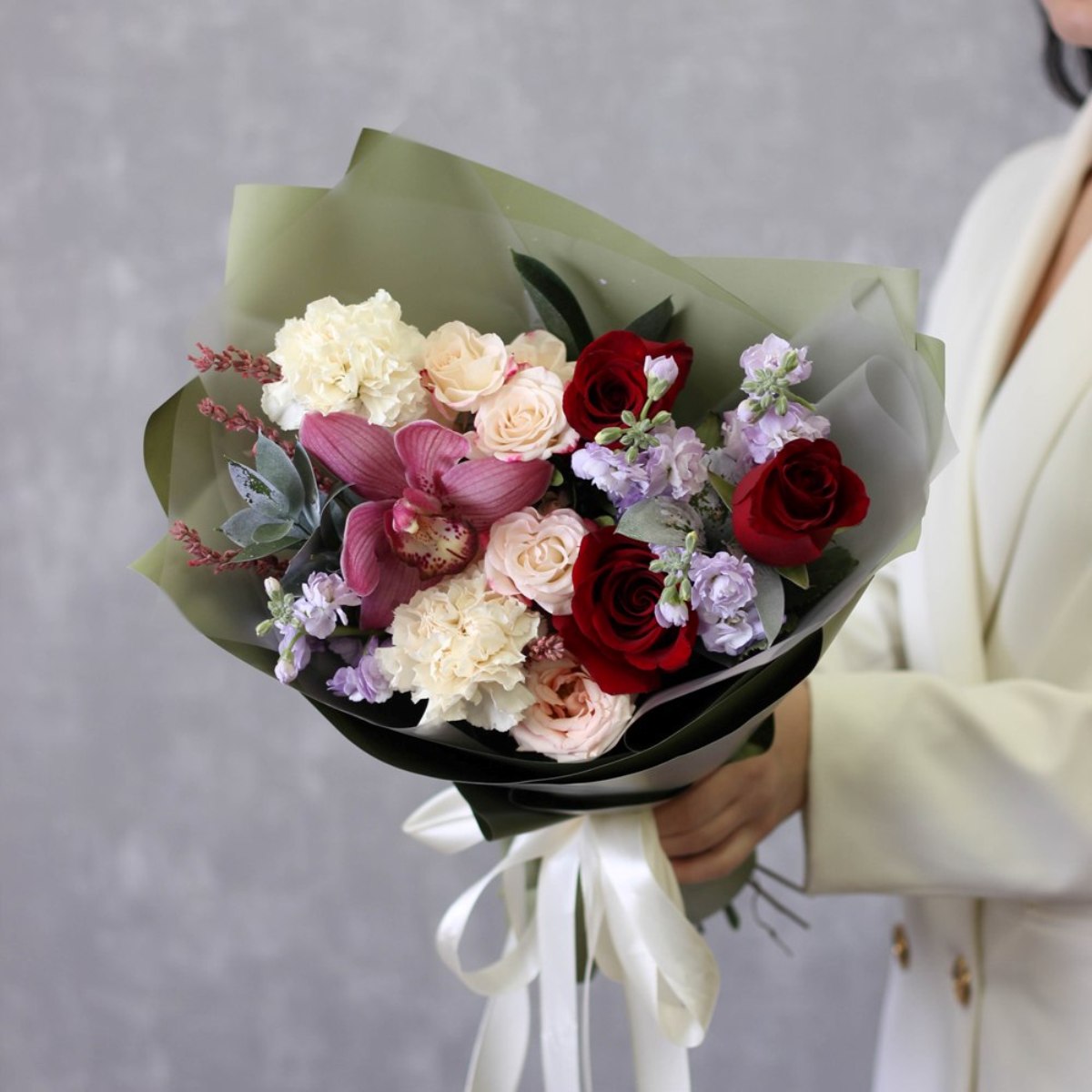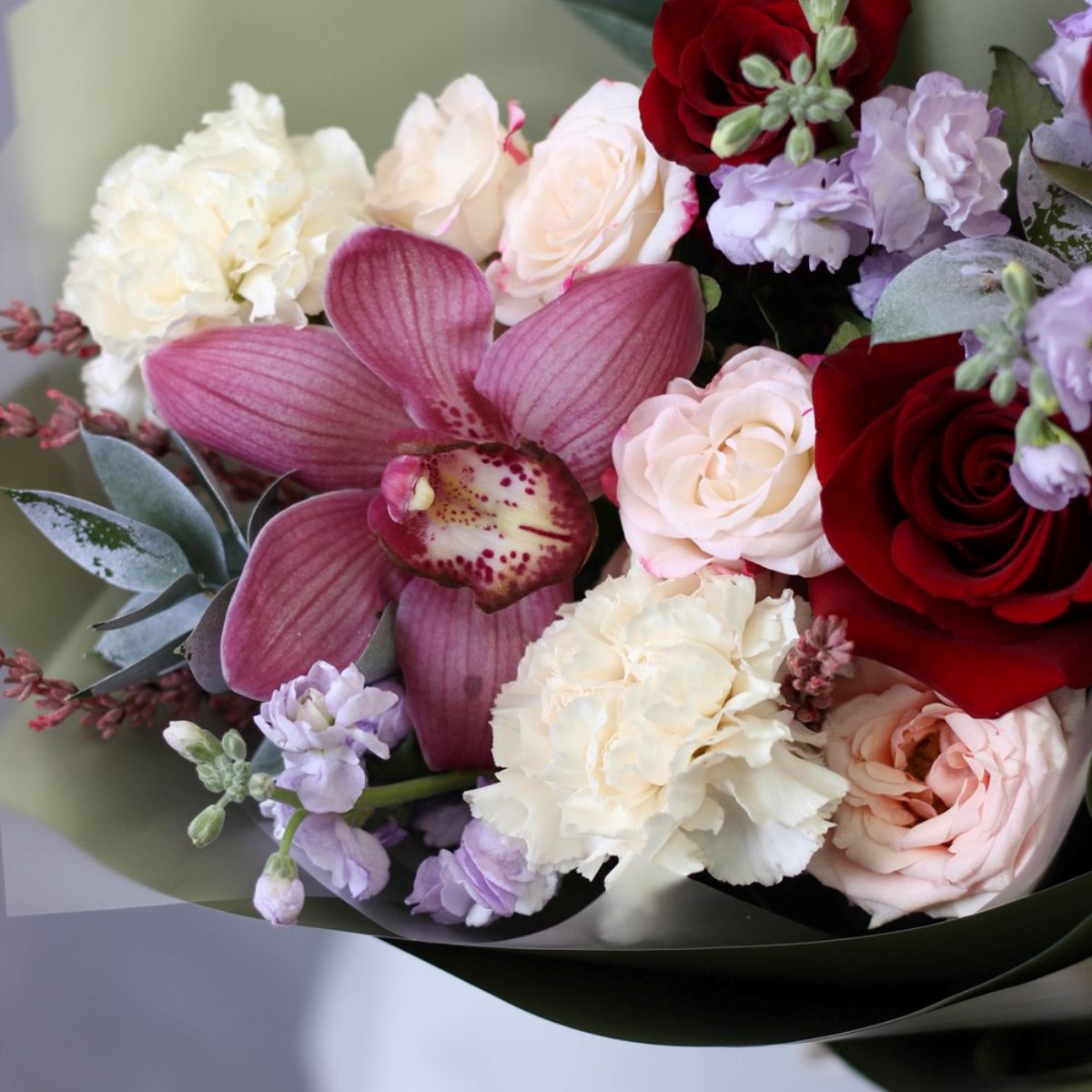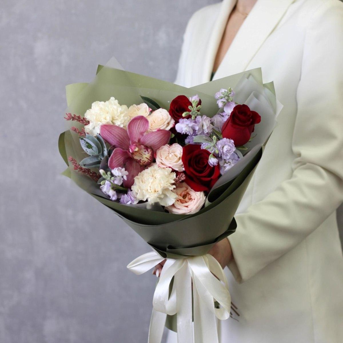 Состав: Орхидея Pink - 1 шт, Роза Explorer - 3 шт, Роза кустовая - 2 шт, Маттиола Pink - 2 шт, Диантус - 2 шт, Лаванда - 5 шт, Рускус - 2 шт, Фисташка - 2 шт, Тишью белое, Матовая пленка хаки ушками
